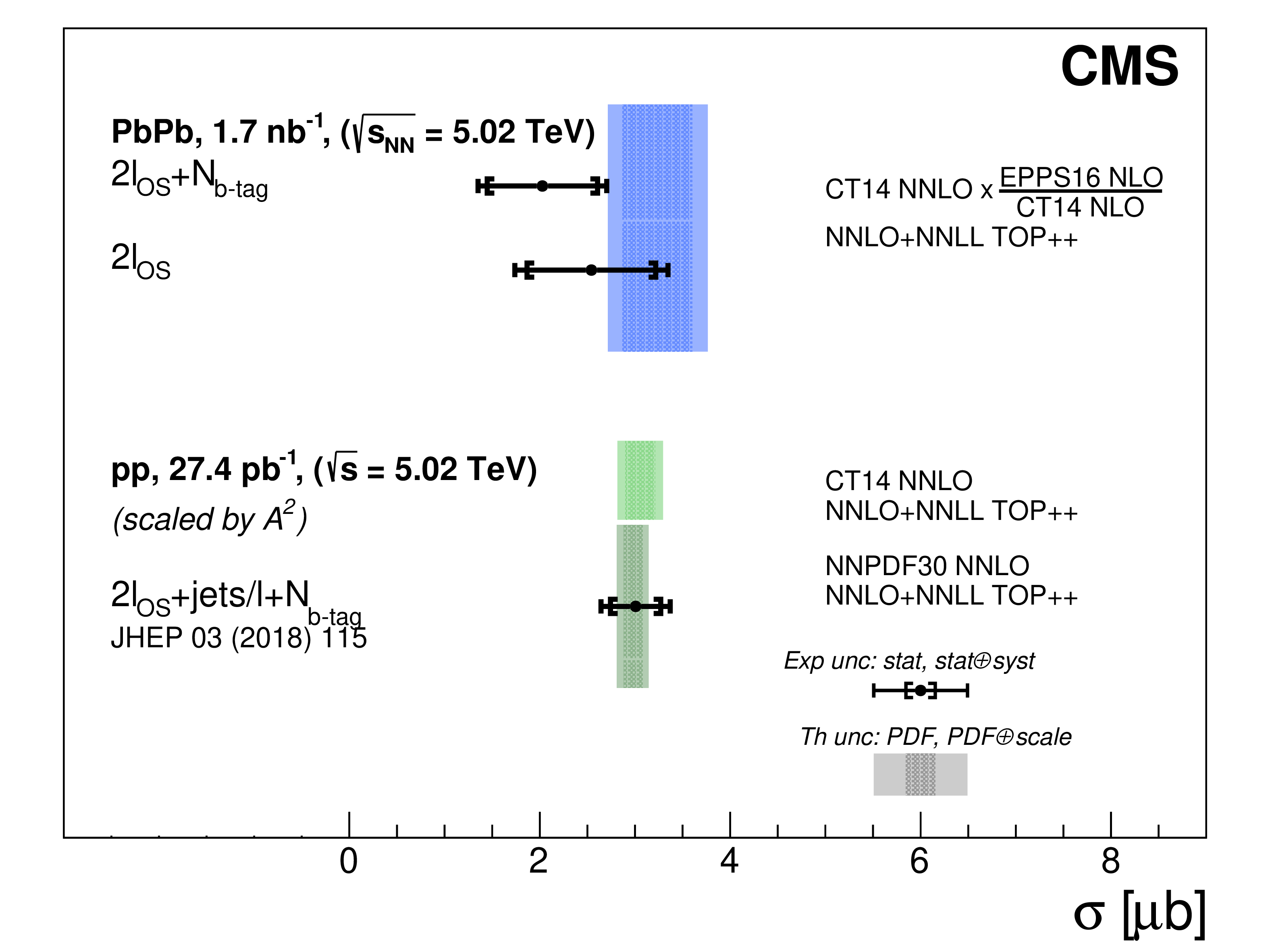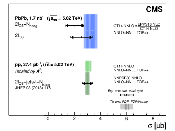 Top quark pair production cross section in pp and pPb collisions as a function of the center-of-mass energy per nucleon pair; the CMS results at different center-of-mass energies in the dilepton and semileptonic channels. The measurements are compared to the NNLO+NNLL QCD theory predictions [172,173,174]. (Figure adapted from Ref. [171].) |