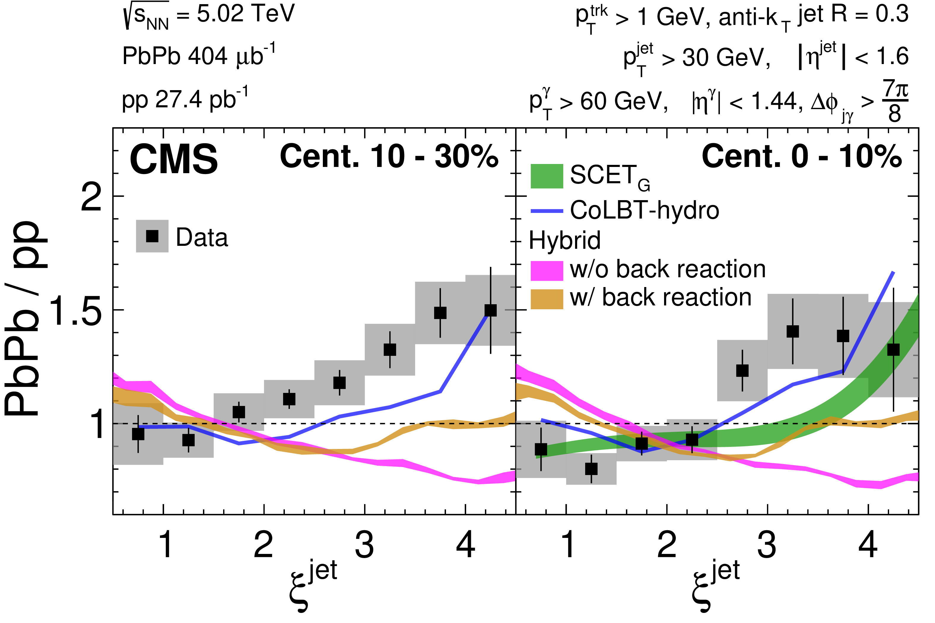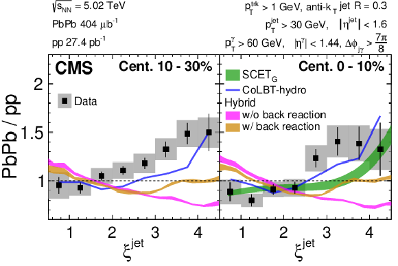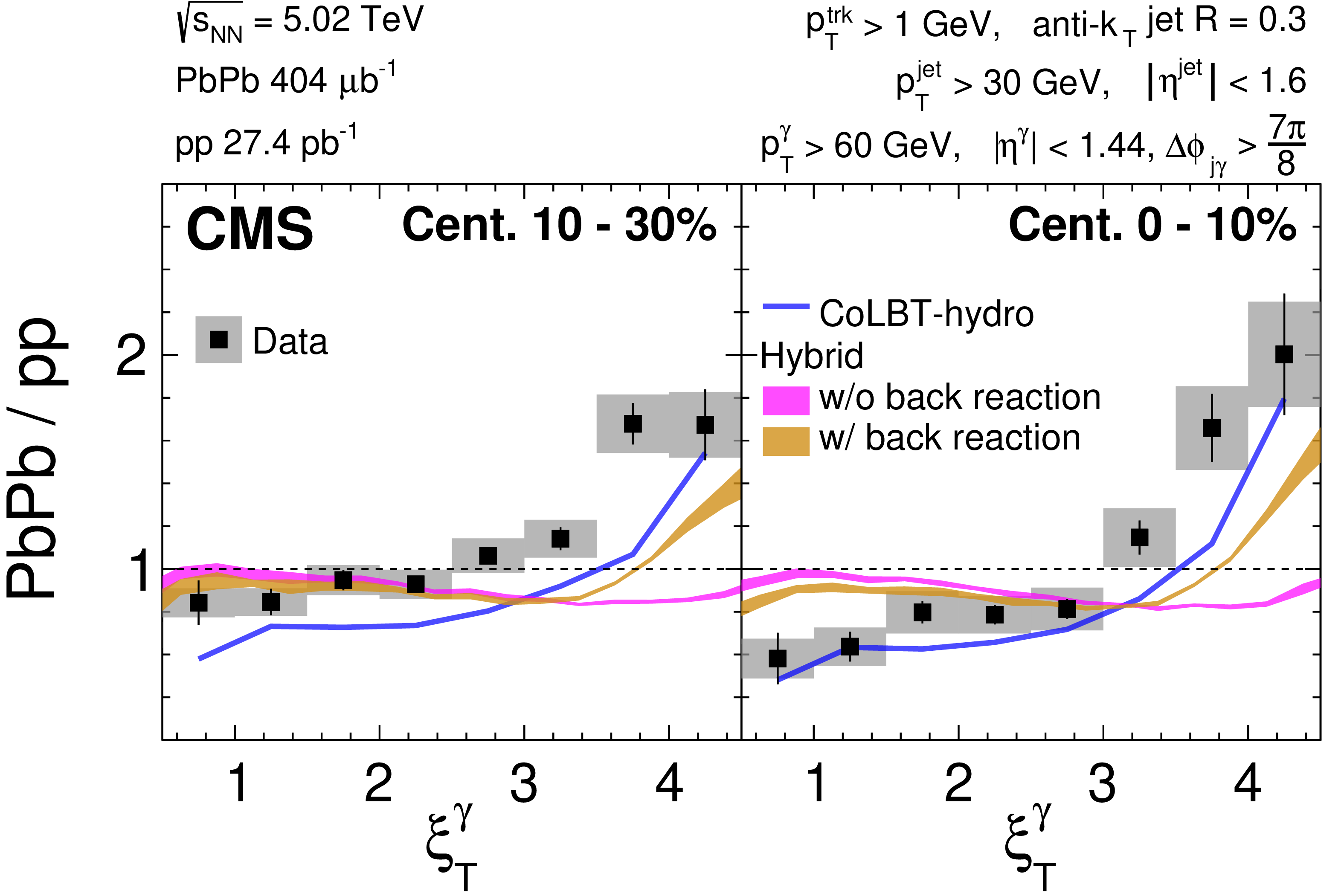 The photon $ R_{\mathrm{AA}} $ versus photon $ E_{\mathrm{T}}^{\gamma} $ in four centrality ranges for 5.02 TeV PbPb collisions. The error bars indicate the statistical uncertainties and the systematic uncertainty, excluding $ T_{\mathrm{AA}} $ uncertainties, are shown by the colored boxes. The $ T_{\mathrm{AA}} $ uncertainties are common to all points in a given centrality range, and are indicated by a gray box on the left side of each panel. Similarly, a 2.3% pp collision integrated luminosity uncertainty is shown with a brown box. Figure adapted from Ref. [135] |