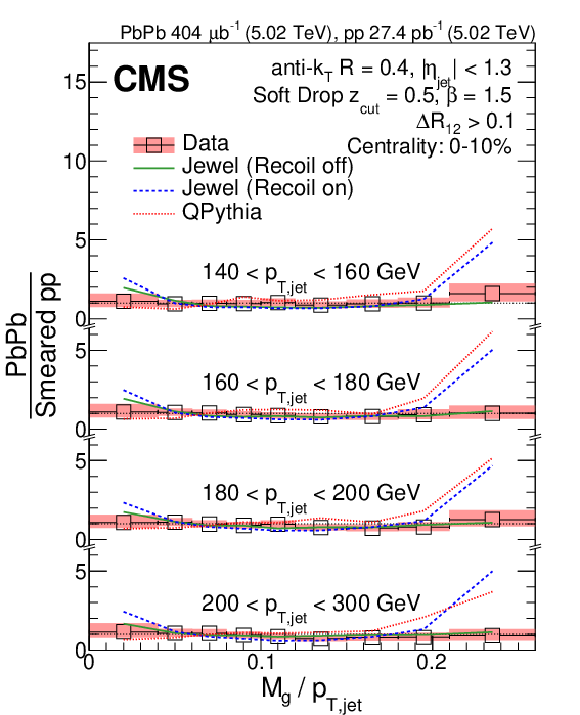 The ratio of theoretical predictions to CMS data for the ratio of the pPb to pp dijet $ \eta $ spectra for 115 $ < p_\mathrm{T}^{\text{ave}} < $ 150 GeV. Theoretical predictions are from the NLO pQCD calculations of DSSZ [175], EPS09 [176], nCTEQ15 [158], and EPPS16 [157] nPDFs, using CT14 [156] as the baseline PDFs. Red boxes indicate the total uncertainties in data and the error bars on the points represent nPDF uncertainties. Figure adapted from Ref. [177] |