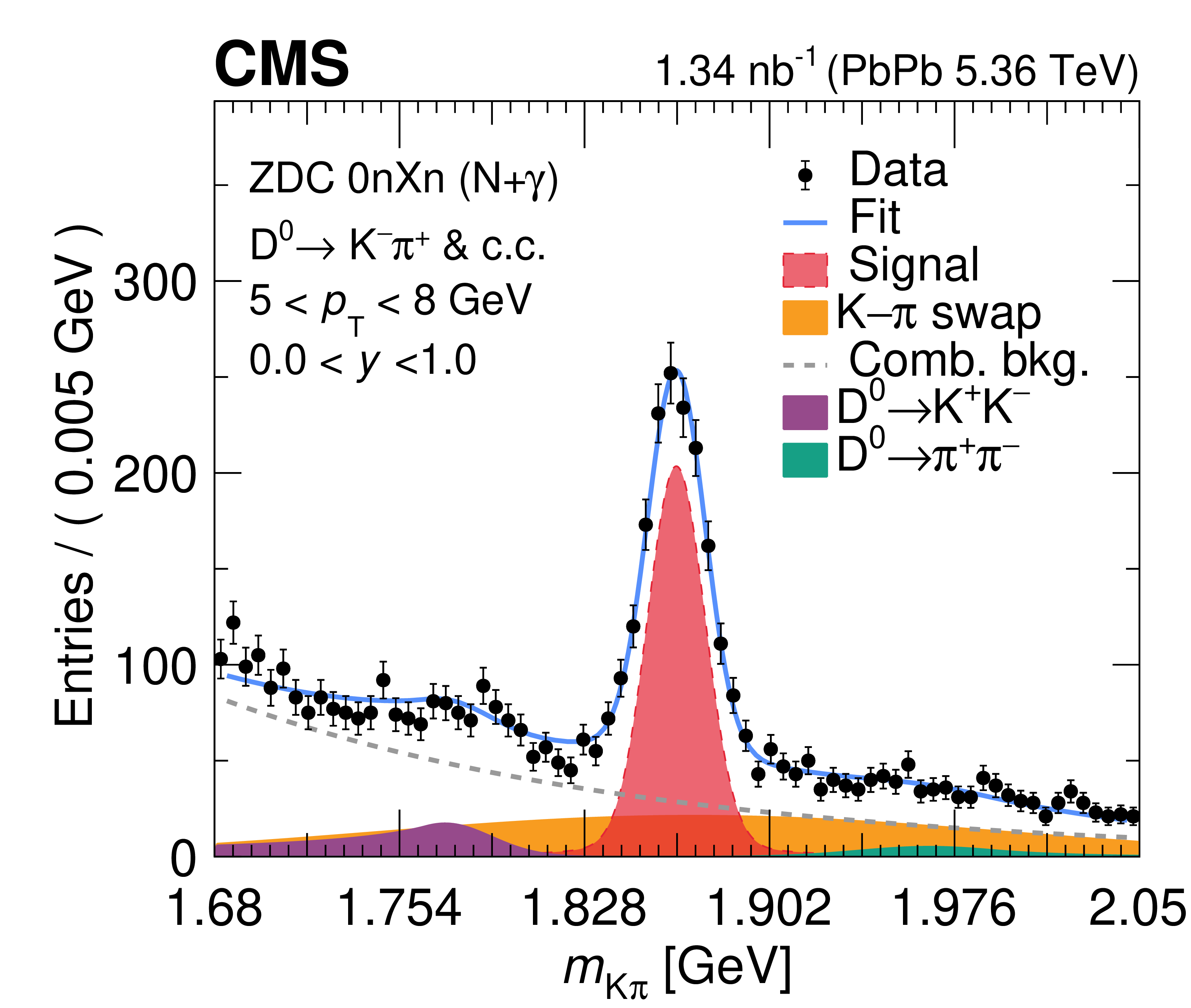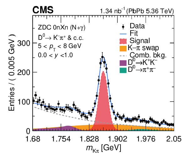 Invariant mass distribution of D$^0$ mesons with 5 $ < p_{\mathrm{T}} < $ 8 GeV and 0.0 $ < y < $ 1.0. The description of the fit template is provided in the text. |