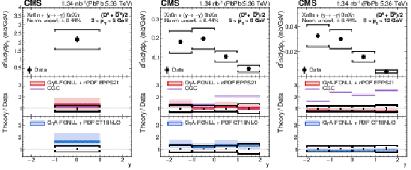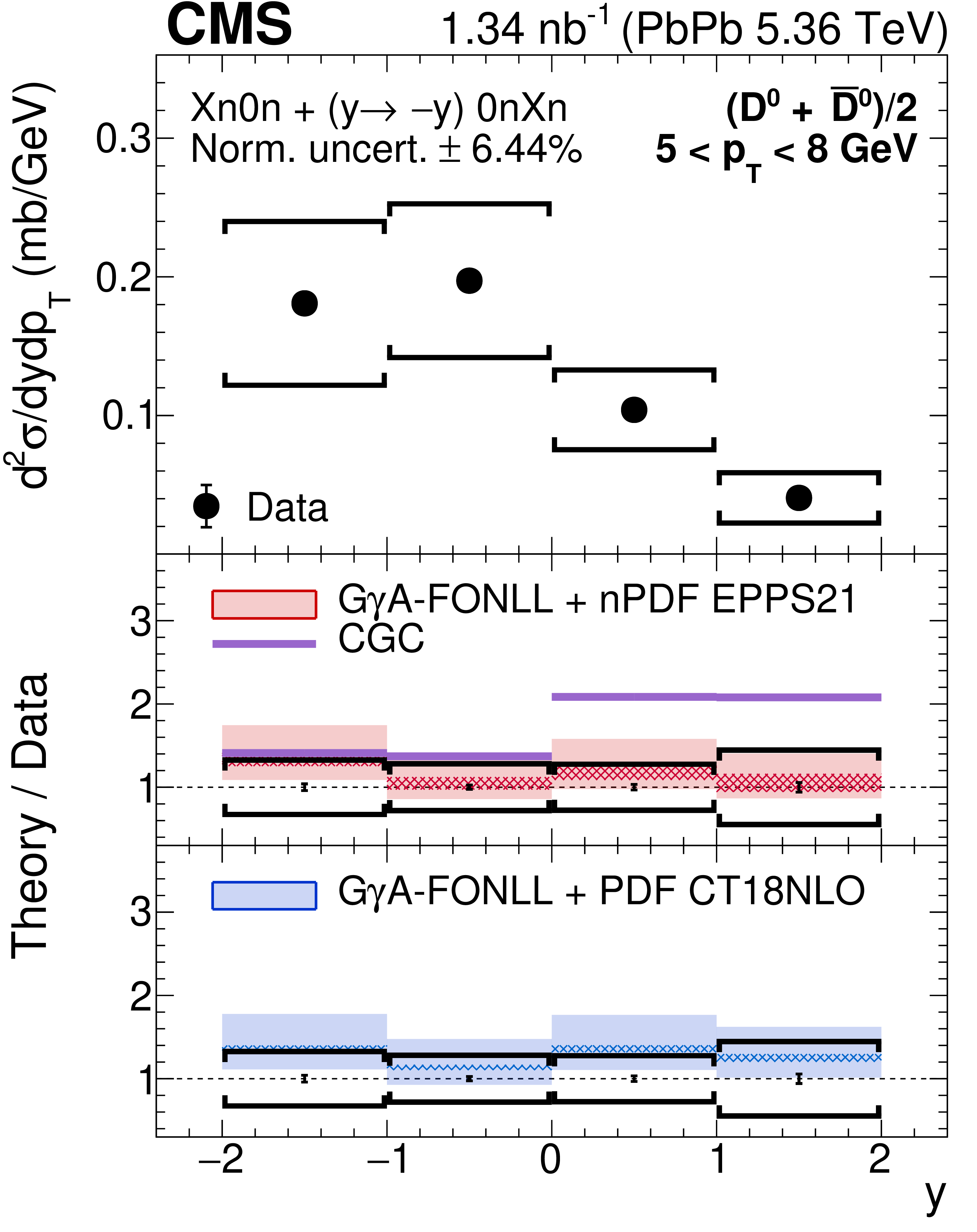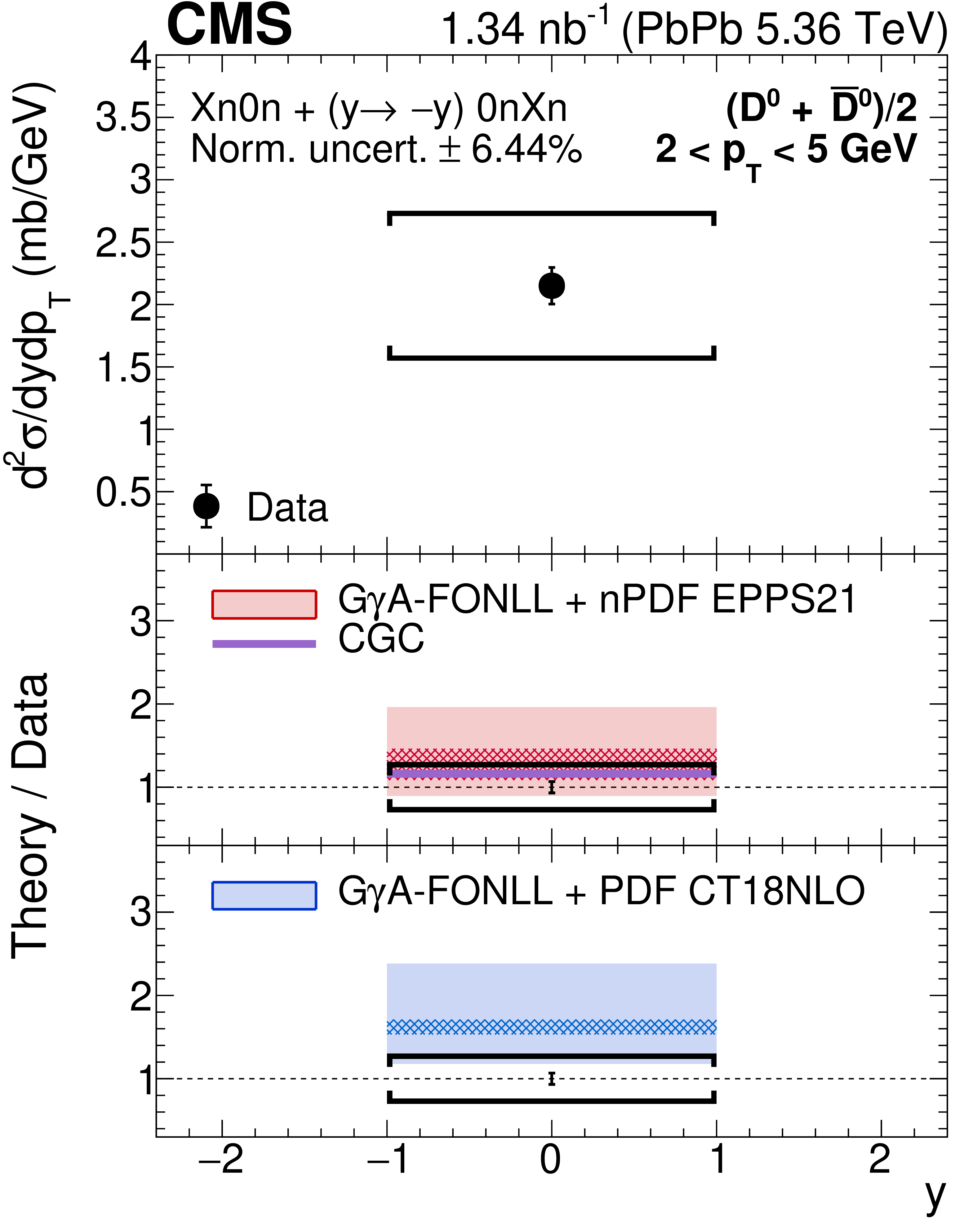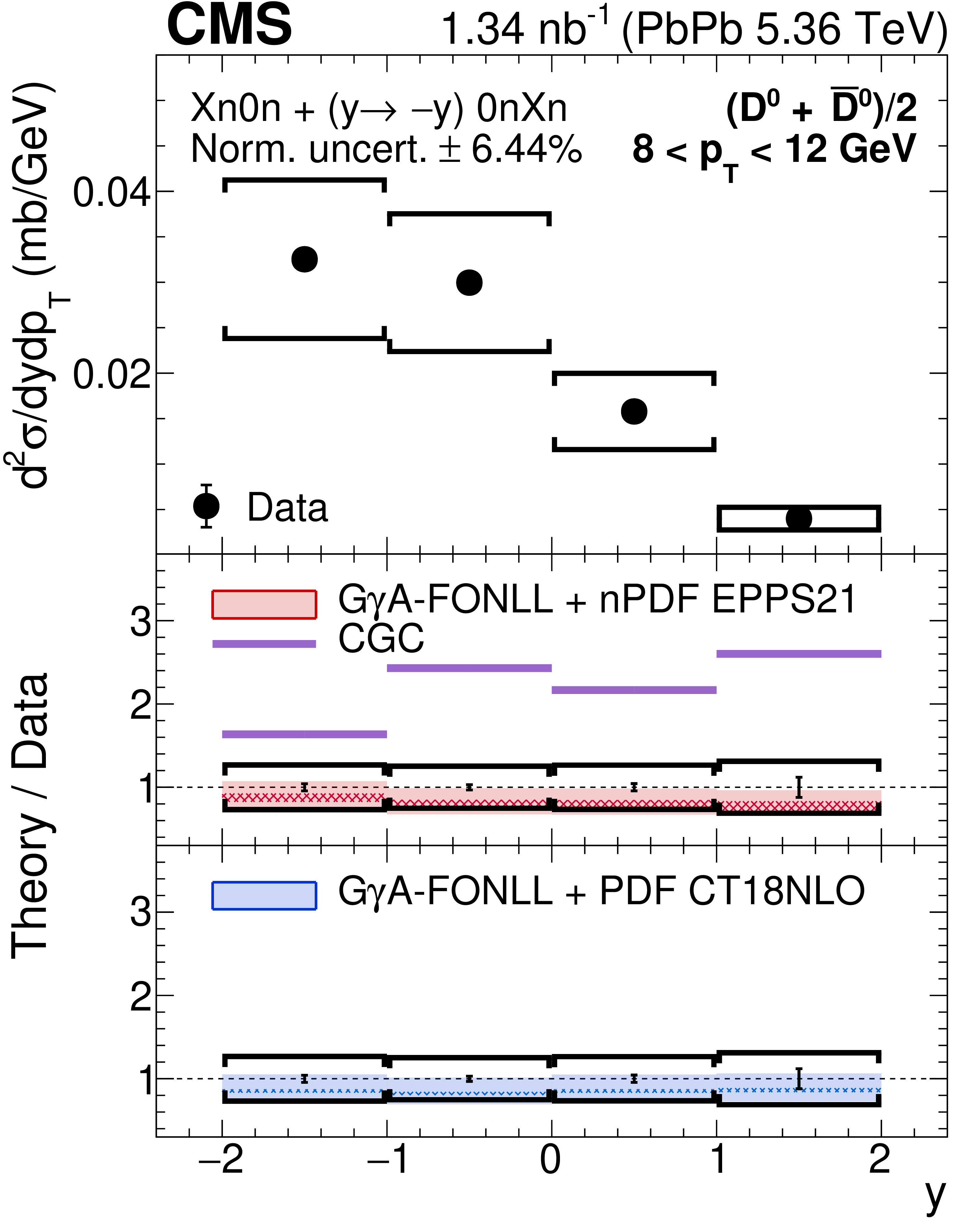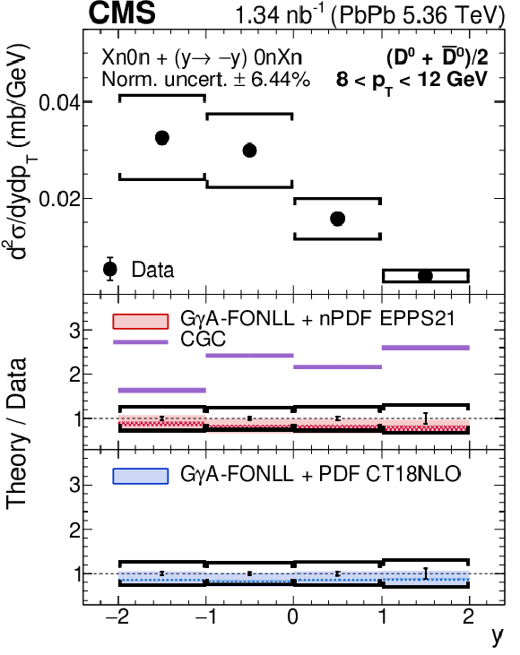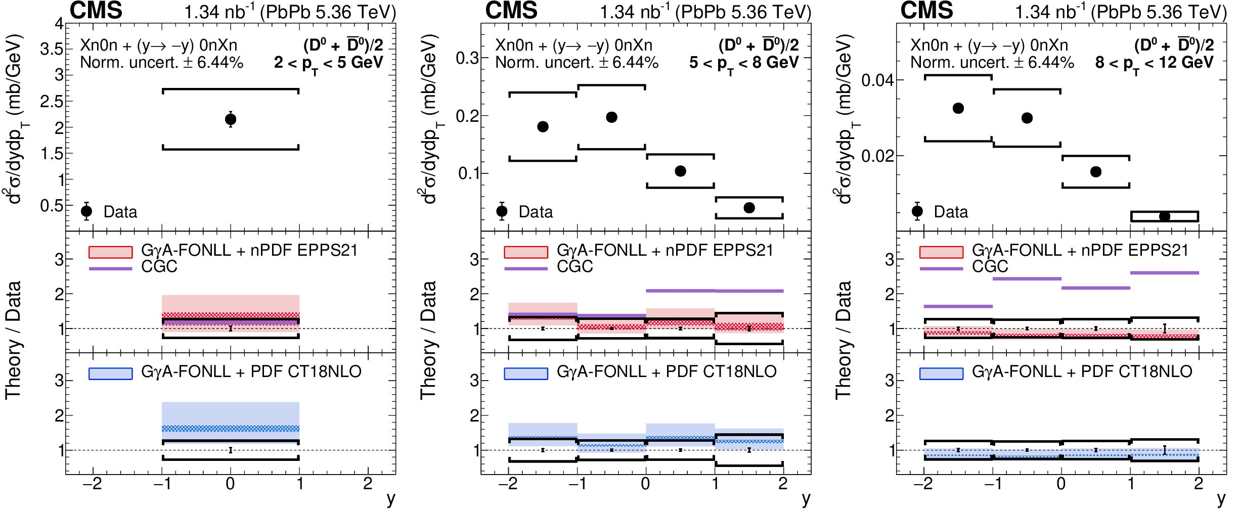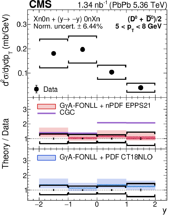 Cross sections for D$^0$ production in $ \gamma\mathrm{N} $ events ($ \mathrm{X}\mathrm{n}0\mathrm{n}+0\mathrm{n}\mathrm{X}\mathrm{n} $) in three $ p_{\mathrm{T}} $ intervals. Vertical bars (brackets) indicate statistical (systematic) uncertainties. Sub-panels show theory-over-data ratios: the middle panel compares G$ \gamma $A-FONLL with EPPS21 lead nPDFs and a CGC calculation [15], while the bottom panel shows G$ \gamma $A-FONLL with CT18NLO proton PDFs. Light-shaded bands reflect scale variations, hatched bands represent PDF and nPDF uncertainties. Vertical bars (brackets) represent statistical (systematic) uncertainties on data. |