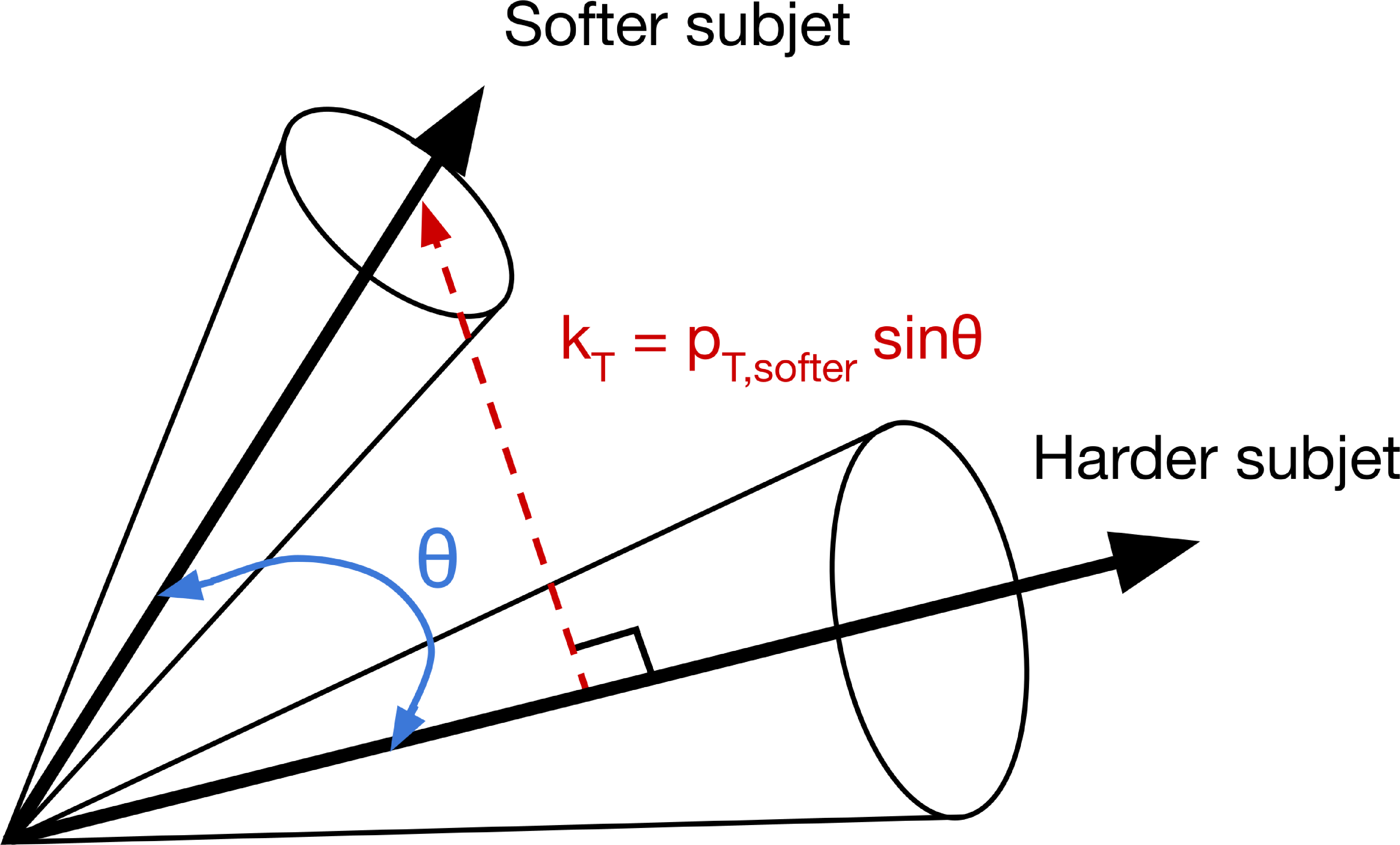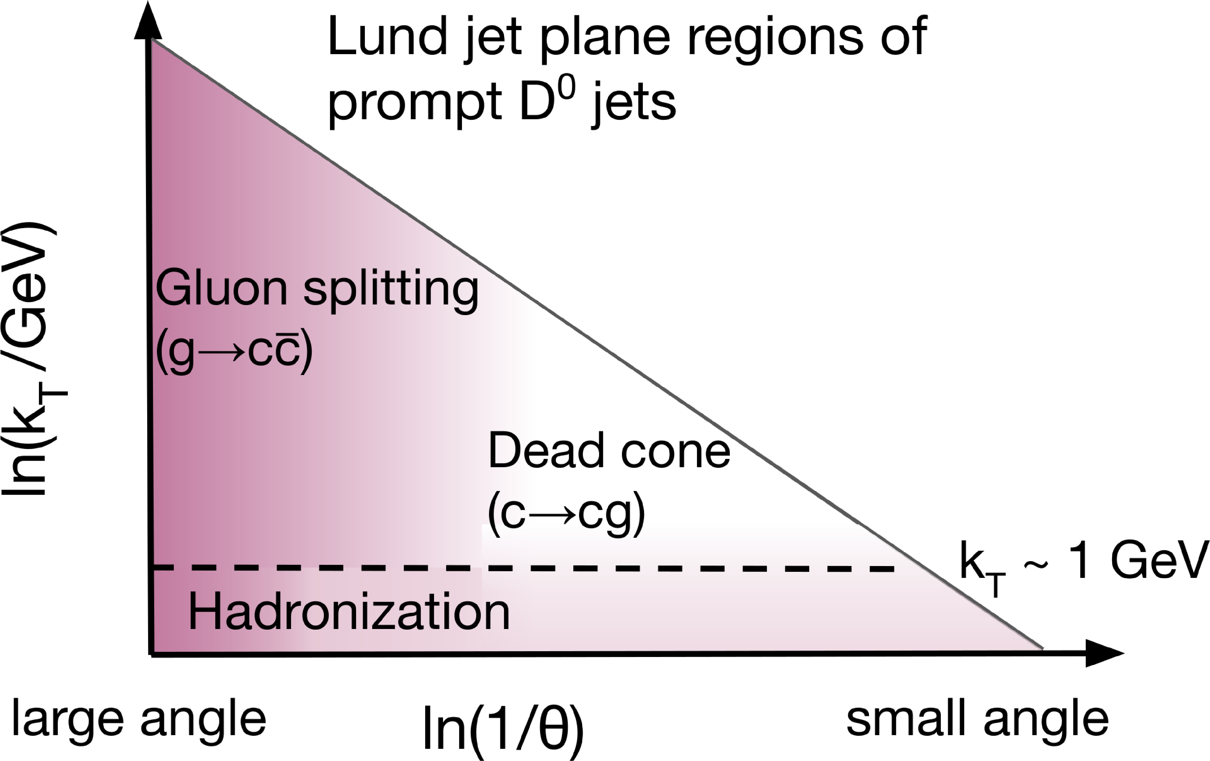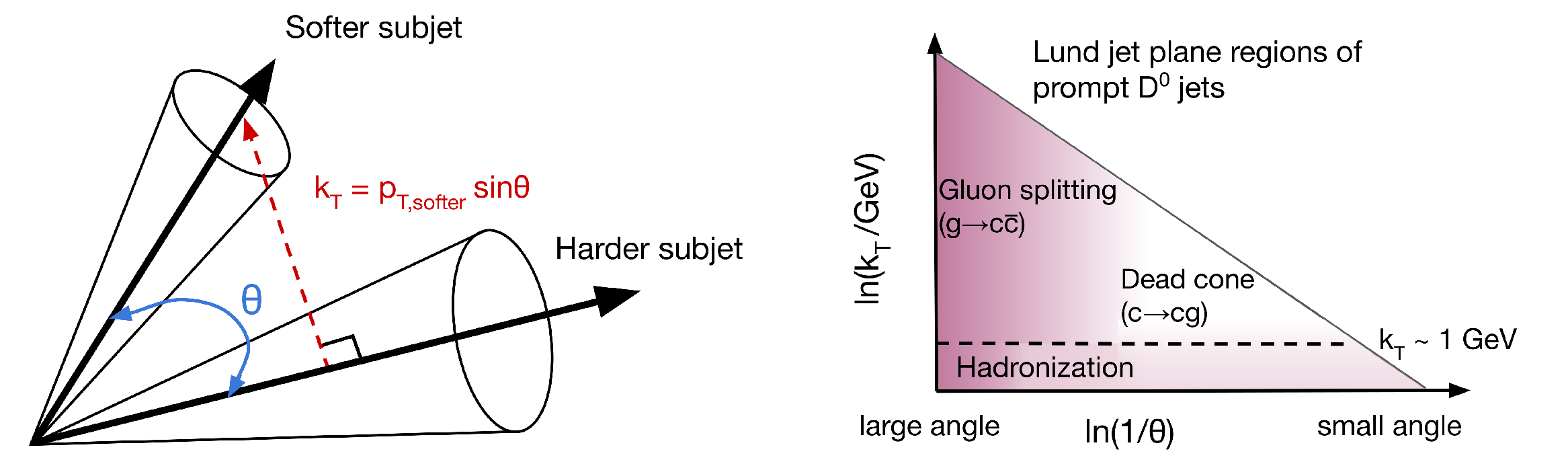 Schematic diagram of two subjets, with their splitting angle $ \theta $ and the relative transverse momentum $ k_{\mathrm{T}} $ of the softer subjet with respect to the harder subjet (left). Different Lund jet plane regions for charm quark jet showers (right), where the vertical axis is the logarithm of the relative momentum $ k_{\mathrm{T}} $ of the emission and horizontal axis is the logarithm of the angle between the emission and the emitter $ \theta $. The shading represents the density of emissions in the primary Lund jet plane for c quark jets |