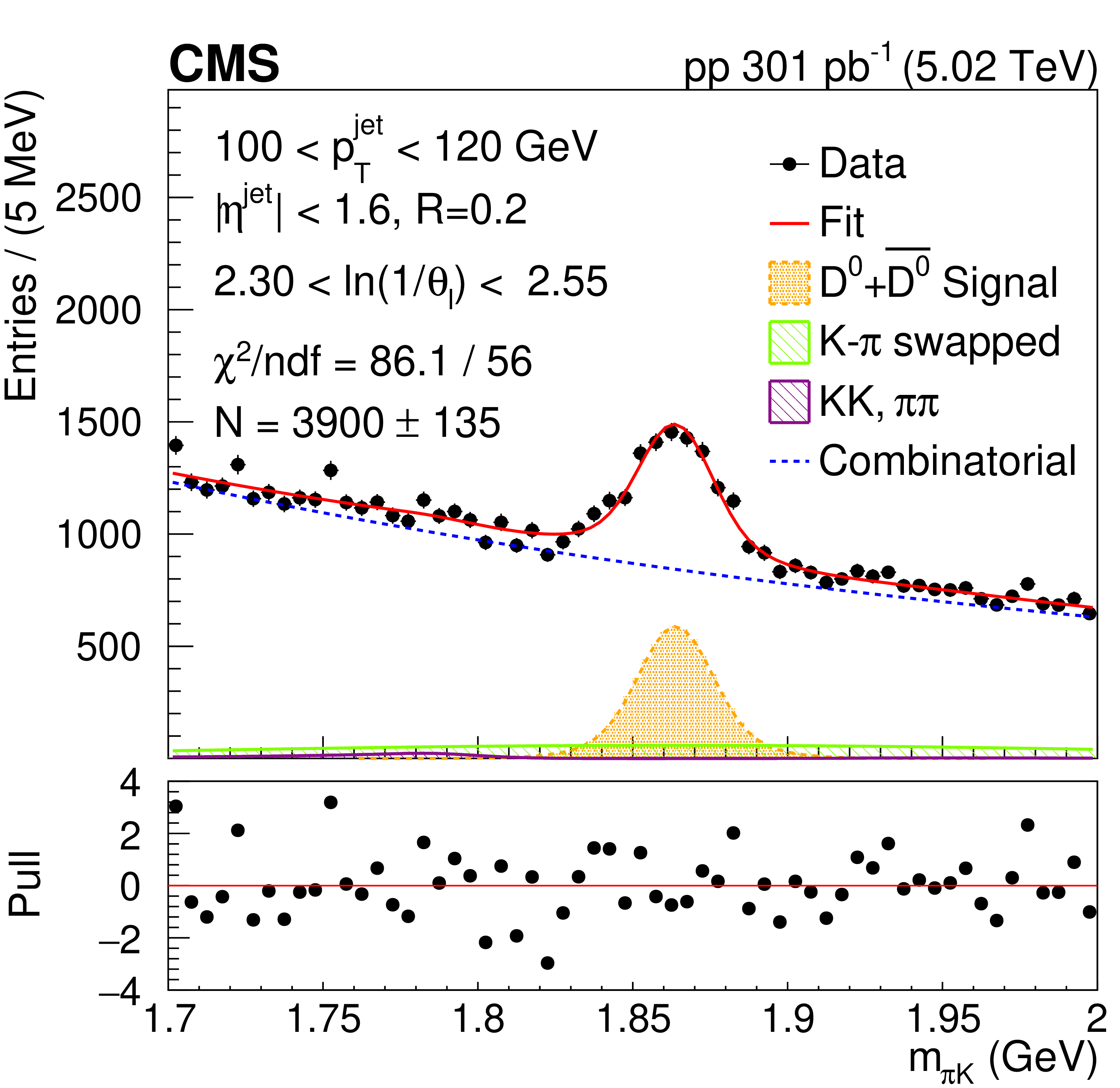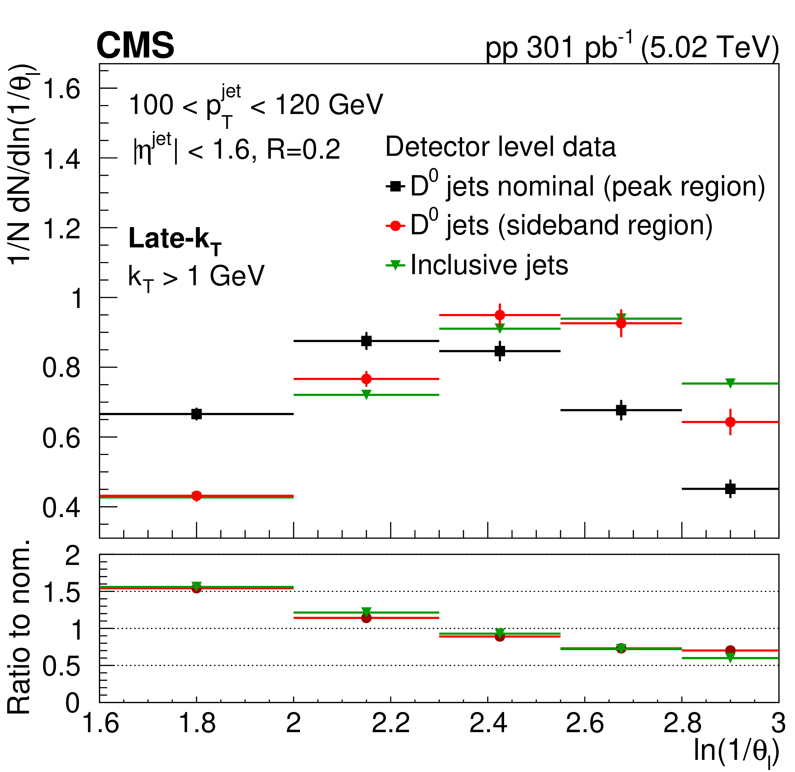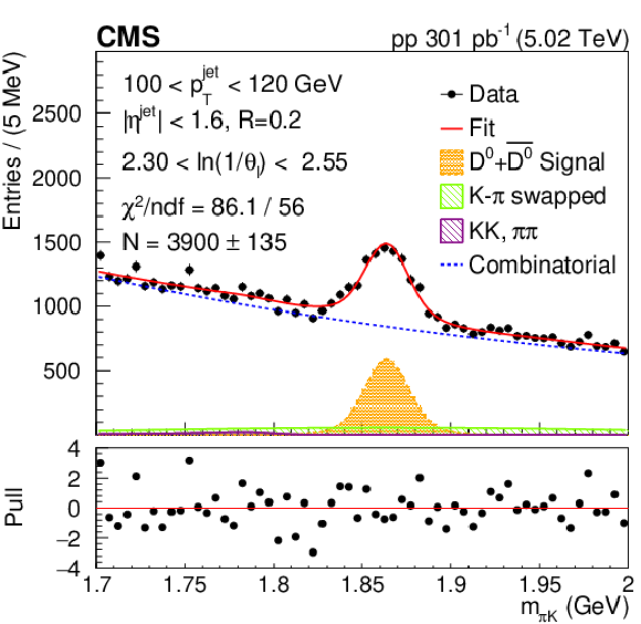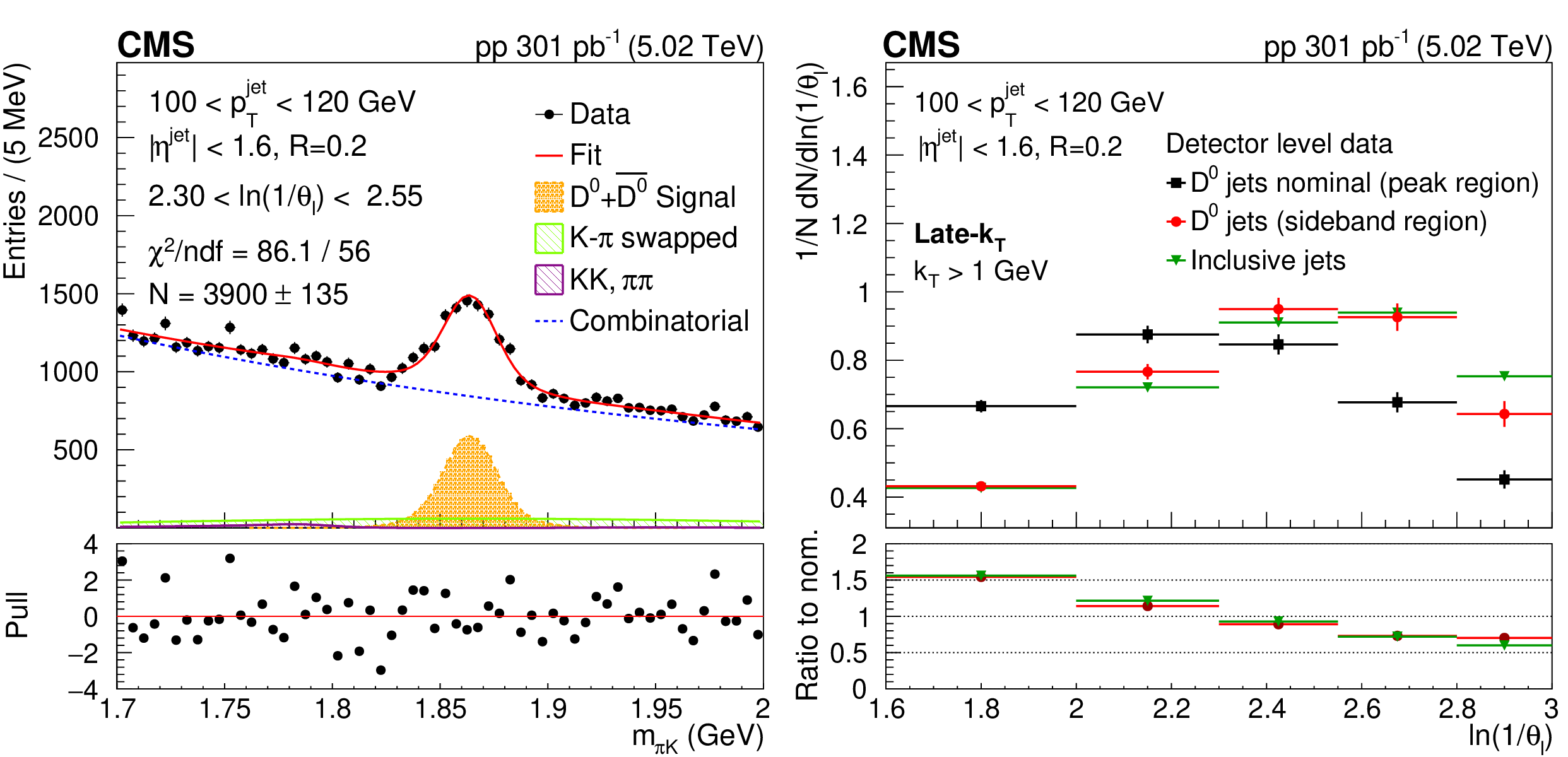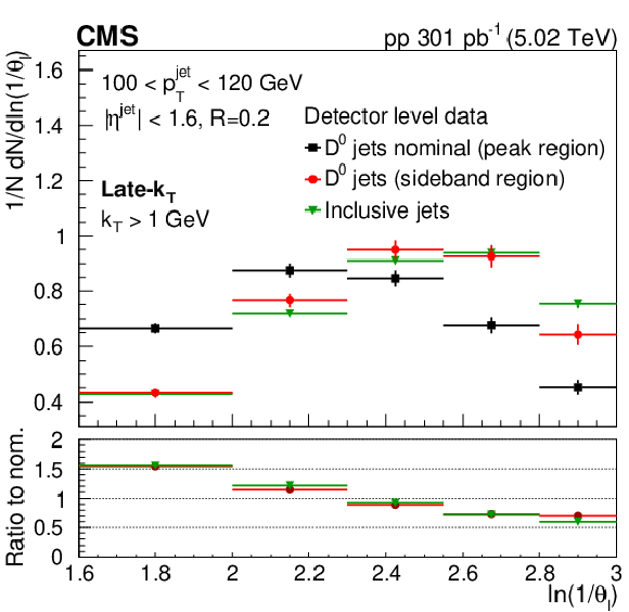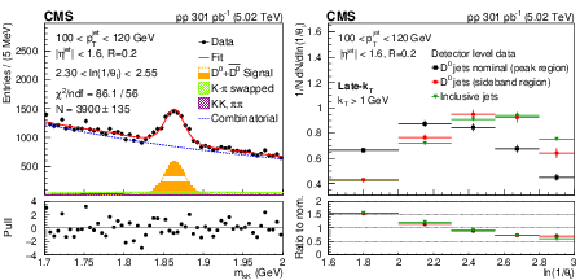 Invariant mass distribution of particle pairs for $ \mathrm{D^0} $ jet candidates and fits for late-$ k_{\mathrm{T}} $ for splitting angle and jet momentum in the range: 2.3 $ < \theta_{\text{l}} < $ 2.55 and 100 $ < p_{\mathrm{T}}^{\text{jet}} < $ 120 GeV (left). Comparison of the ln(1/$ \theta_{\text{l}} $ ) distributions for invariant mass of the track pairs in the resonance region (black rectangles), in the mass sideband region 0.07 $ < |m_{\pi K} -m^D_{PDG}| < $ 0.12 GeV (red circles) and for inclusive jet data (green triangles)(right). In the lower panel, a ratio to nominal signal is shown. The error bands represent the statistical uncertainties. The ndf is number of degree of freedom. |