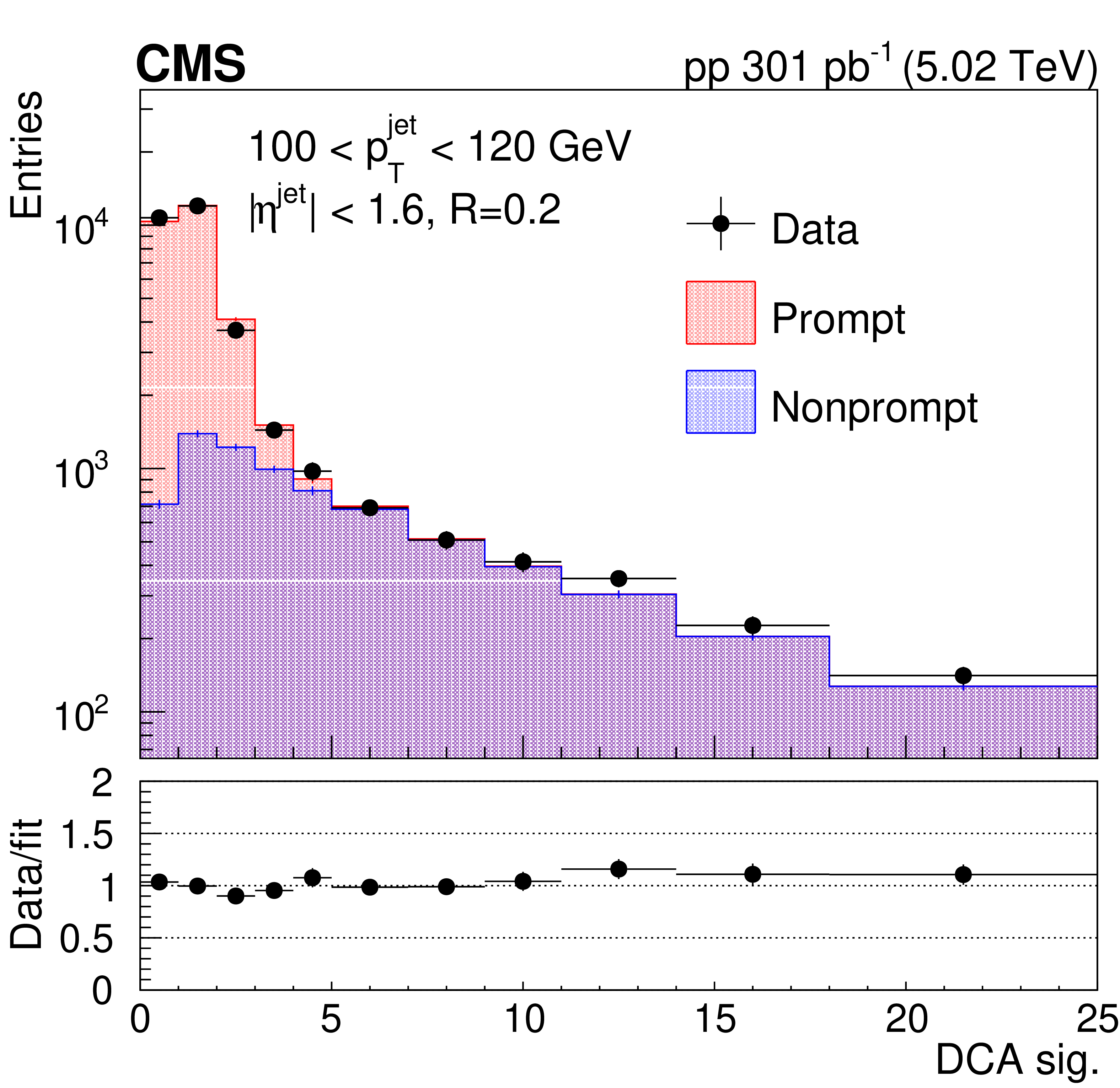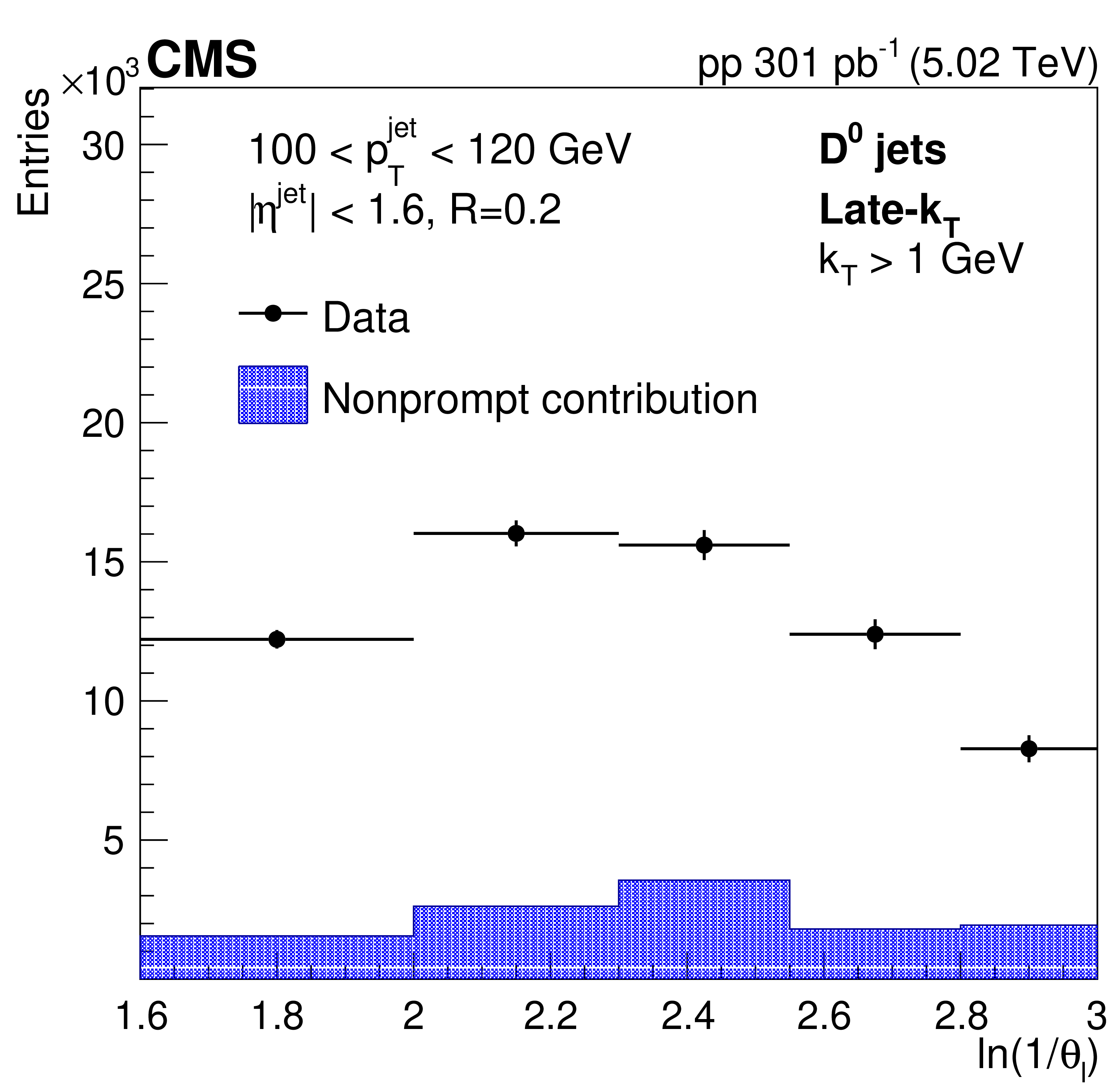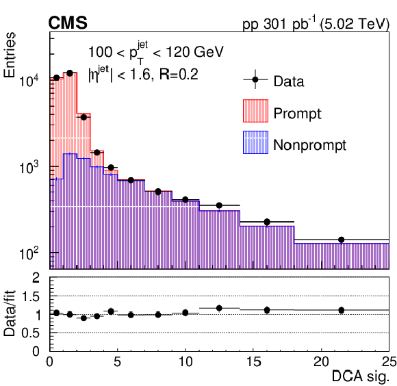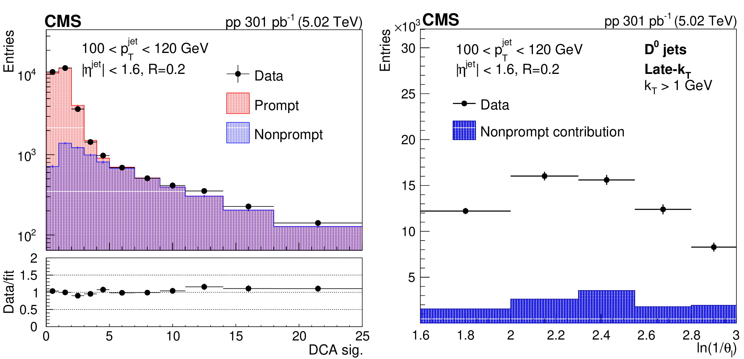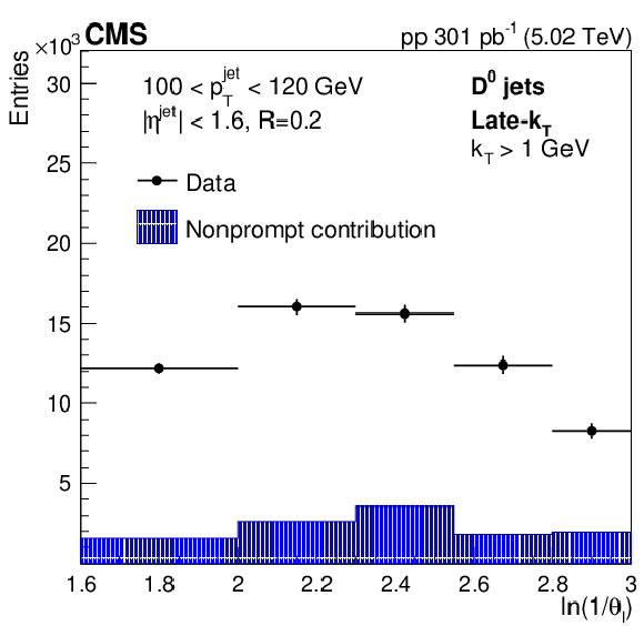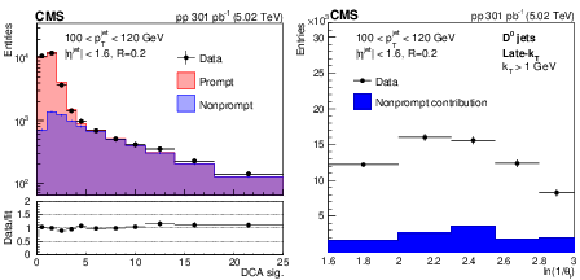 Detector-level DCA significance distribution in data fitted with PYTHIA8 CP5 templates for prompt and nonprompt $ \mathrm{D^0} $ mesons contained in jets (left). In the lower panel, the ratio between the data and the fit values is presented. Measured $ \mathrm{D^0} $ meson yield (black circles) and nonprompt $ \mathrm{D^0} $ meson contribution (filled histogram) as functions of the late-$ k_{\mathrm{T}} $ splitting angle $ \theta_{\text{l}} $ (right). |