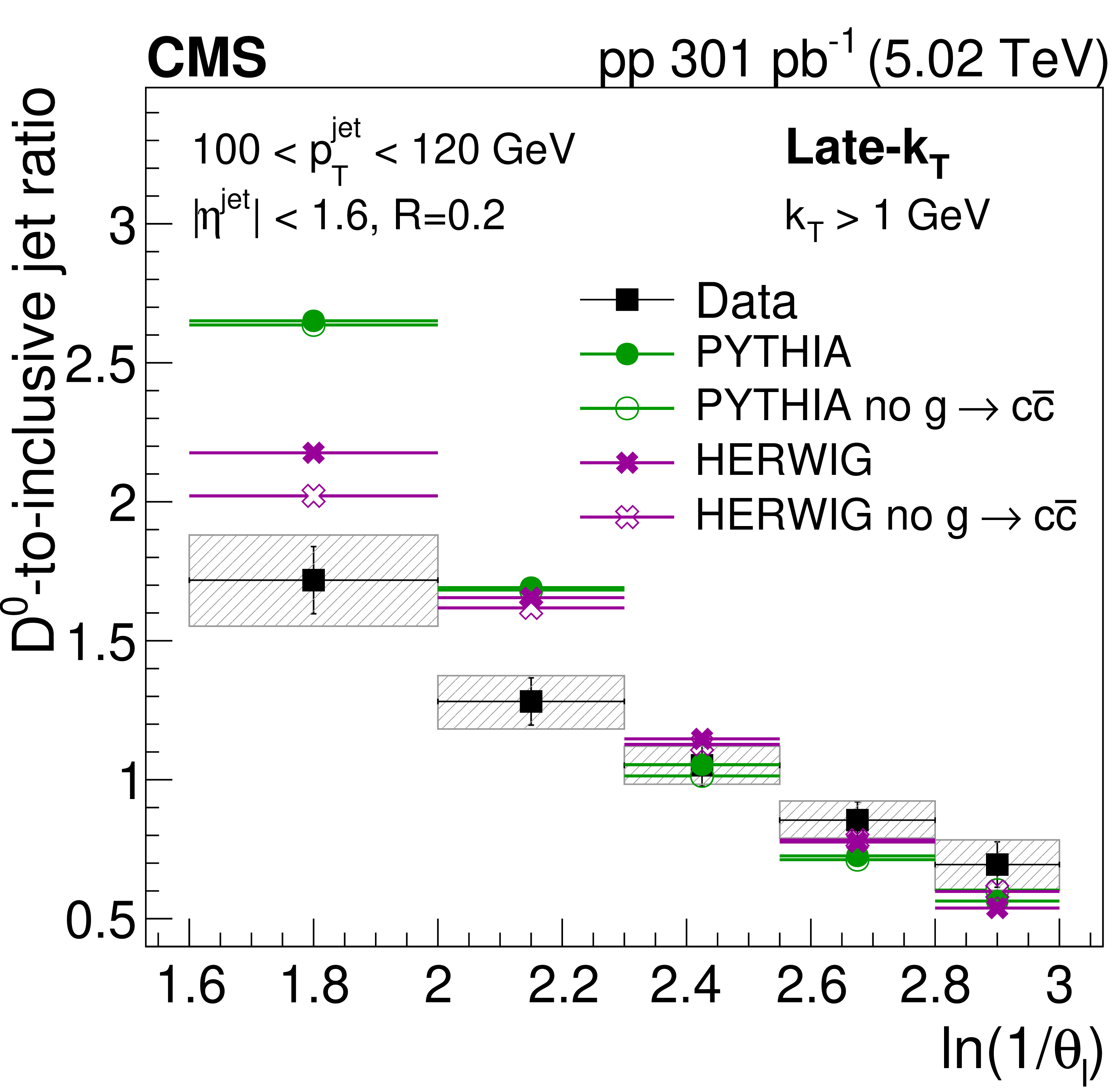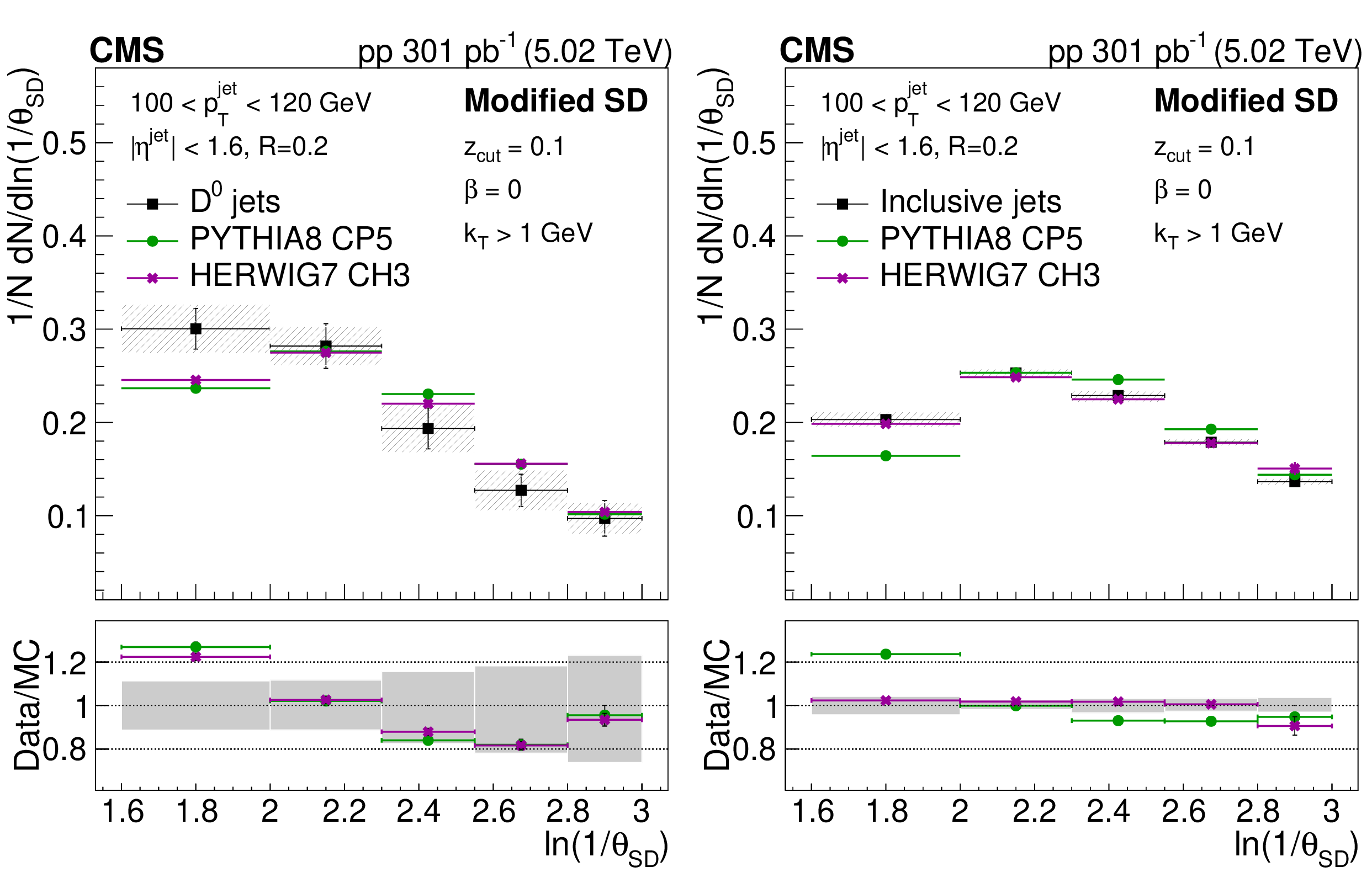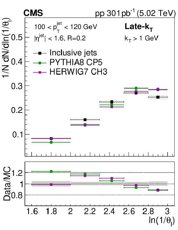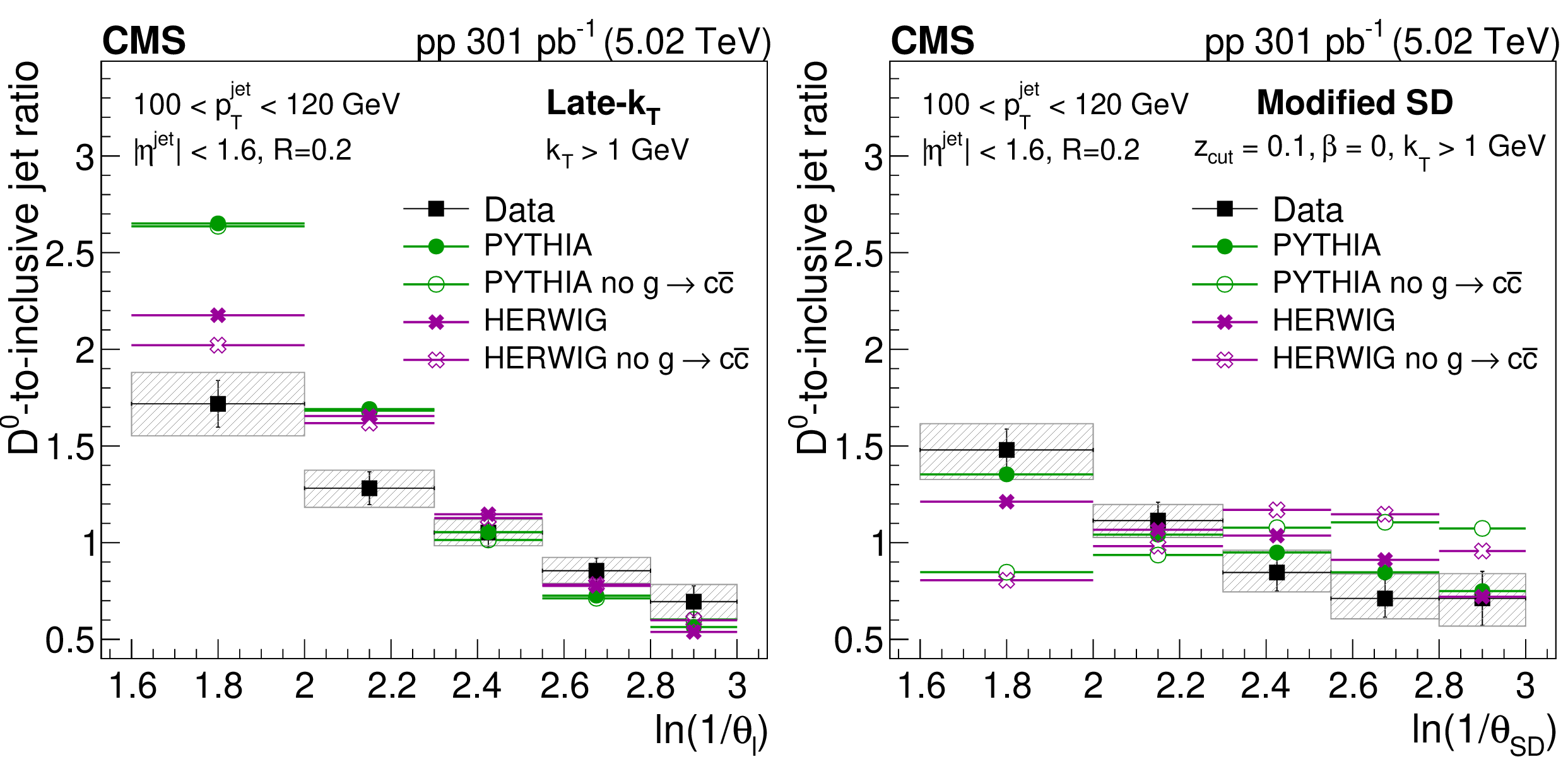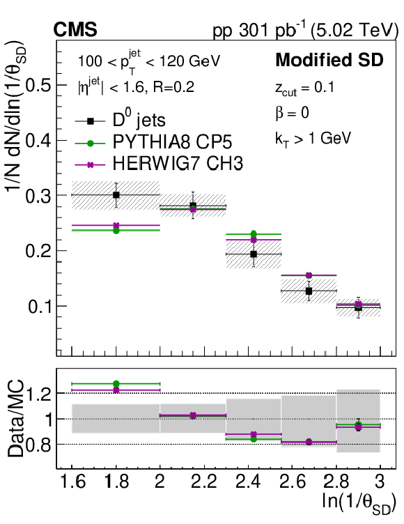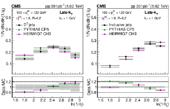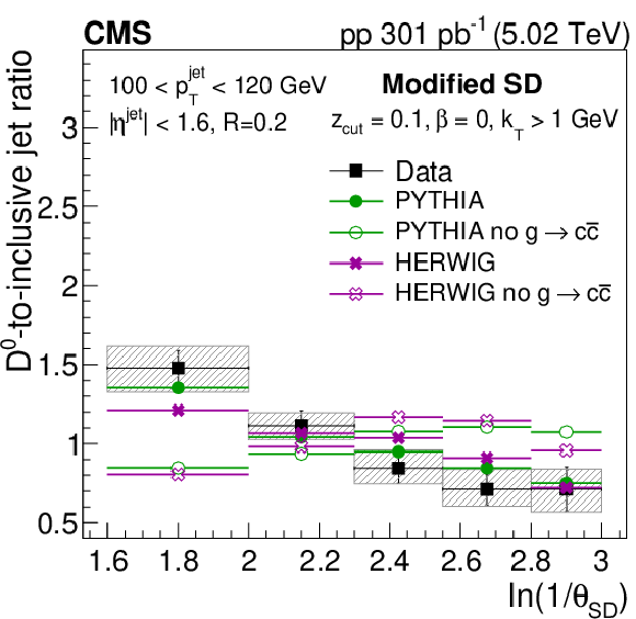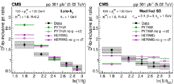 The ratio of the late-$ k_{\mathrm{T}} $ (left) and SD (right) angle distributions for prompt $ \mathrm{D^0} $ jets to inclusive jets. The data are compared to PYTHIA8 CP5 and HERWIG 7 CH3 predictions with and without g$ \to \mathrm{c} \overline{\mathrm{c}} $. The error boxes represents the total systematic uncertainty, whereas the vertical bars represent the statistical uncertainties. |