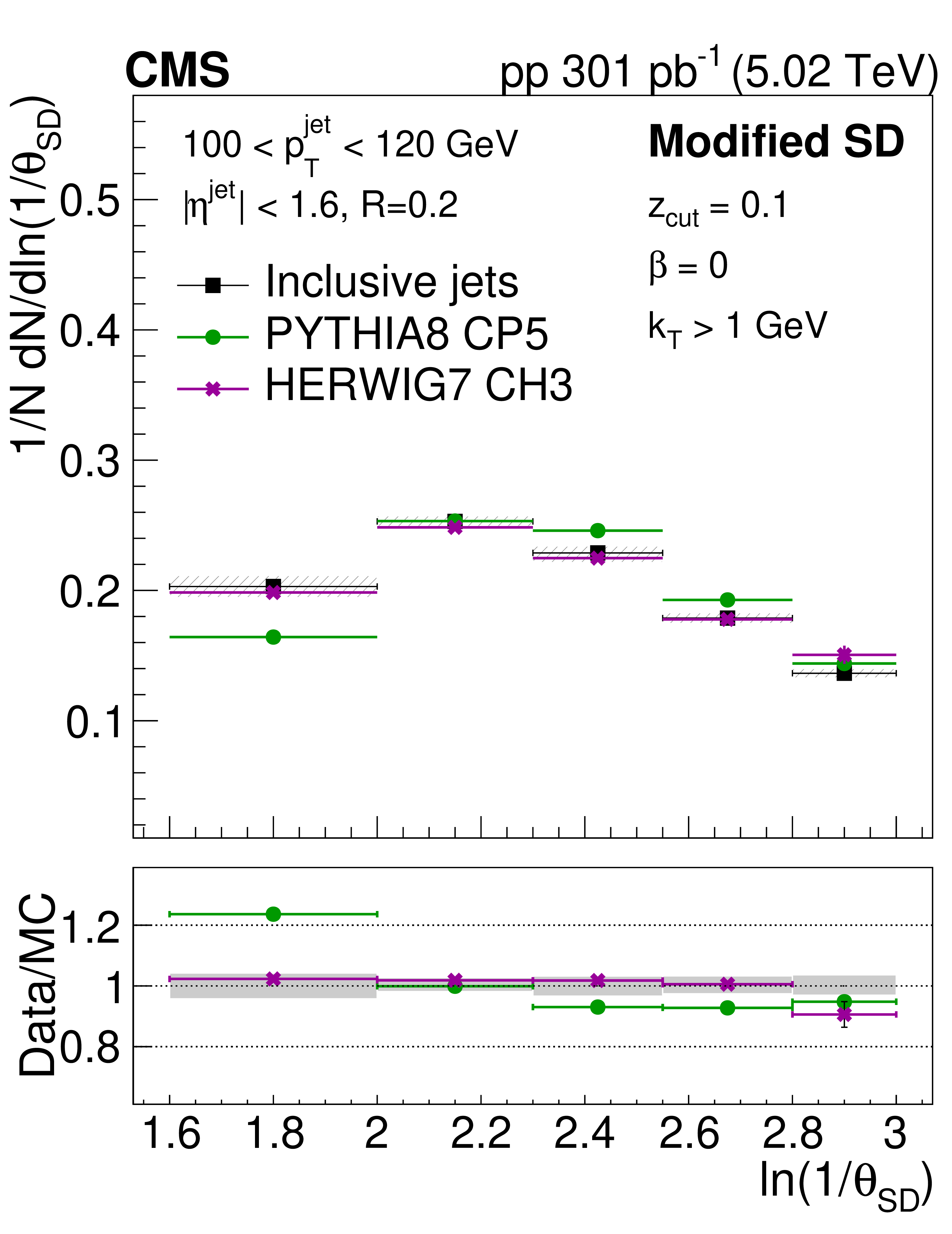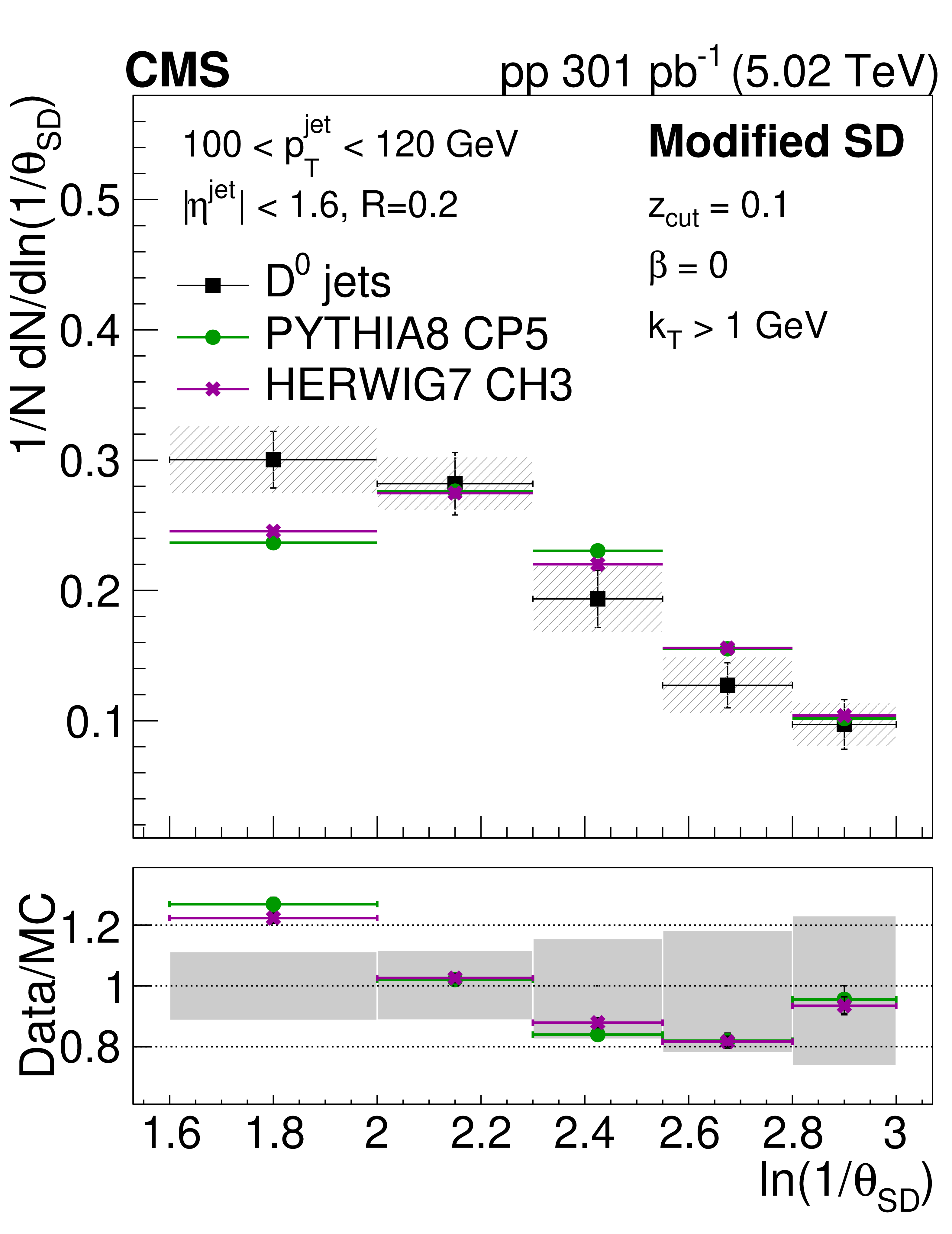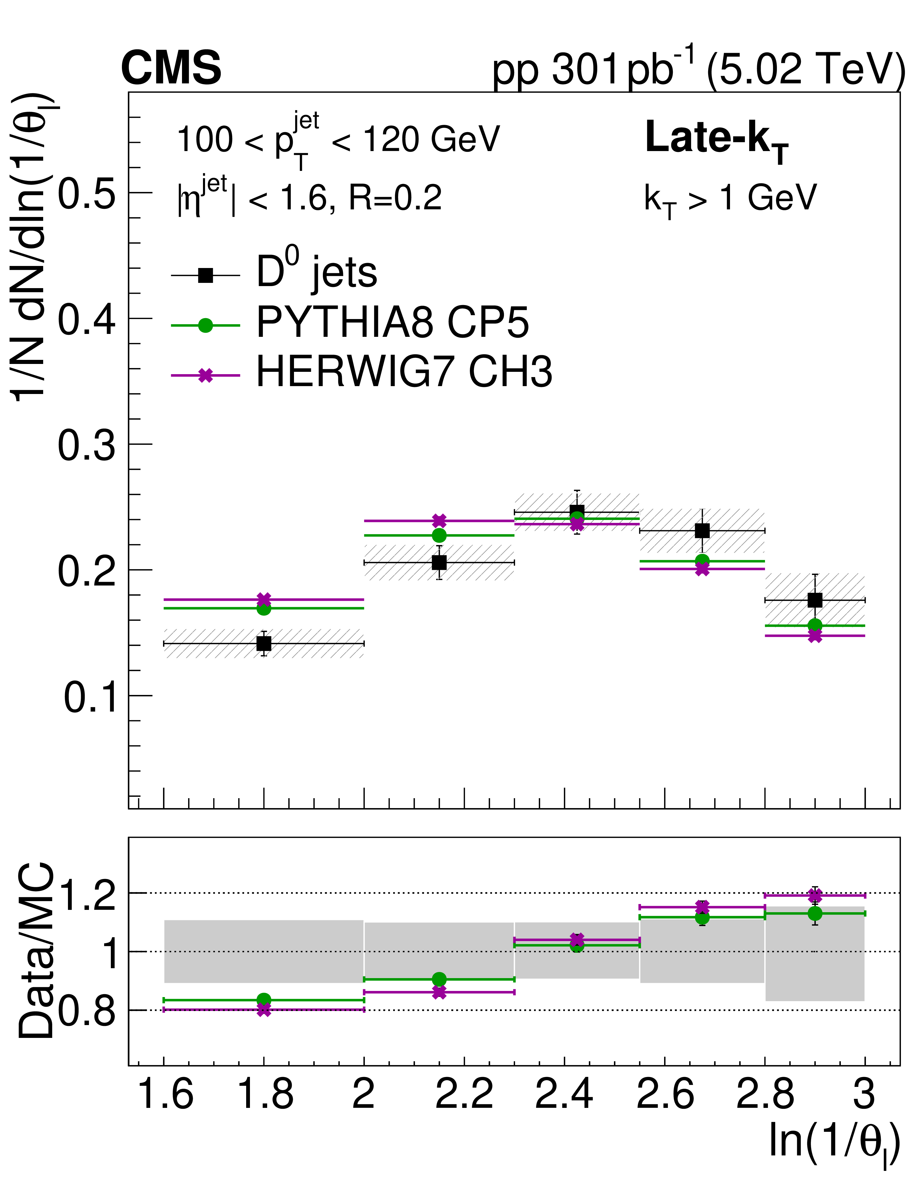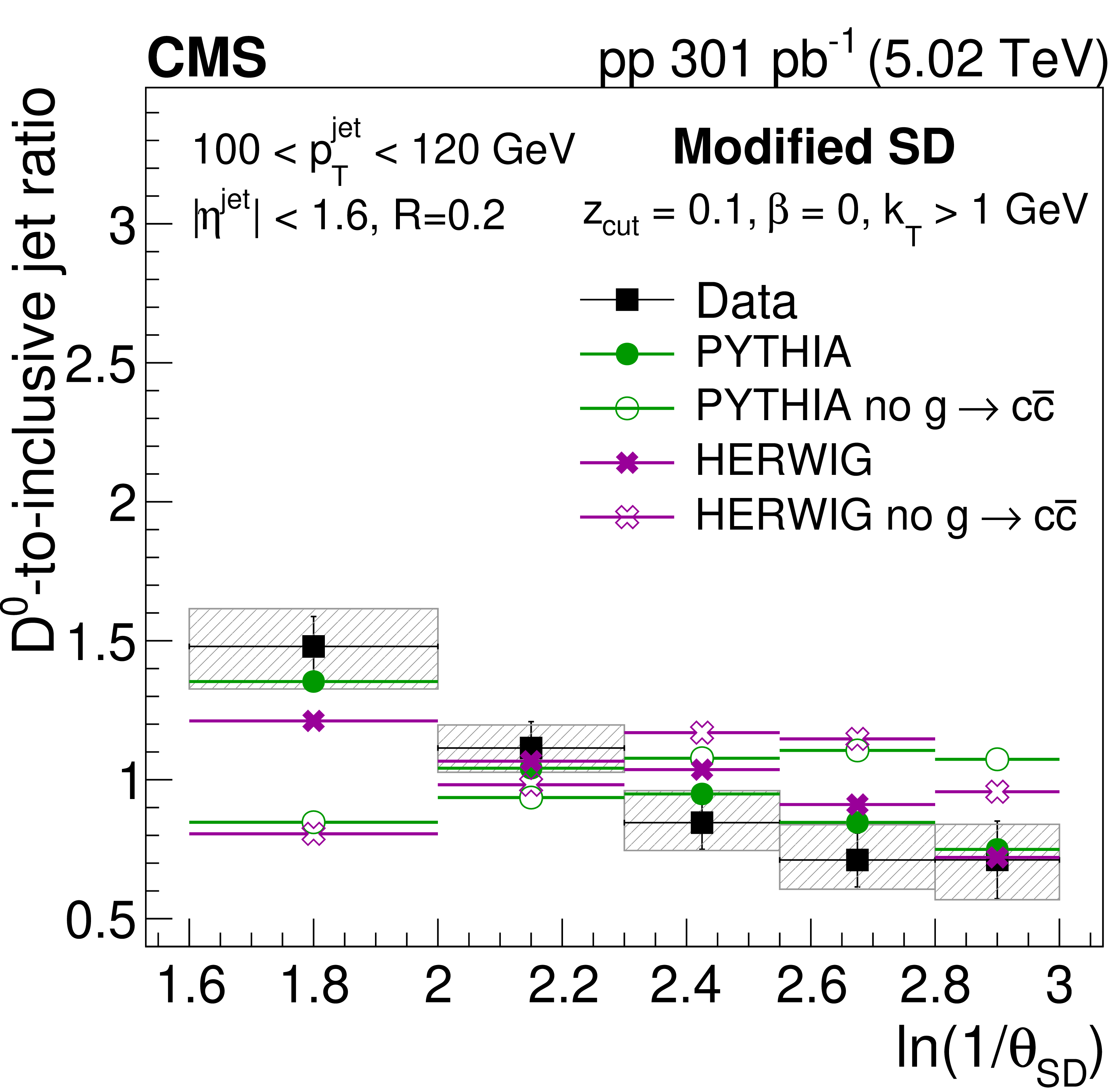 The ratio of the late-$ k_{\mathrm{T}} $ (left) and SD (right) angle distributions for prompt $ \mathrm{D^0} $ jets to inclusive jets. The data are compared to PYTHIA8 CP5 and HERWIG 7 CH3 predictions with and without g$ \to \mathrm{c} \overline{\mathrm{c}} $. The error boxes represents the total systematic uncertainty, whereas the vertical bars represent the statistical uncertainties. |