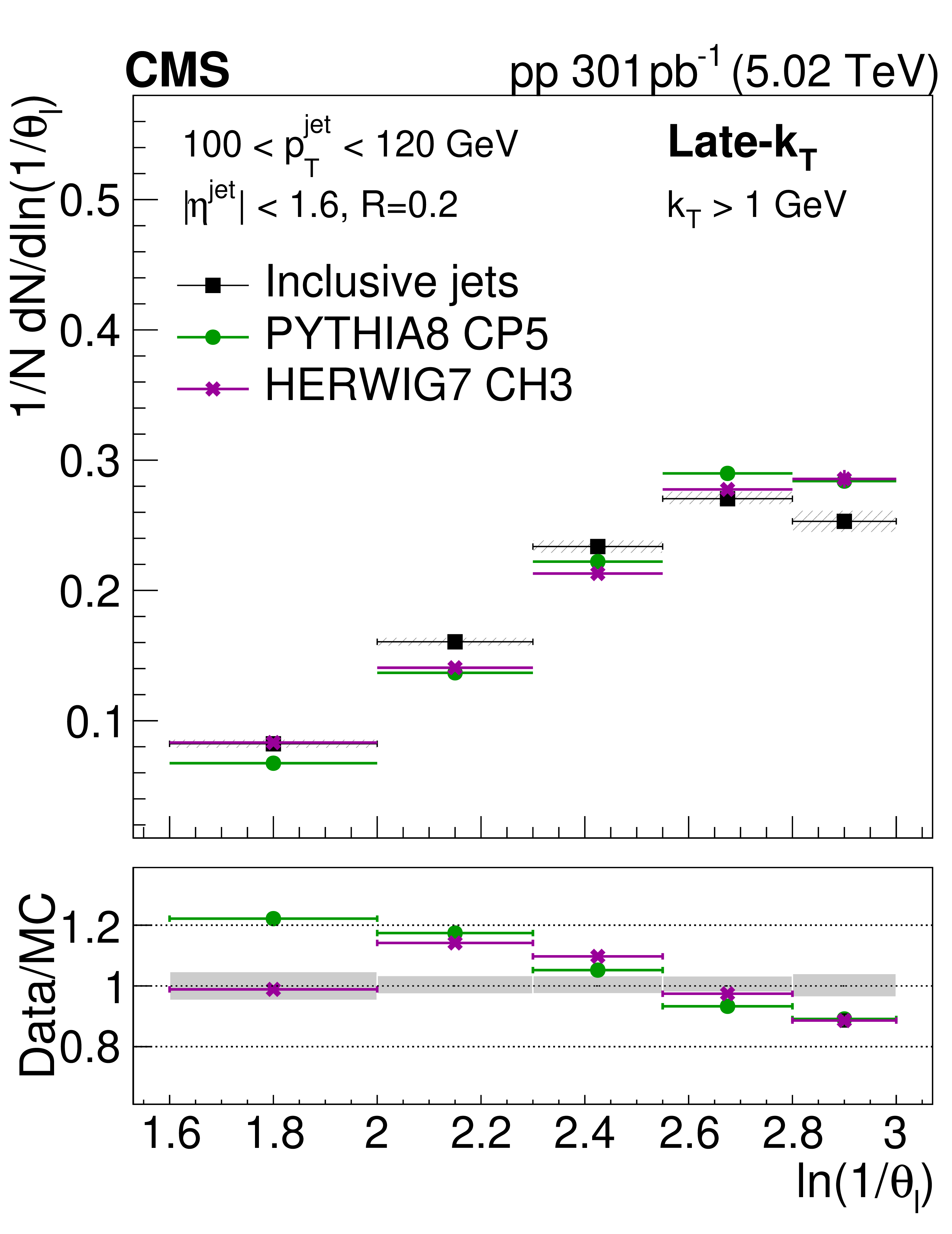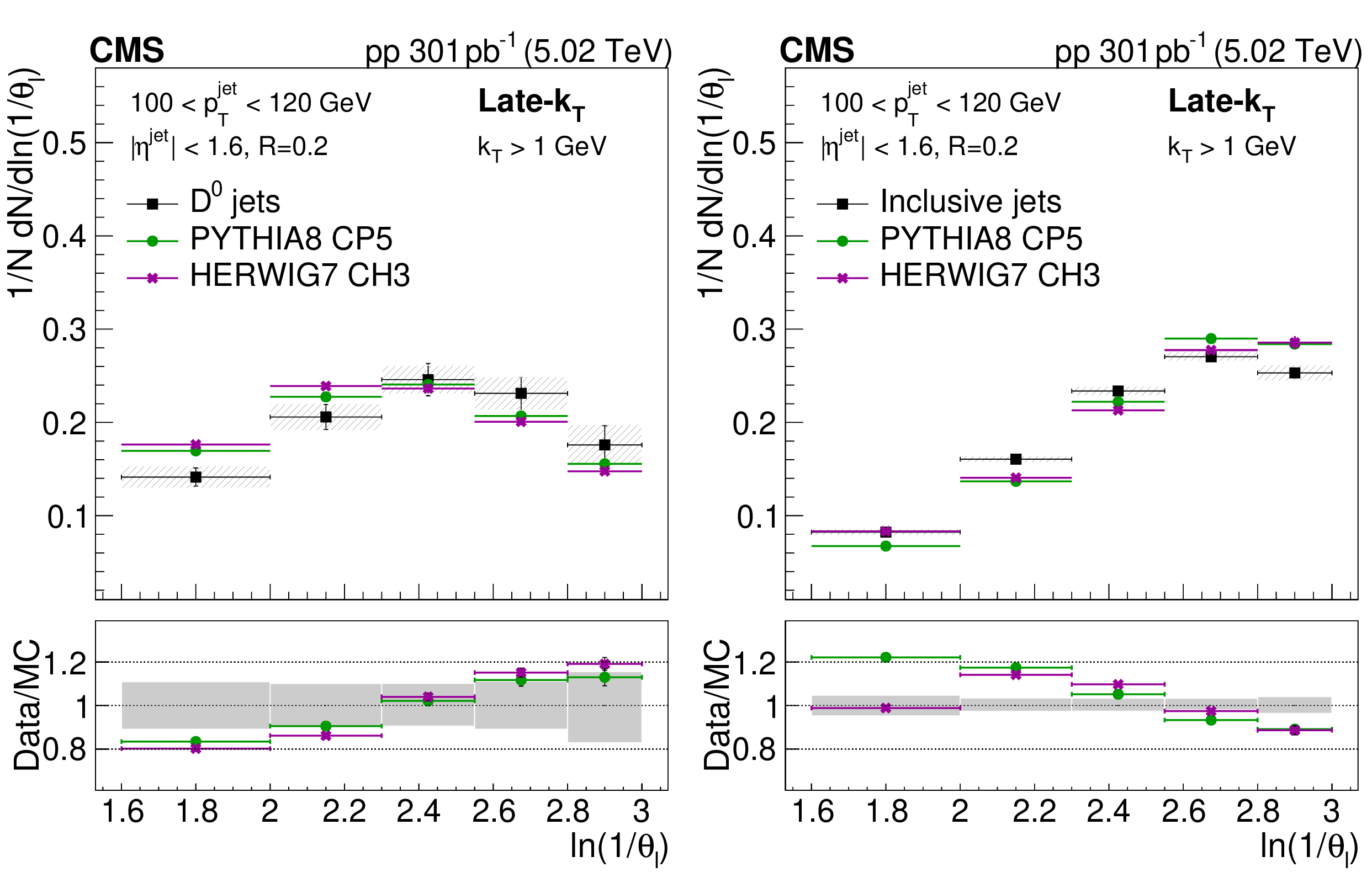 The unfolded late-$ k_{\mathrm{T}} $ angular distribution for prompt $ \mathrm{D^0} $ jets (left) and inclusive jets (right) compared to the predictions from PYTHIA8 CP5 and HERWIG 7 CH3. The error bands in the upper panel represent the total systematical uncertainty, whereas the vertical bars represent the statistical uncertainties. In the lower panel, the error band in the ratio plot represents the total experimental uncertainty in the measurement. |