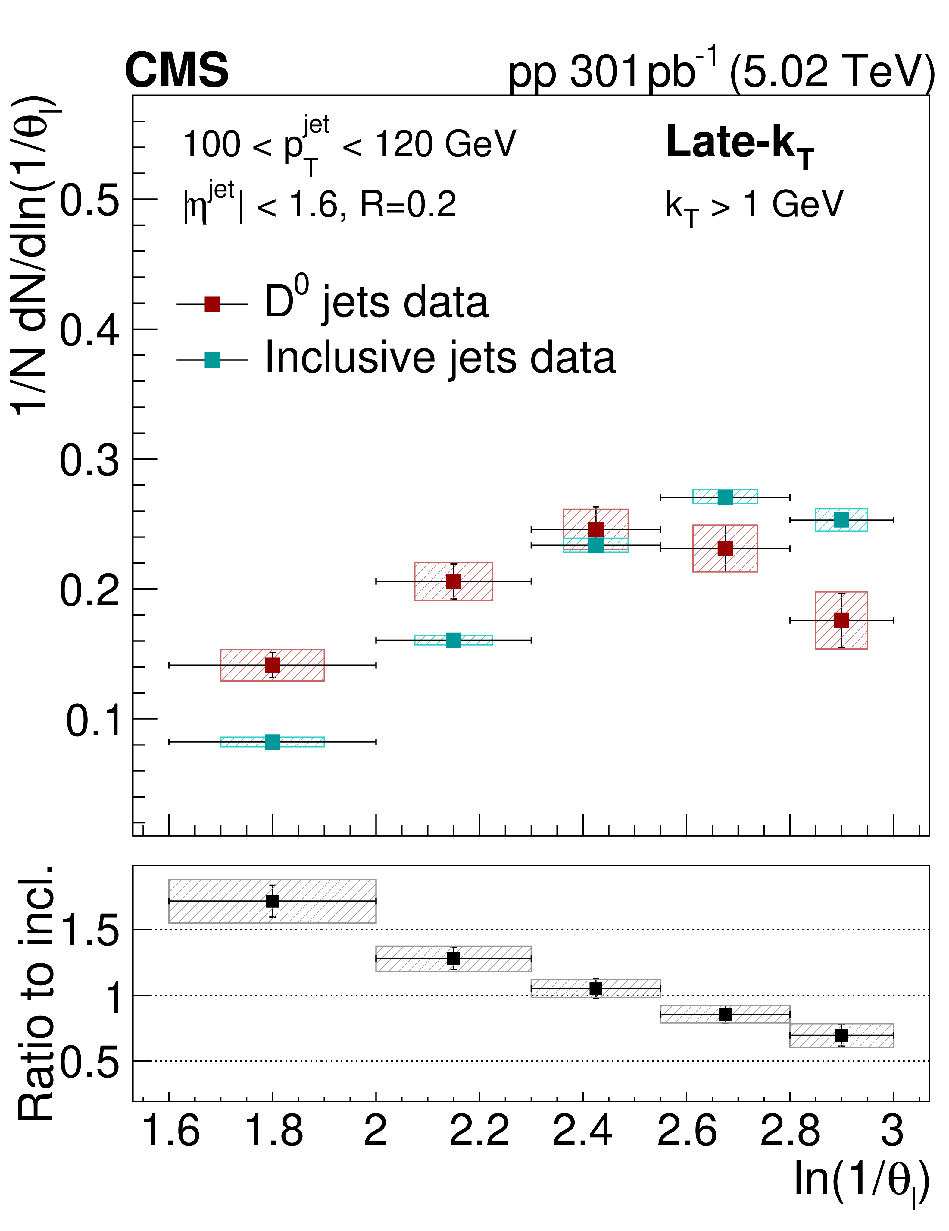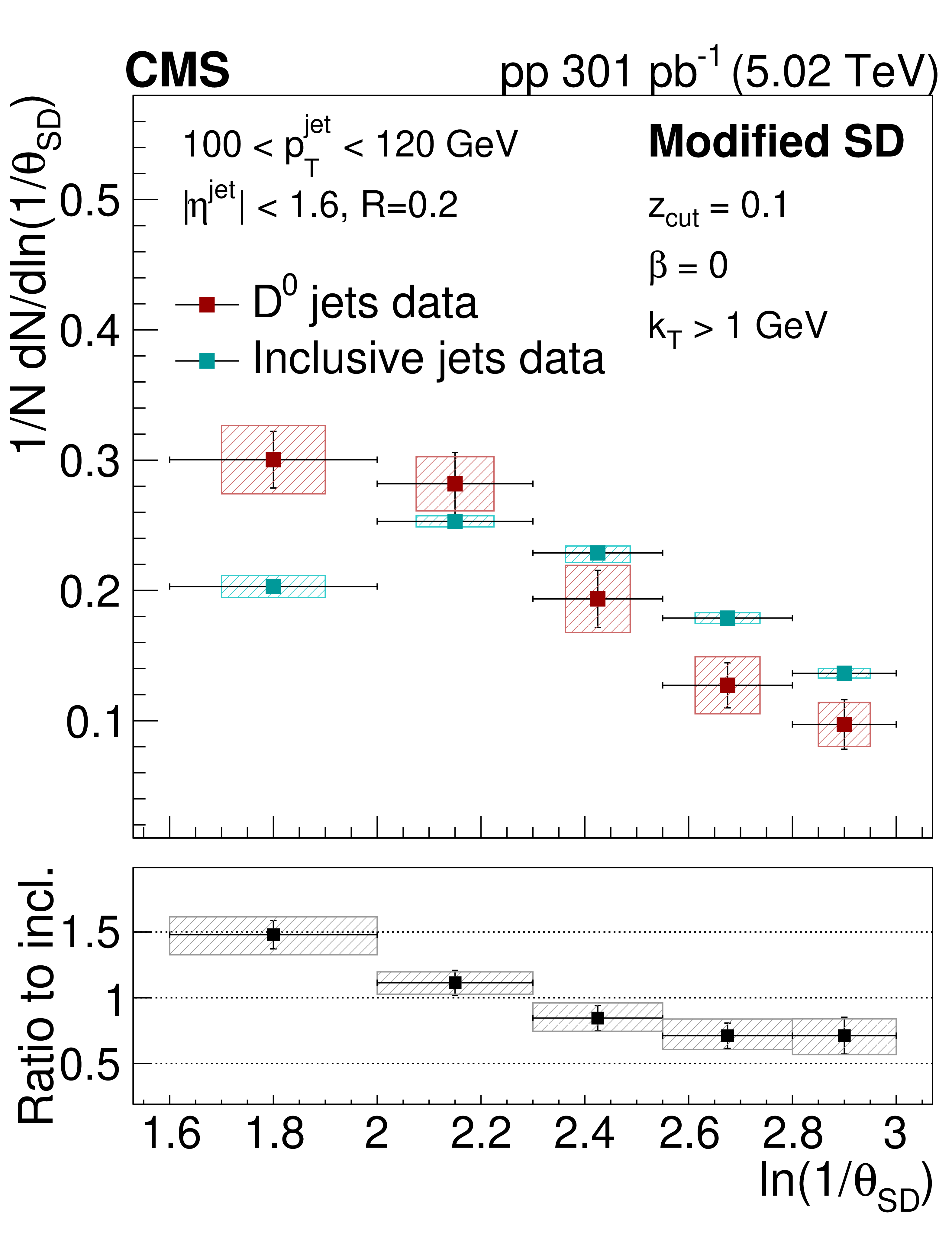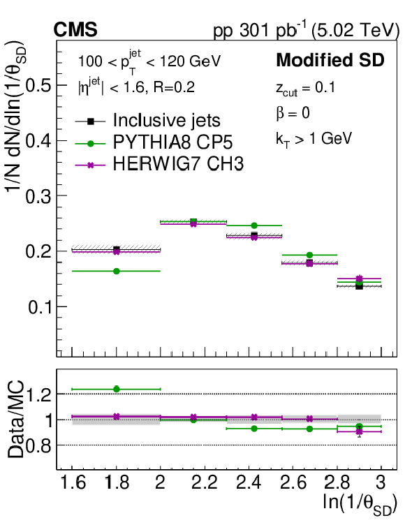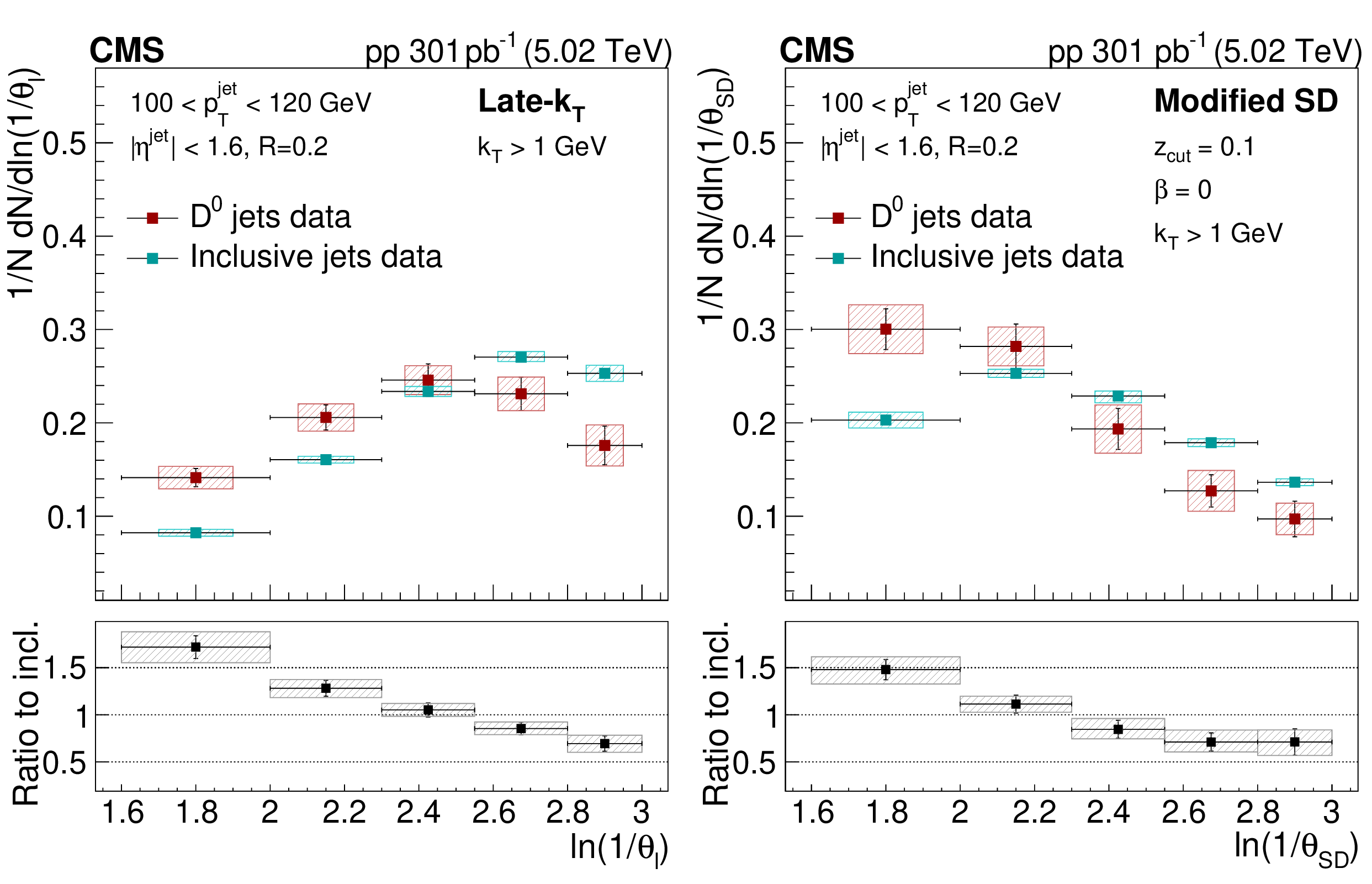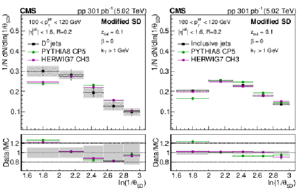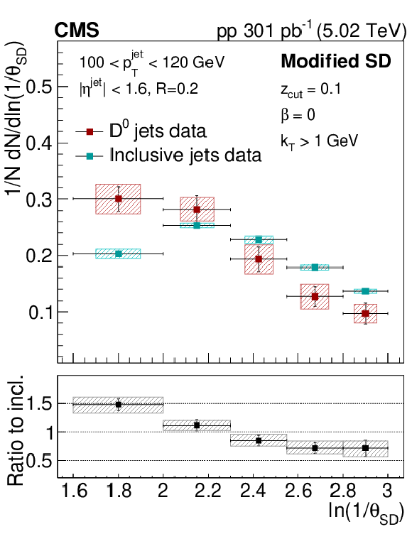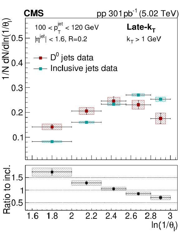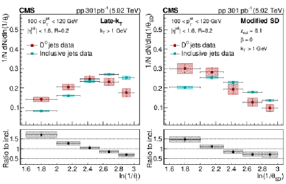 The late-$ k_{\mathrm{T}} $ (left) and modified SD (right) angular distribution for prompt $ \mathrm{D^0} $ jets and inclusive jets. The ratio to the inclusive jets is shown in the lower panels. The error boxes represents the total systematic uncertainty, whereas the vertical bars represent the statistical uncertainties. |
