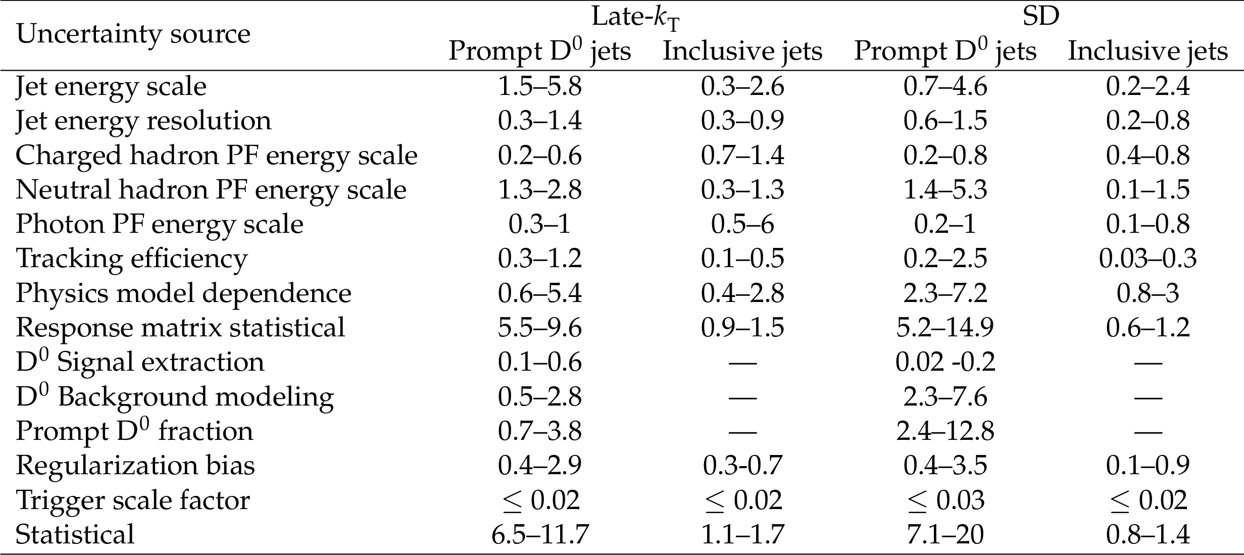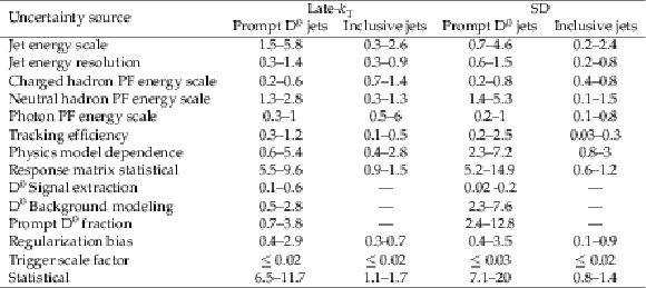 Summary of fractional uncertainties (%), with minimum and maximum uncertainty values indicated. |