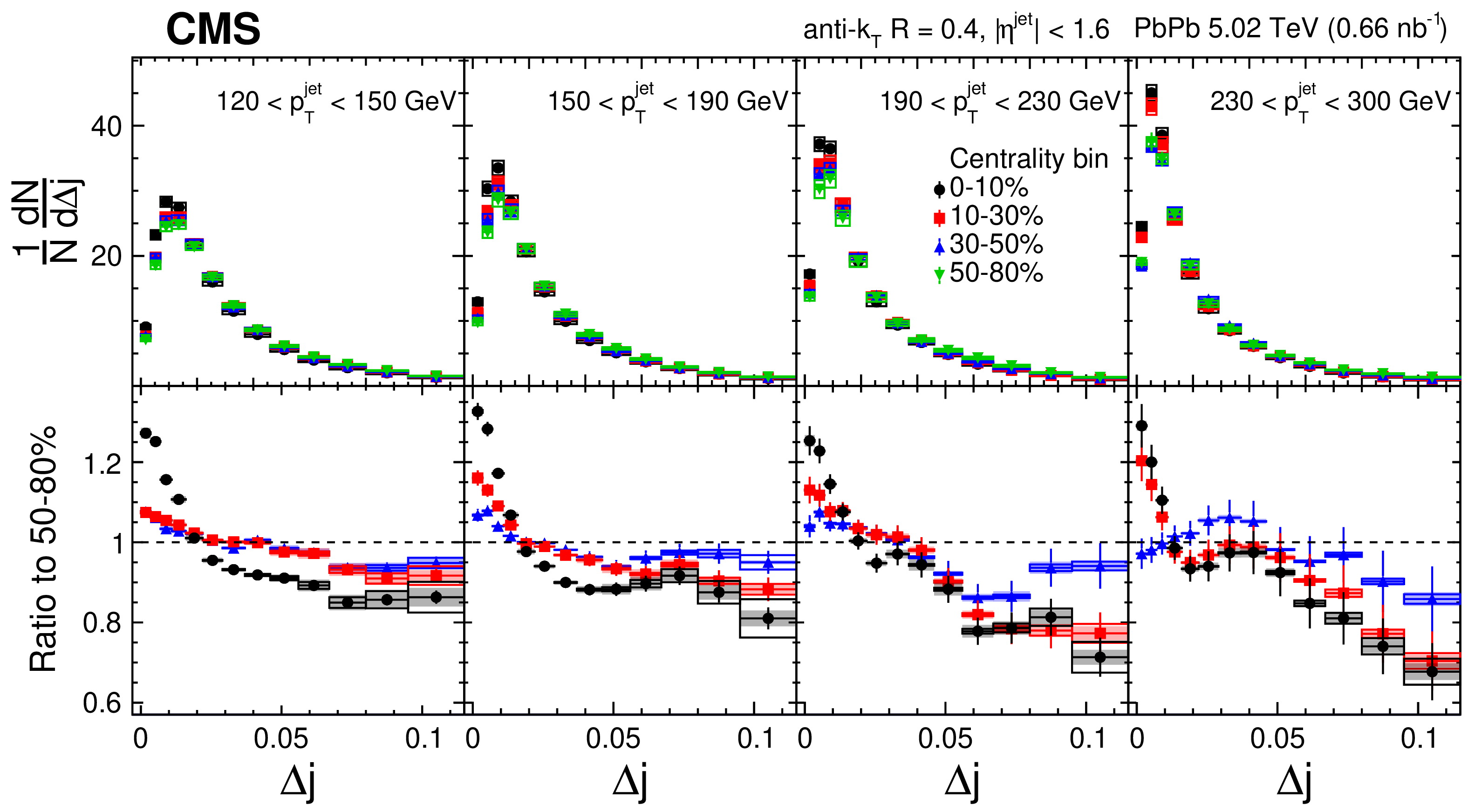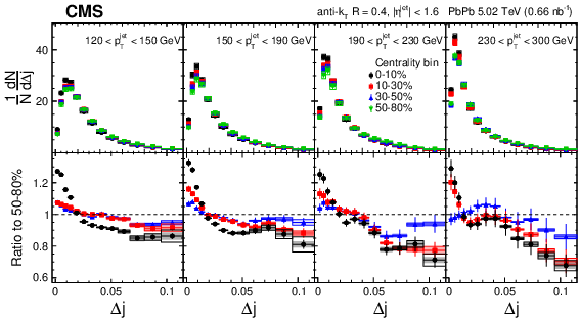 The unfolded normalized $ \Delta\text{j} $ distributions are measured across different centrality and $ p_{\mathrm{T}} $ intervals. Each panel displays distributions for four centrality intervals within a specific $ p_{\mathrm{T}} $ bin, with $ p_{\mathrm{T}} $ ranges (indicated in each panel) increasing from left to right. In each panel, the black circles show measurements for 0-10% centrality interval, the red squares for 10-30%, and the blue-up and green-down triangles for 30-50% and 50-80% centrality intervals, respectively. The vertical solid lines represent the statistical uncertainties, while the rectangles and shaded areas represent the correlated and uncorrelated systematic uncertainties, respectively. |