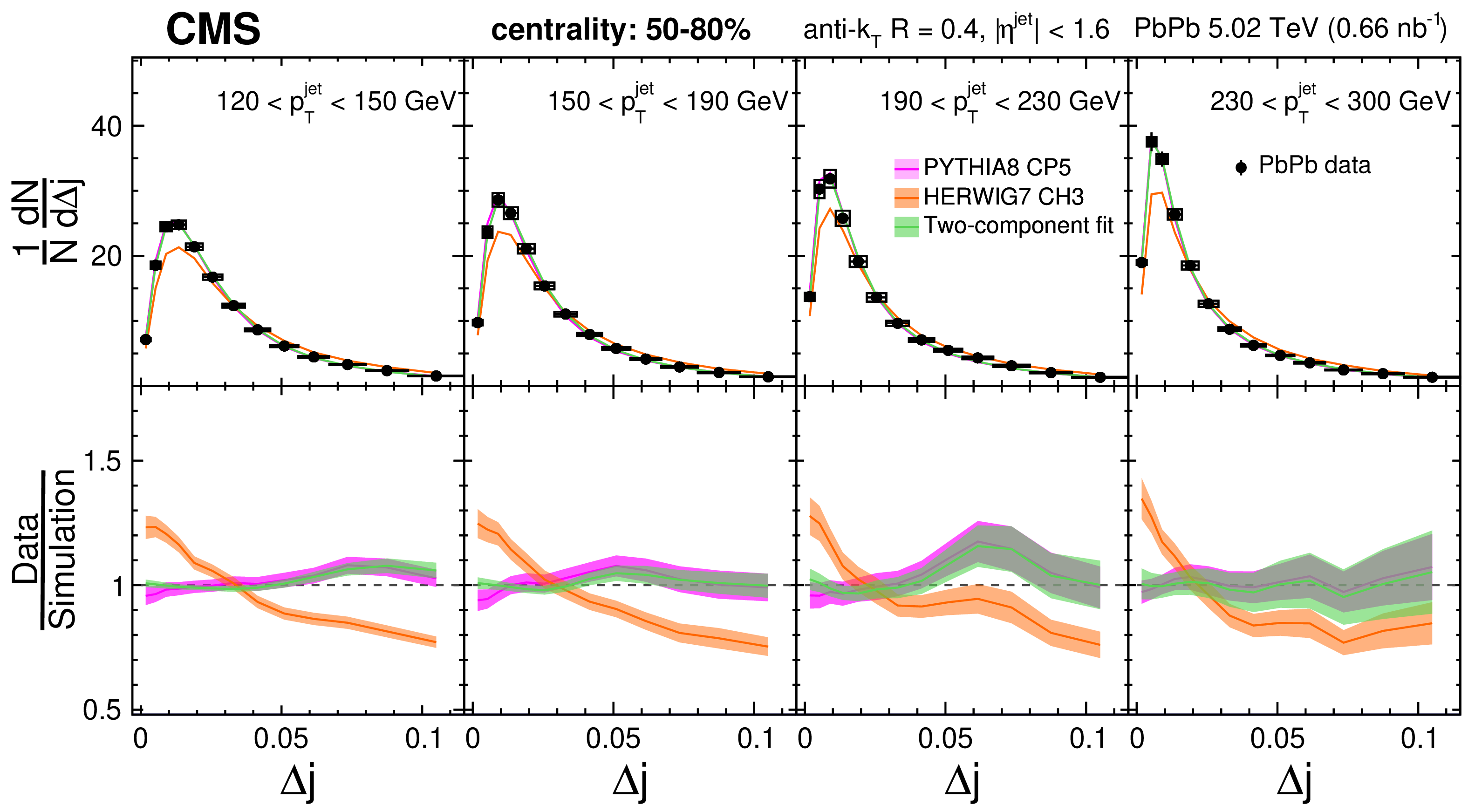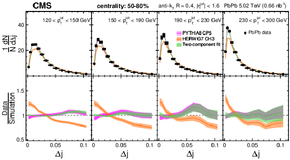 The unfolded $ \Delta\text{j} $ distributions (black circles) are compared with simulations from PYTHIA, HERWIG, and a two-component, represented as colored bands, for the 50-80% centrality range across different $ p_{\mathrm{T}} $ intervals. The vertical solid lines represent the statistical uncertainties, while the rectangles and shaded areas represent the correlated and uncorrelated systematic uncertainties, respectively. Only statistical uncertainties are shown for the simulated distributions. |