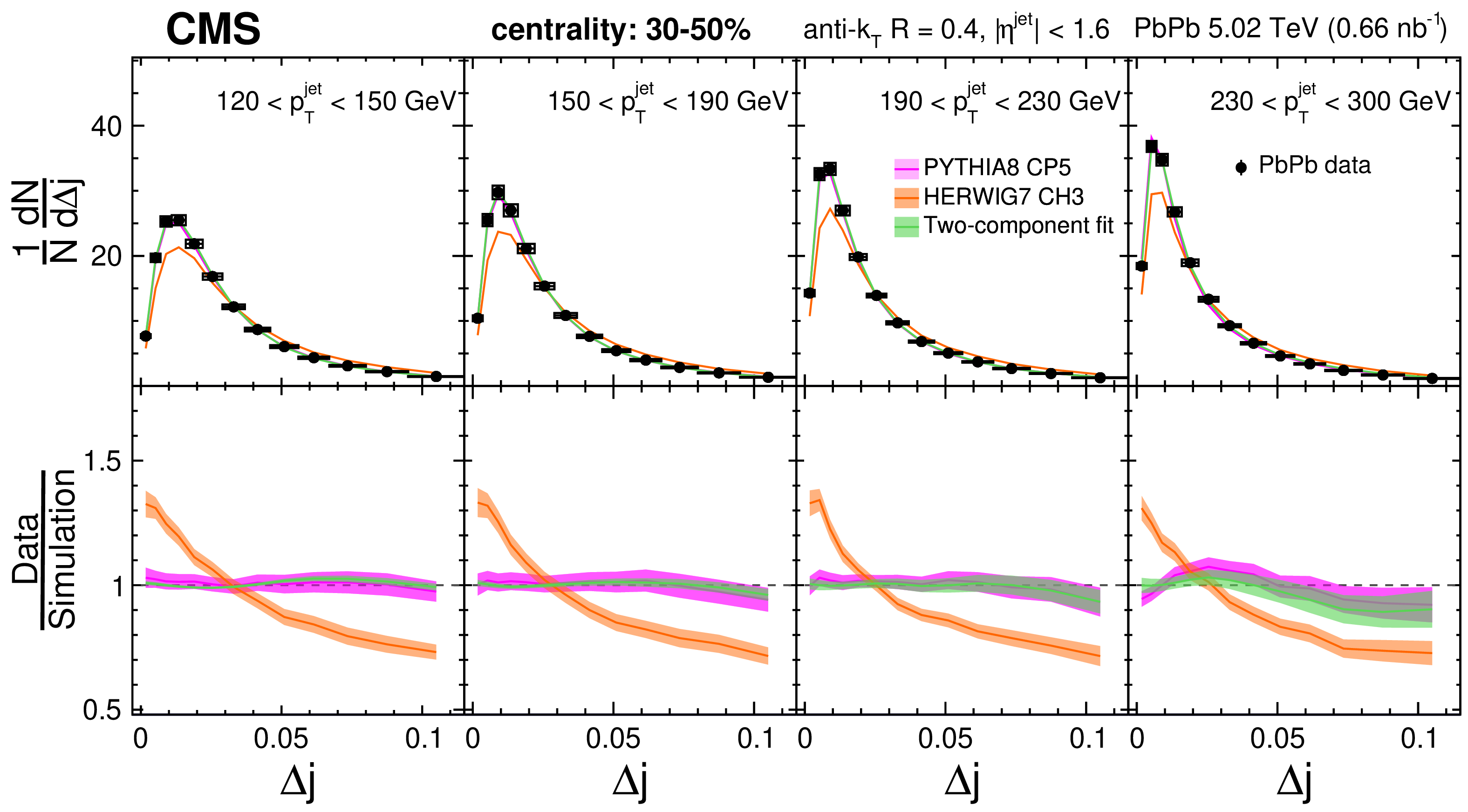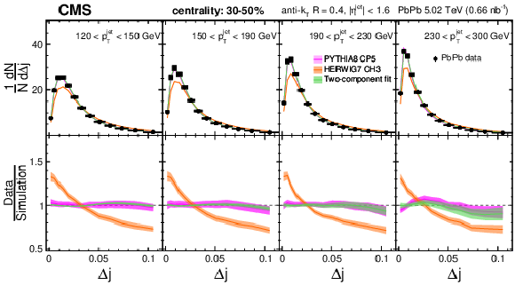 The unfolded $ \Delta\text{j} $ distributions (black circles) are compared with simulations from PYTHIA, HERWIG, and a two-component, represented as colored bands, for the 30-50% centrality range across different $ p_{\mathrm{T}} $ intervals. The vertical solid lines represent the statistical uncertainties, while the rectangles and shaded areas represent the correlated and uncorrelated systematic uncertainties, respectively. Only statistical uncertainties are shown for the simulated distributions. |