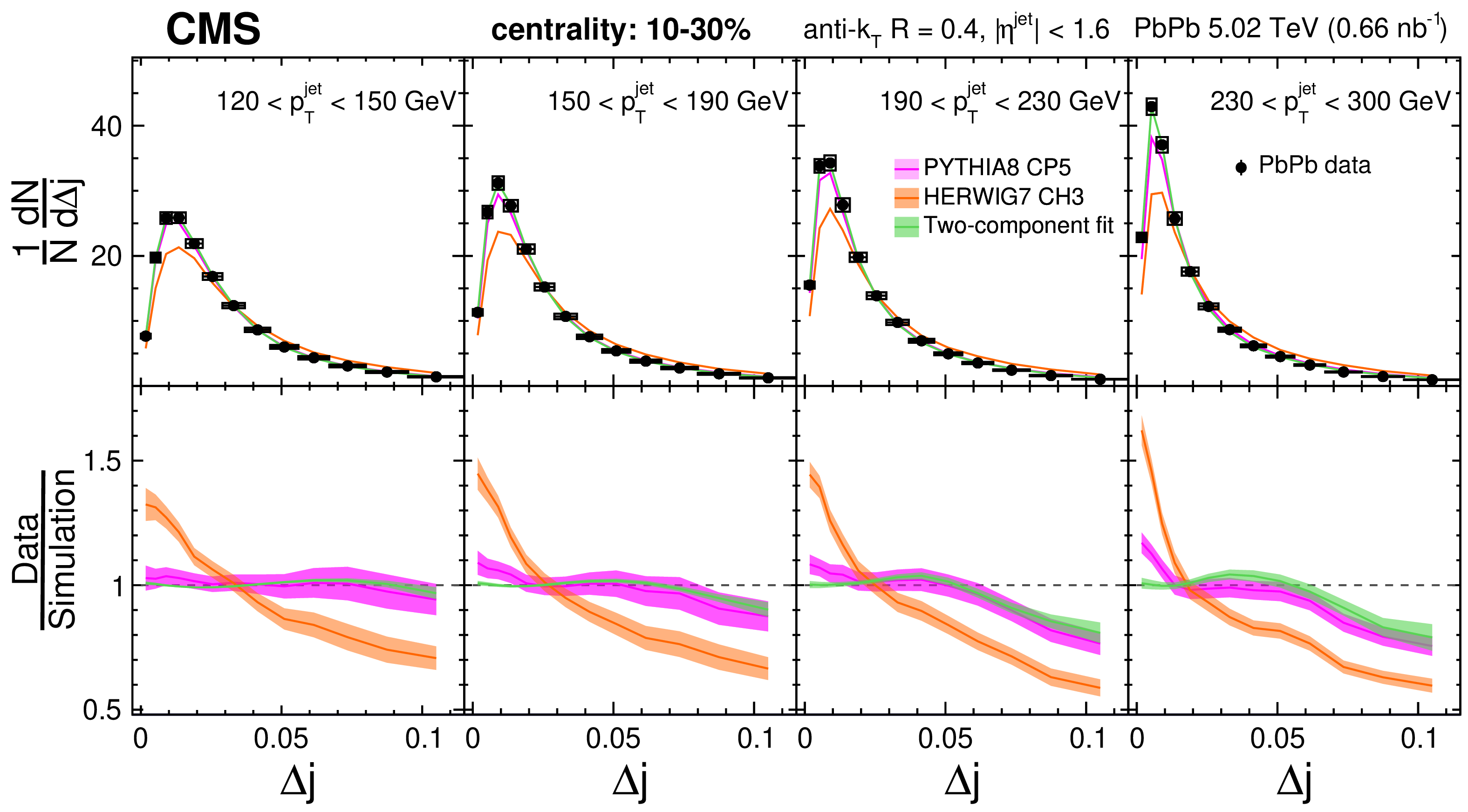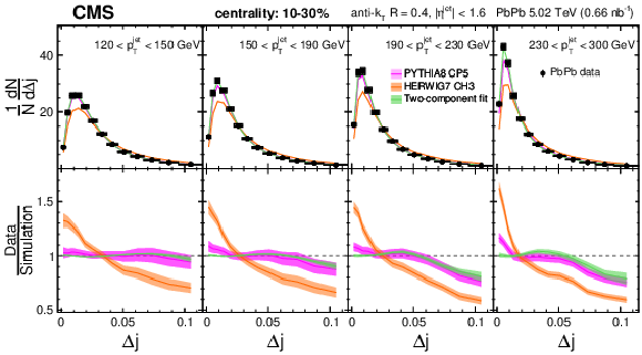 The unfolded $ \Delta\text{j} $ distributions (black circles) are compared with simulations from PYTHIA, HERWIG, and a two-component, represented as colored bands, for the 10-30% centrality range across different $ p_{\mathrm{T}} $ intervals. The vertical solid lines represent the statistical uncertainties, while the rectangles and shaded areas represent the correlated and uncorrelated systematic uncertainties, respectively. Only statistical uncertainties are shown for the simulated distributions. |