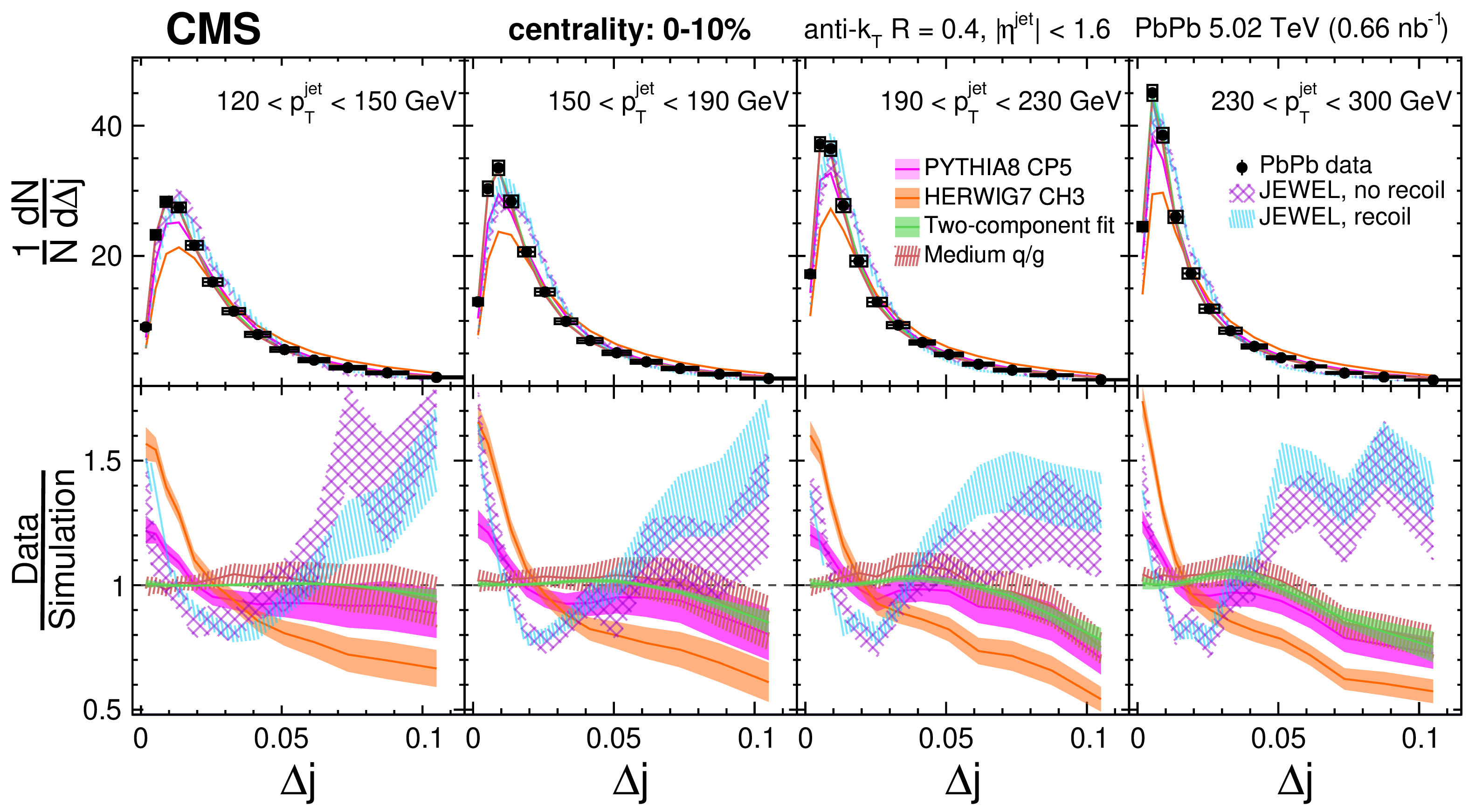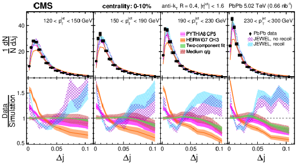 The unfolded $ \Delta\text{j} $ distributions (black circles) are compared with simulations from PYTHIA, HERWIG, and a two-component (represented as colored bands), as well as medium q/g and JEWEL predictions (represented as hatched lines) for the 0-10% centrality range across different $ p_{\mathrm{T}} $ intervals. The vertical solid lines represent the statistical uncertainties, while the rectangles and shaded areas represent the correlated and uncorrelated systematic uncertainties, respectively. Only statistical uncertainties are shown for the simulated distributions. |