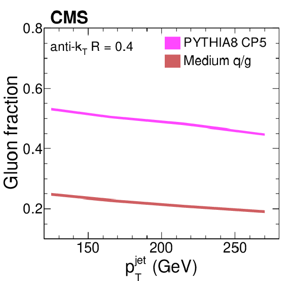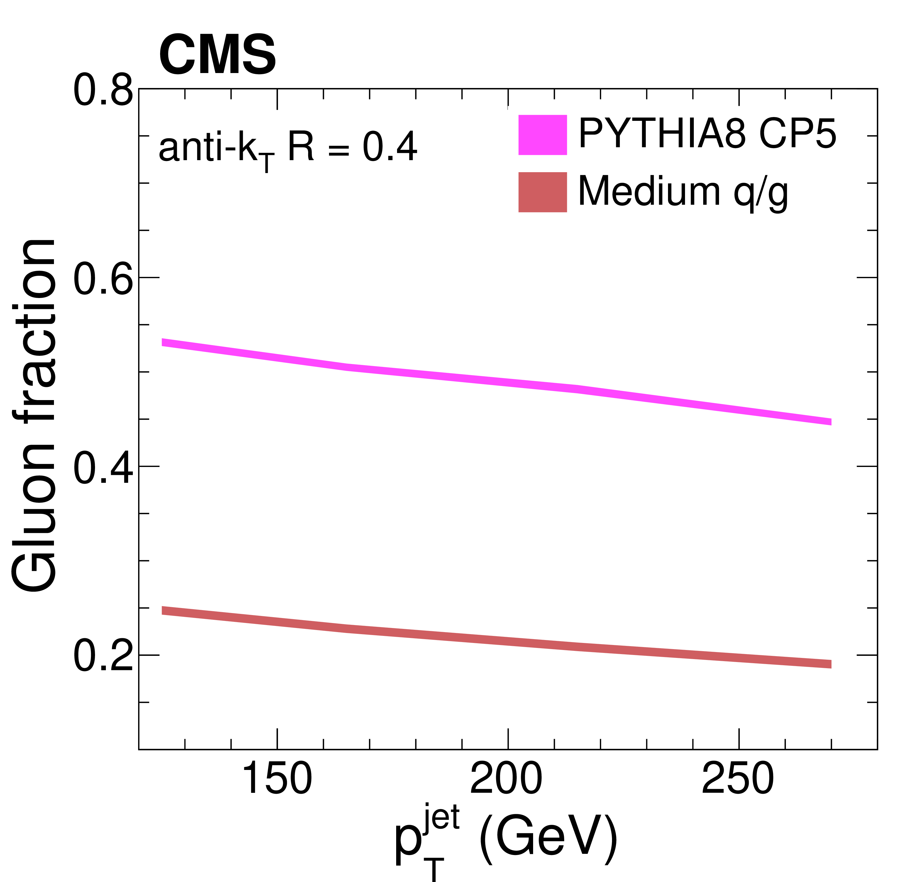 Expected gluon fraction in inclusive $ R = $ 0.4 jet sample in the vacuum (based on PYTHIA8 with tune CP5) and in medium (based on Refs. [51,52]). |