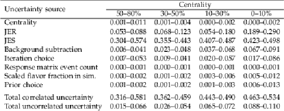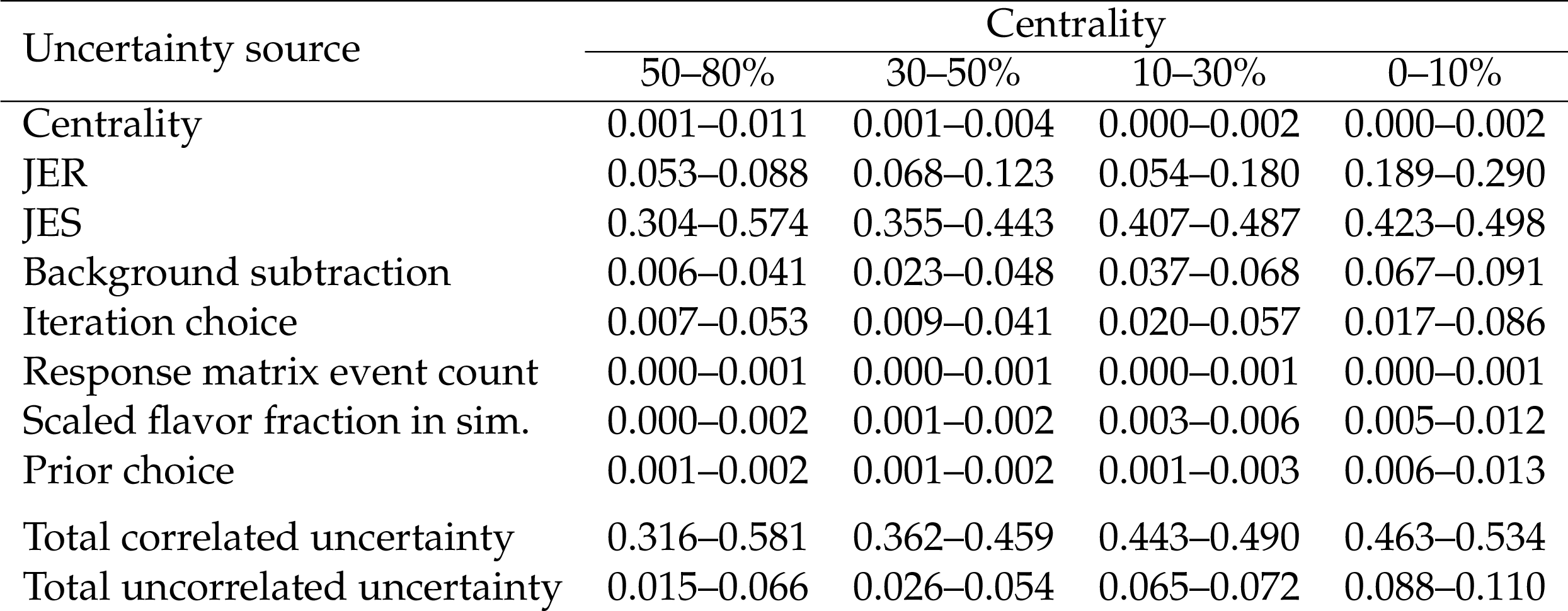 Summary of absolute systematic uncertainties, averaged over the $ \Delta\text{j} $ distributions for different centrality intervals. The range of uncertainty values reflects the maximum variation across different $ p_{\mathrm{T}} $ intervals. |