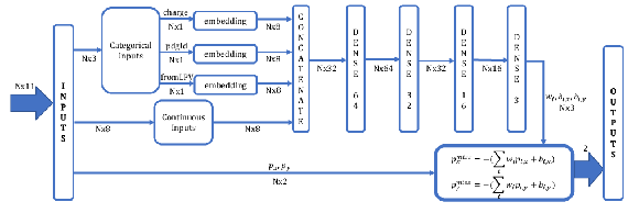 The DEEPMET DNN architecture. For each event, all PF candidates in the event are considered as input. $ N\times n $ represents the number of PF candidates in the event multiplied by the dimensionality of the per-particle feature space, where $ n $ can be 1, 2, 3, 8, 16, 32, and 64 in the architecture. |