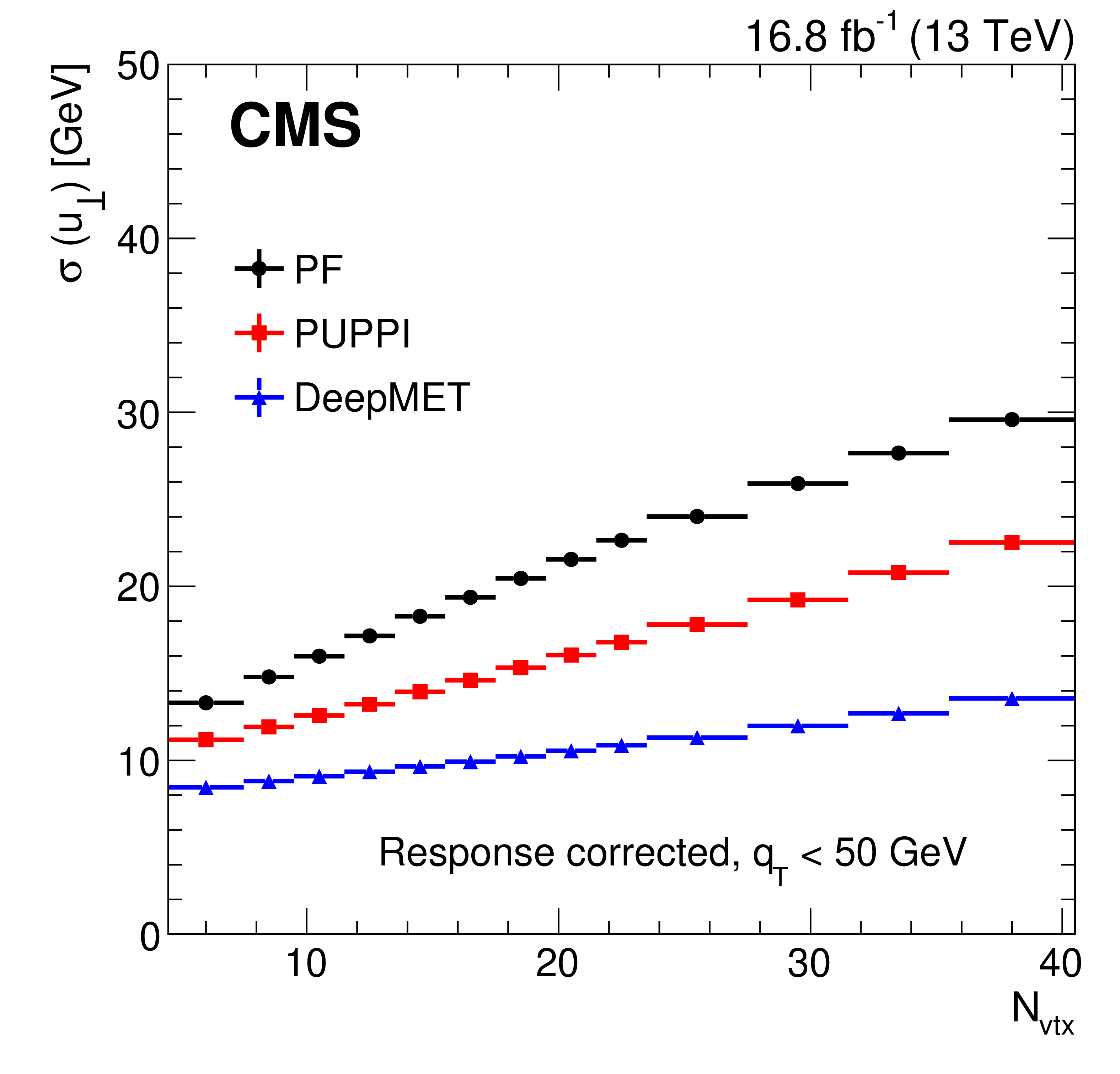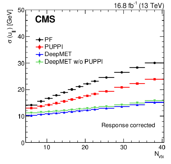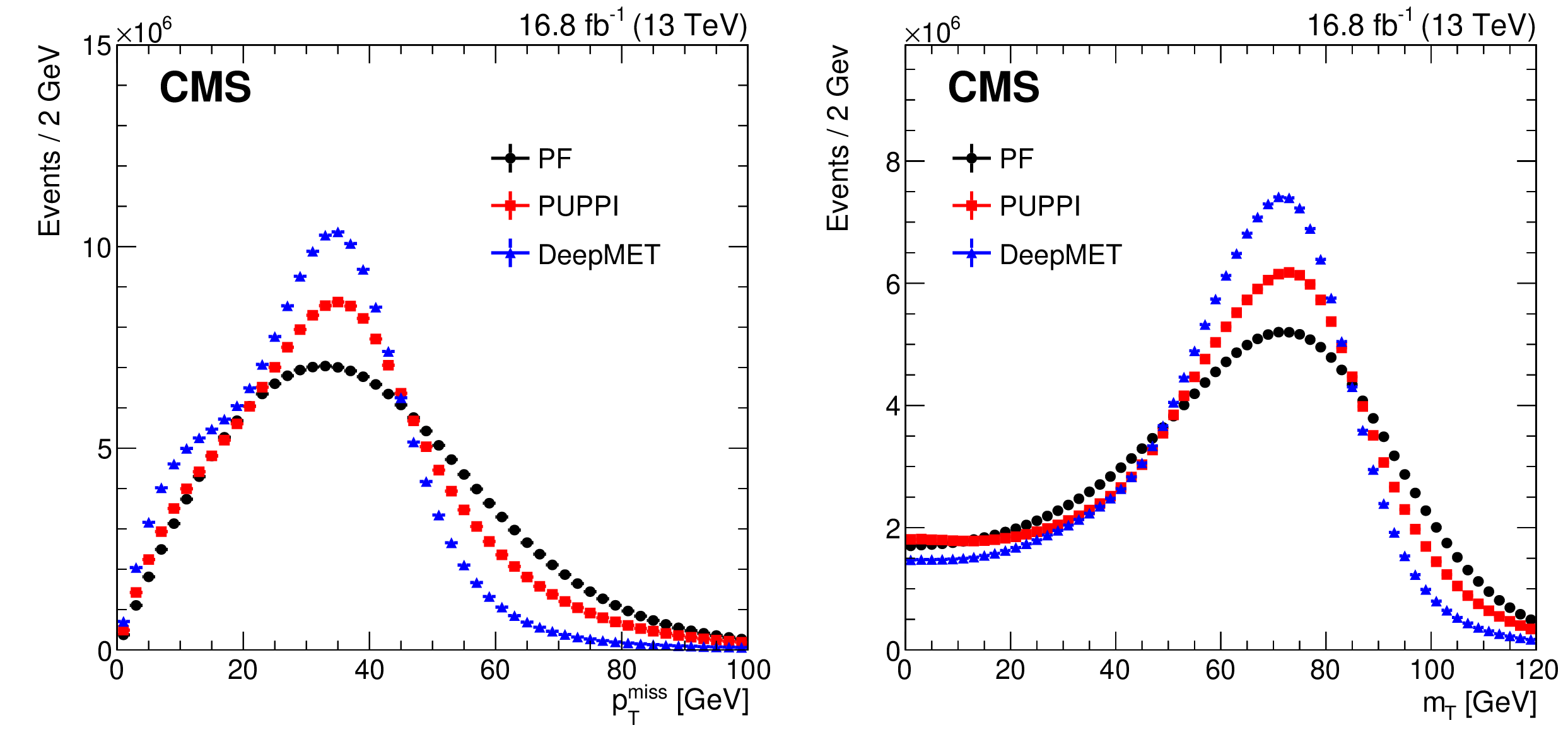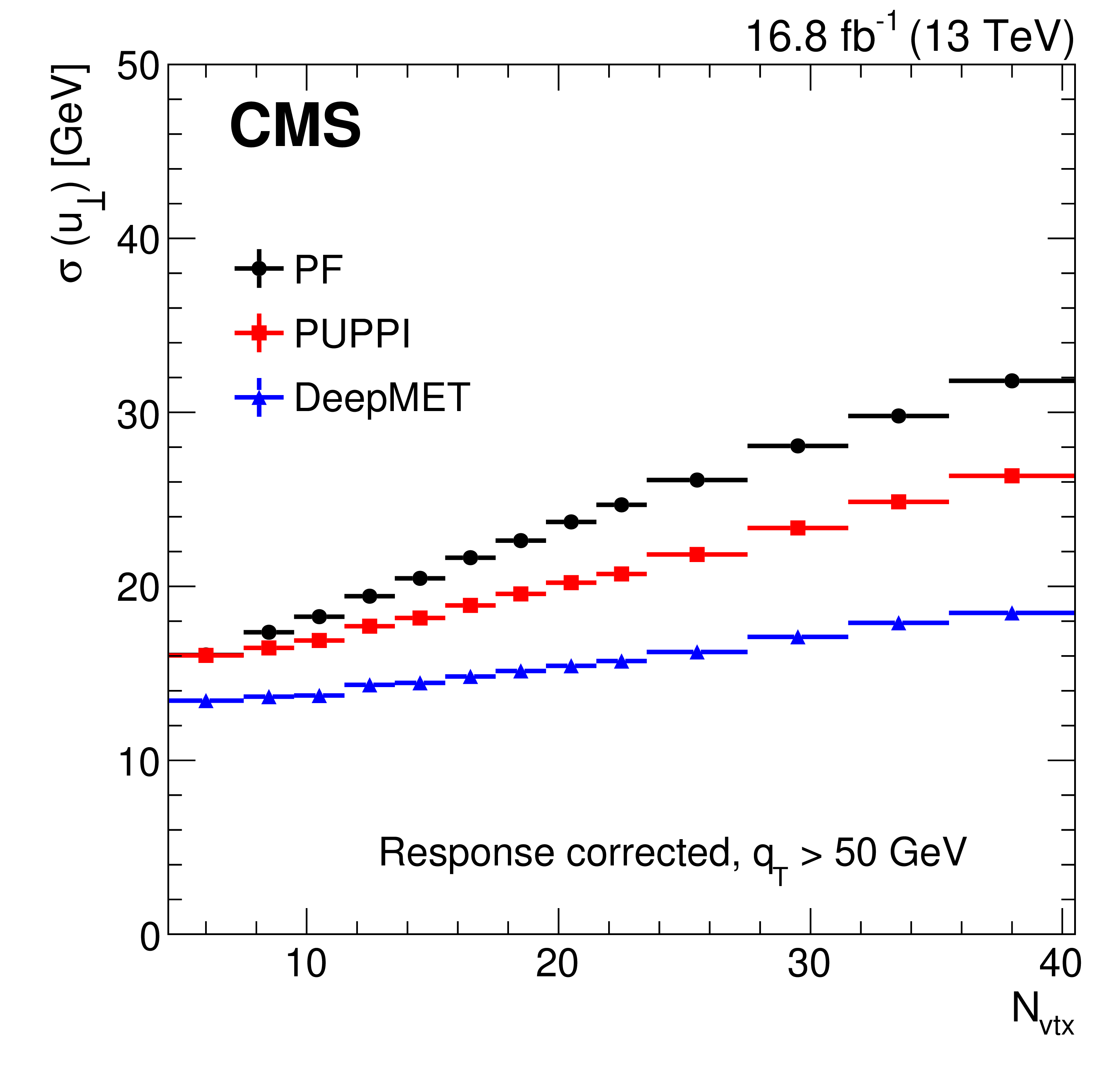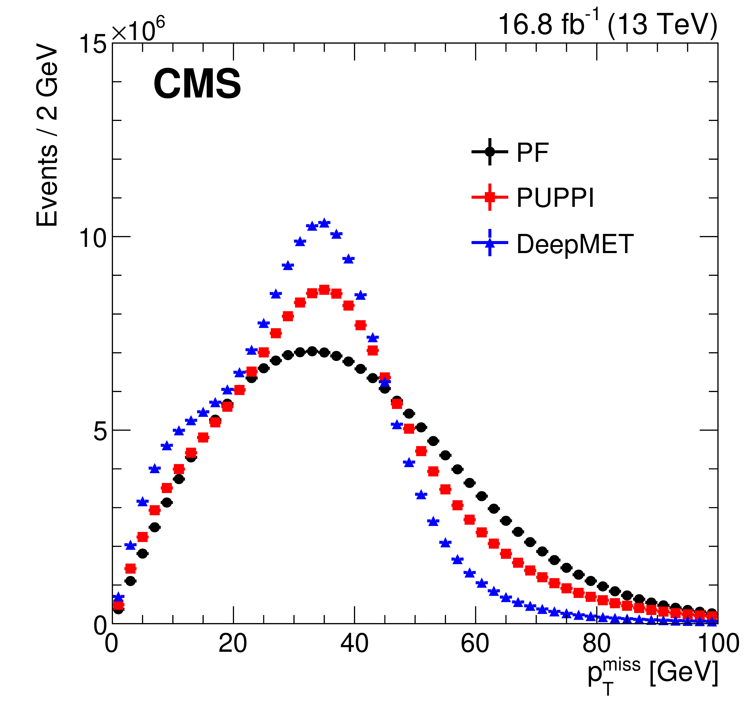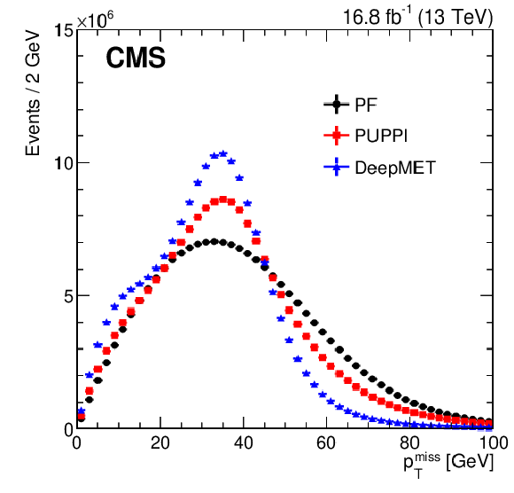 | Abstract: At hadron colliders, the net transverse momentum of particles that do not interact with the detector (missing transverse momentum, $ {\vec p}_{\mathrm{T}}^{\, \text{miss}} $) is a crucial observable in many analyses. In the standard model, $ {\vec p}_{\mathrm{T}}^{\, \text{miss}} $ originates from neutrinos. Many beyond-the-standard-model particles, such as dark matter candidates, are also expected to leave the experimental apparatus undetected. This paper presents a novel $ {\vec p}_{\mathrm{T}}^{\, \text{miss}} $ estimator, DEEPMET, which is based on deep neural networks that were developed by the CMS Collaboration at the LHC. The DEEPMET algorithm produces a weight for each reconstructed particle based on its properties. The estimator is based on the negative vector sum of the weighted transverse momenta of all reconstructed particles in an event. Compared with other estimators currently employed by CMS, DEEPMET improves the $ {\vec p}_{\mathrm{T}}^{\, \text{miss}} $ resolution by 10-30%, shows improvement for a wide range of final states, is easier to train, and is more resilient against the effects of additional proton-proton interactions accompanying the collision of interest. | ||
