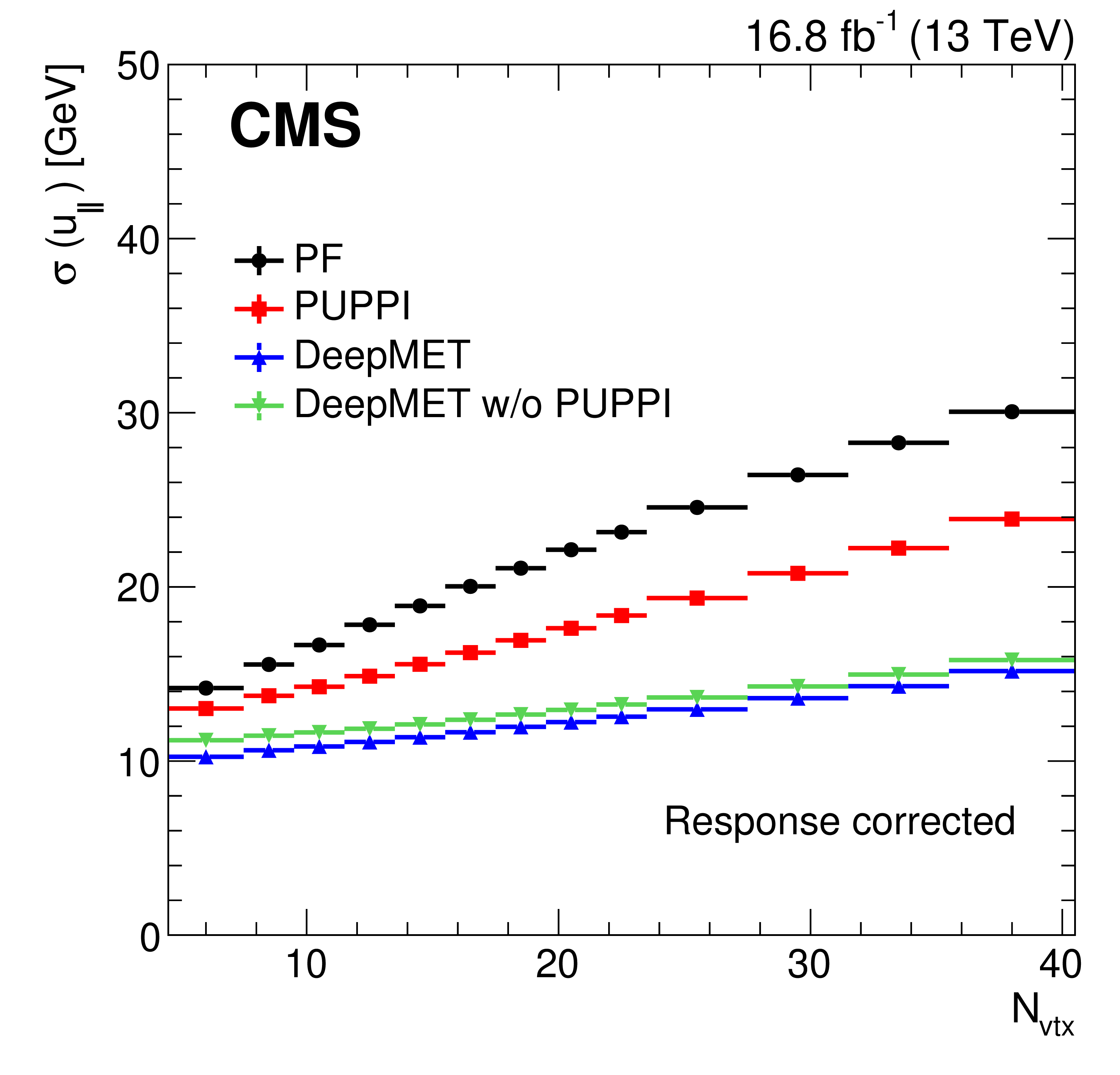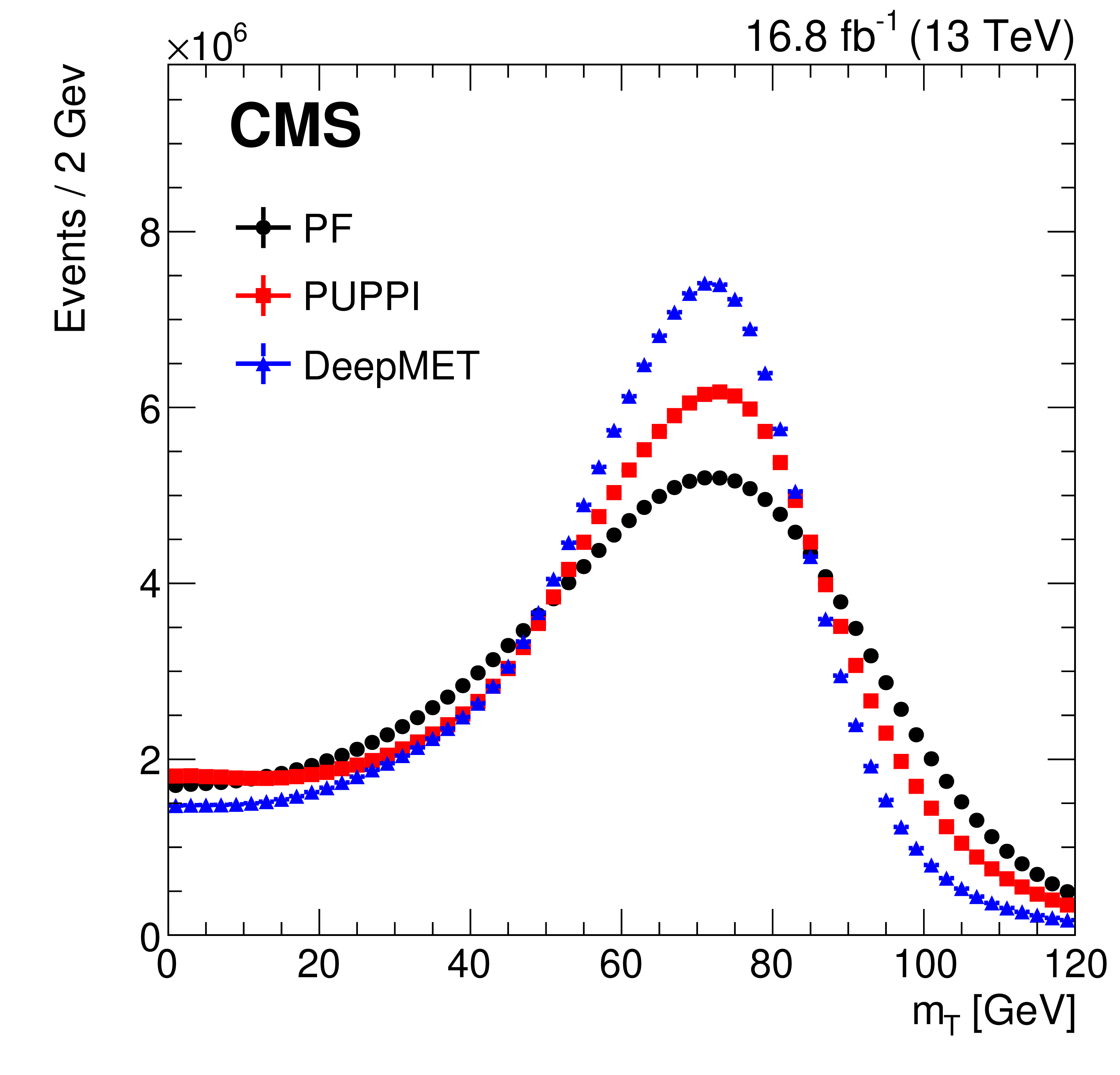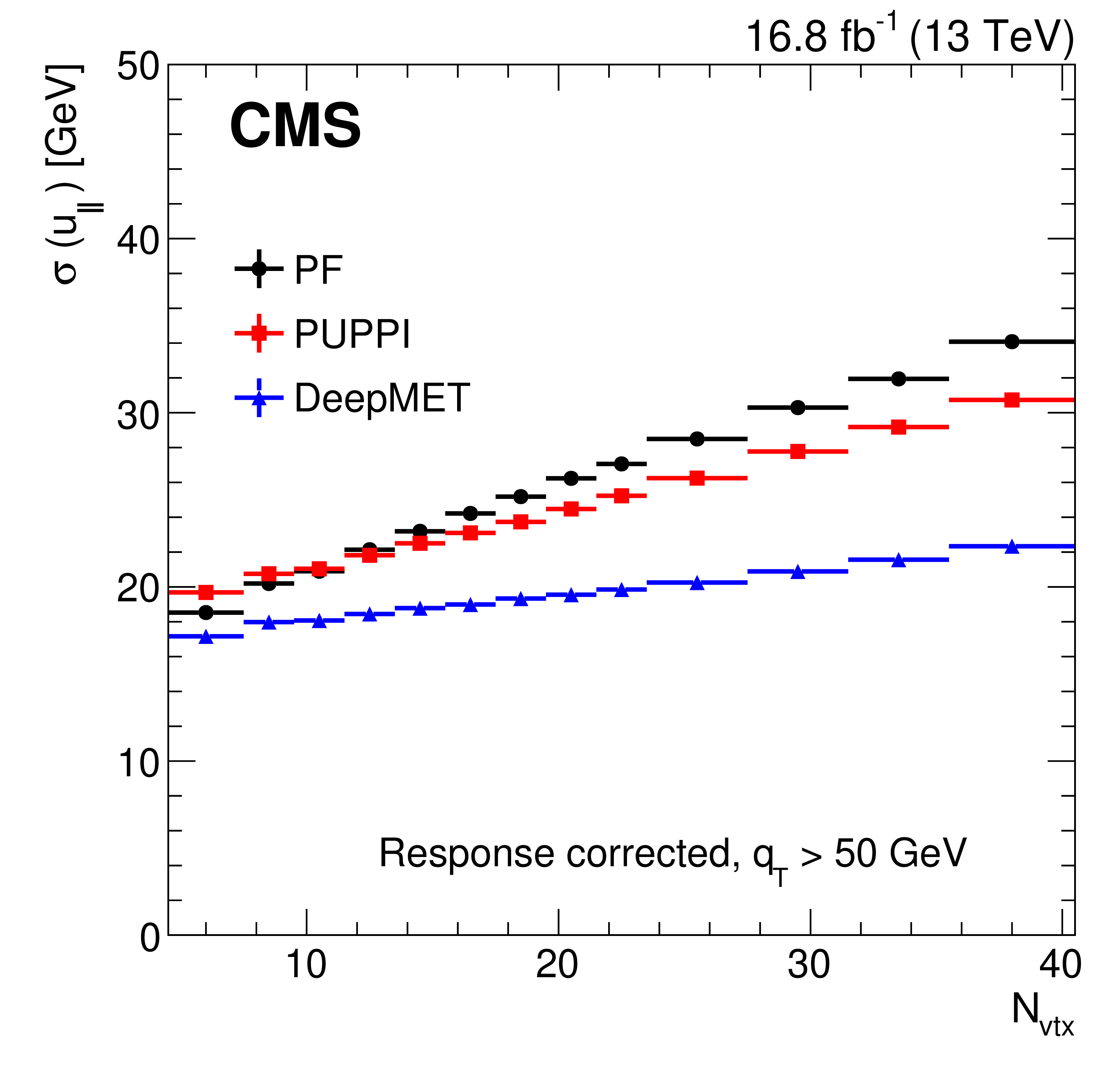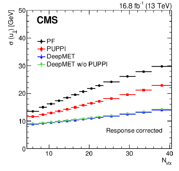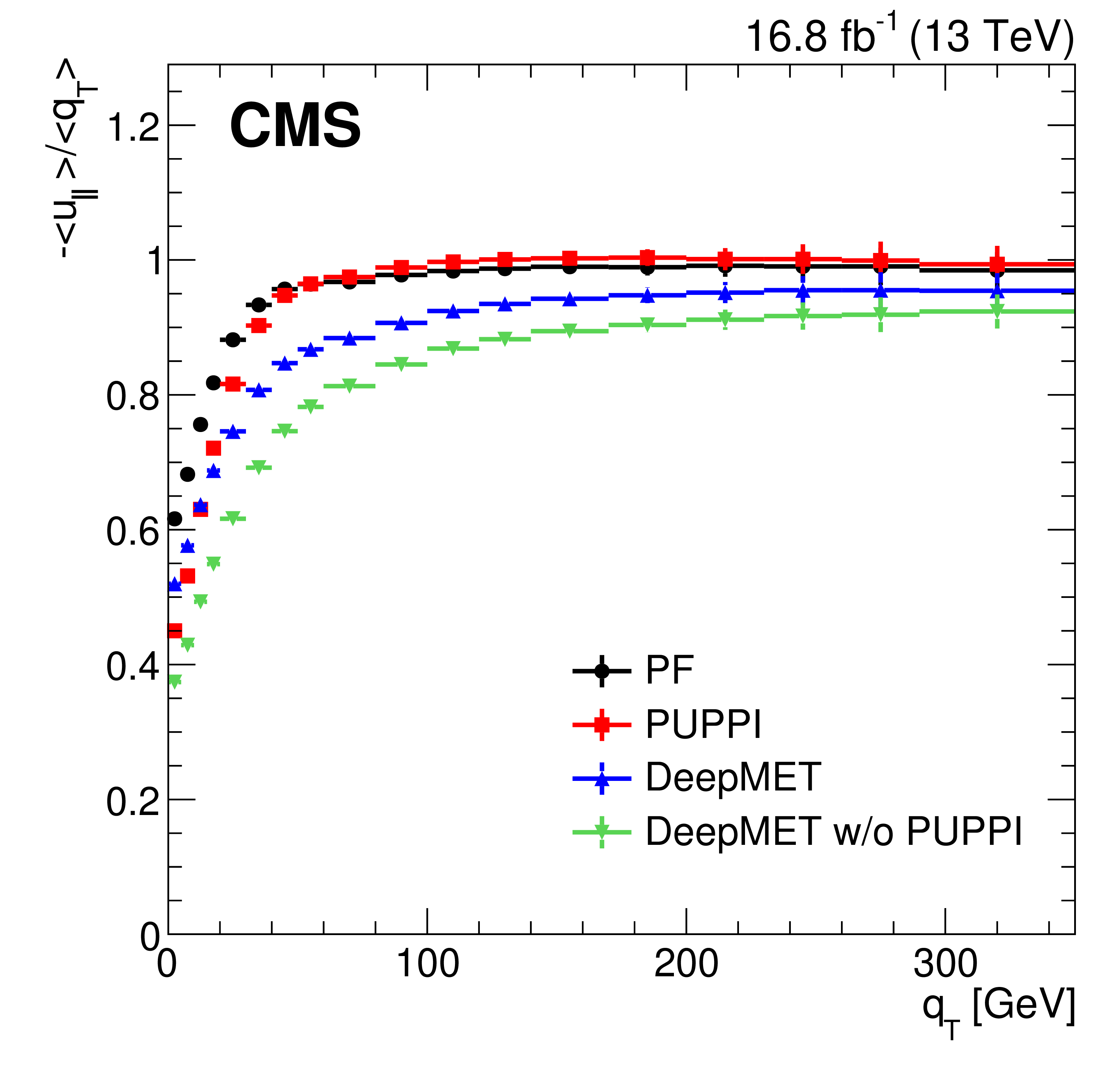 | Abstract: At hadron colliders, the net transverse momentum of particles that do not interact with the detector (missing transverse momentum, $ {\vec p}_{\mathrm{T}}^{\, \text{miss}} $) is a crucial observable in many analyses. In the standard model, $ {\vec p}_{\mathrm{T}}^{\, \text{miss}} $ originates from neutrinos. Many beyond-the-standard-model particles, such as dark matter candidates, are also expected to leave the experimental apparatus undetected. This paper presents a novel $ {\vec p}_{\mathrm{T}}^{\, \text{miss}} $ estimator, DEEPMET, which is based on deep neural networks that were developed by the CMS Collaboration at the LHC. The DEEPMET algorithm produces a weight for each reconstructed particle based on its properties. The estimator is based on the negative vector sum of the weighted transverse momenta of all reconstructed particles in an event. Compared with other estimators currently employed by CMS, DEEPMET improves the $ {\vec p}_{\mathrm{T}}^{\, \text{miss}} $ resolution by 10-30%, shows improvement for a wide range of final states, is easier to train, and is more resilient against the effects of additional proton-proton interactions accompanying the collision of interest. | ||
