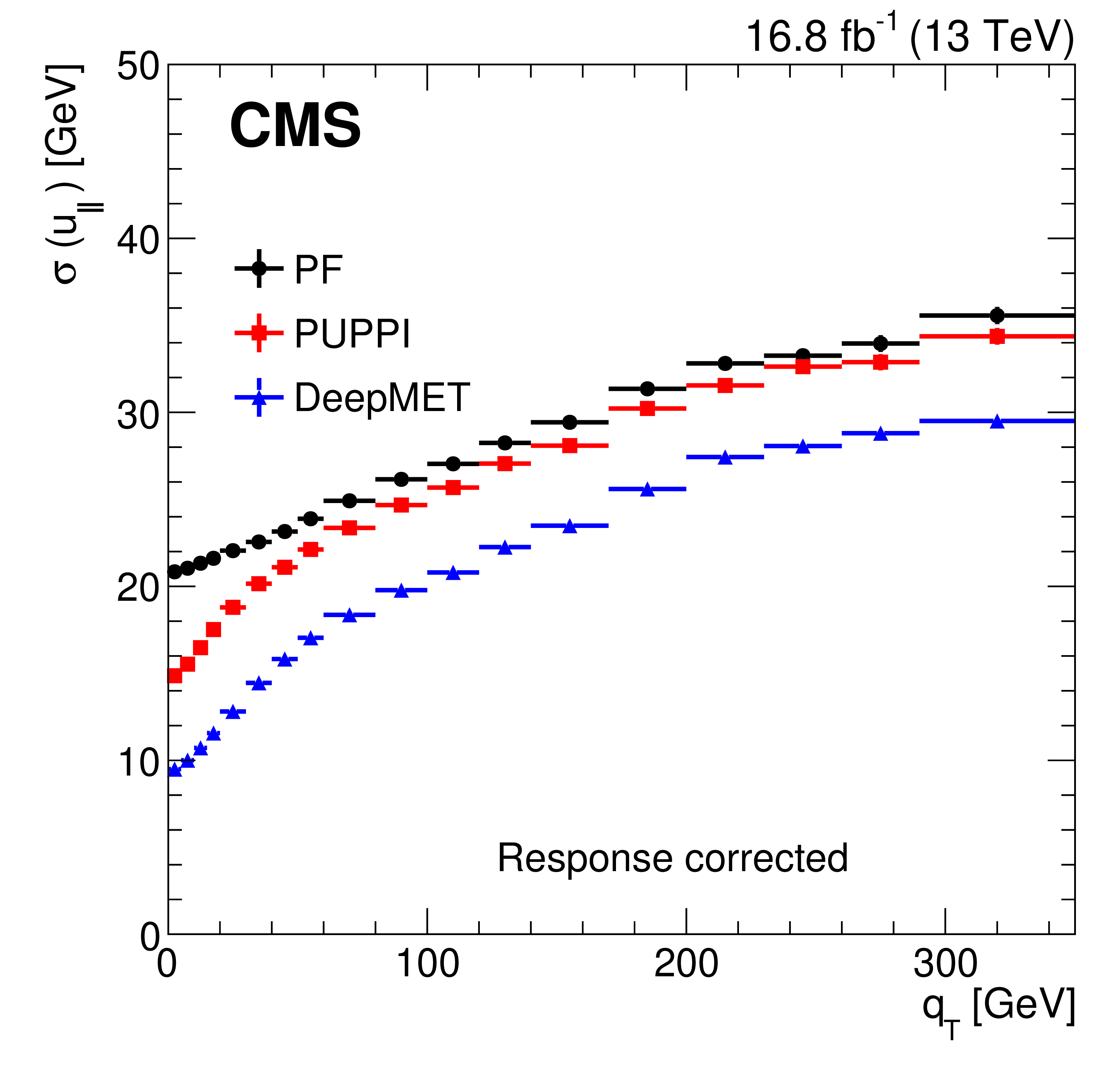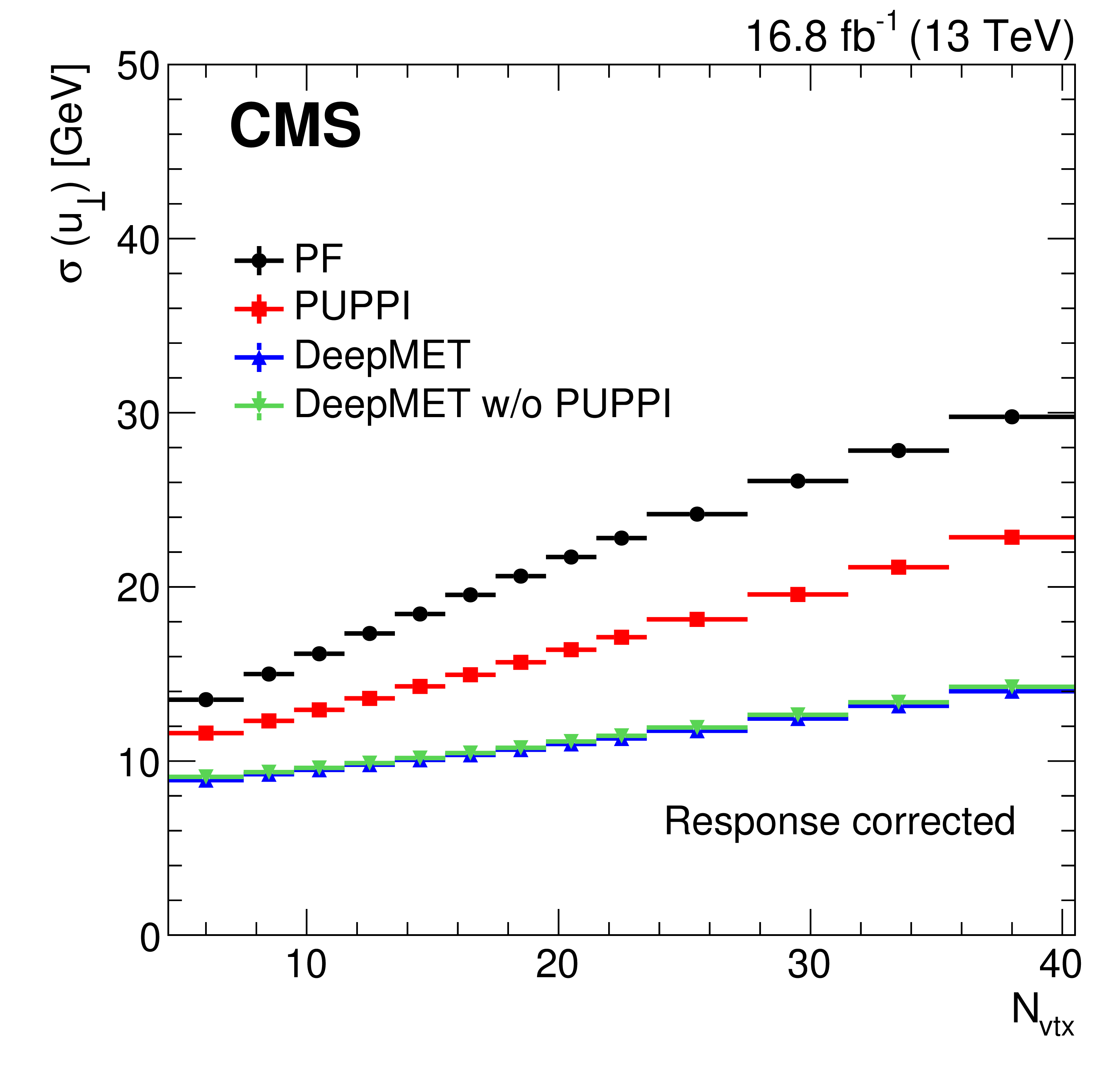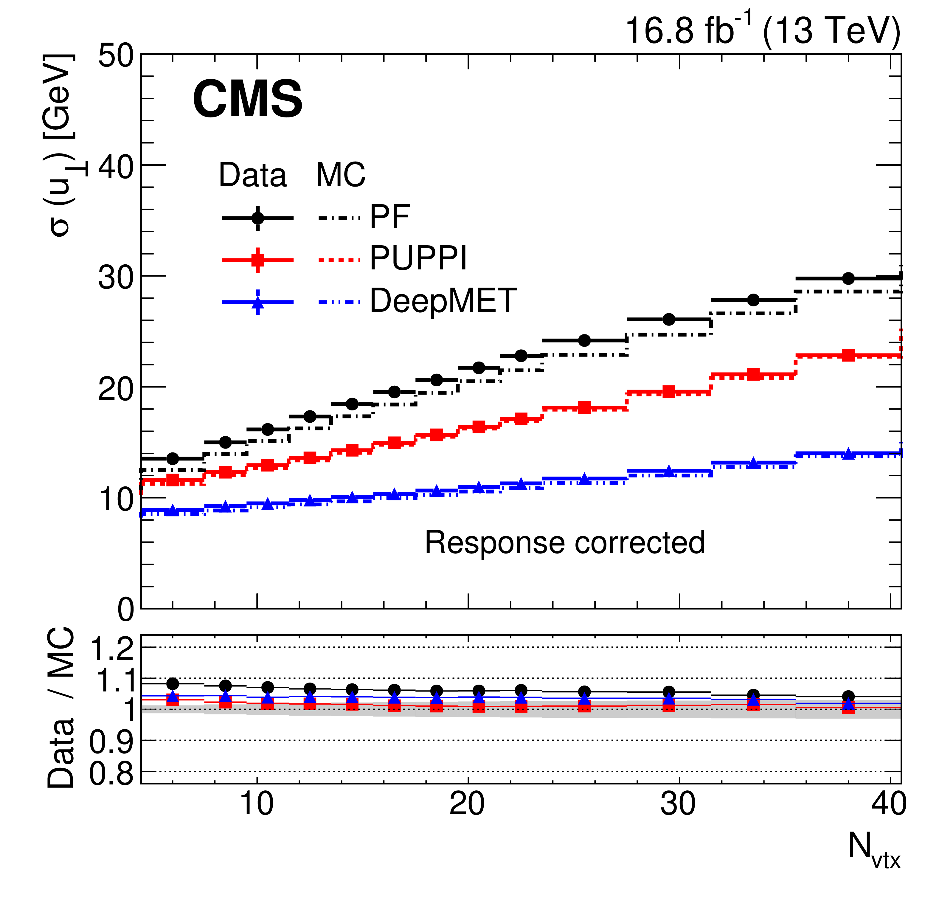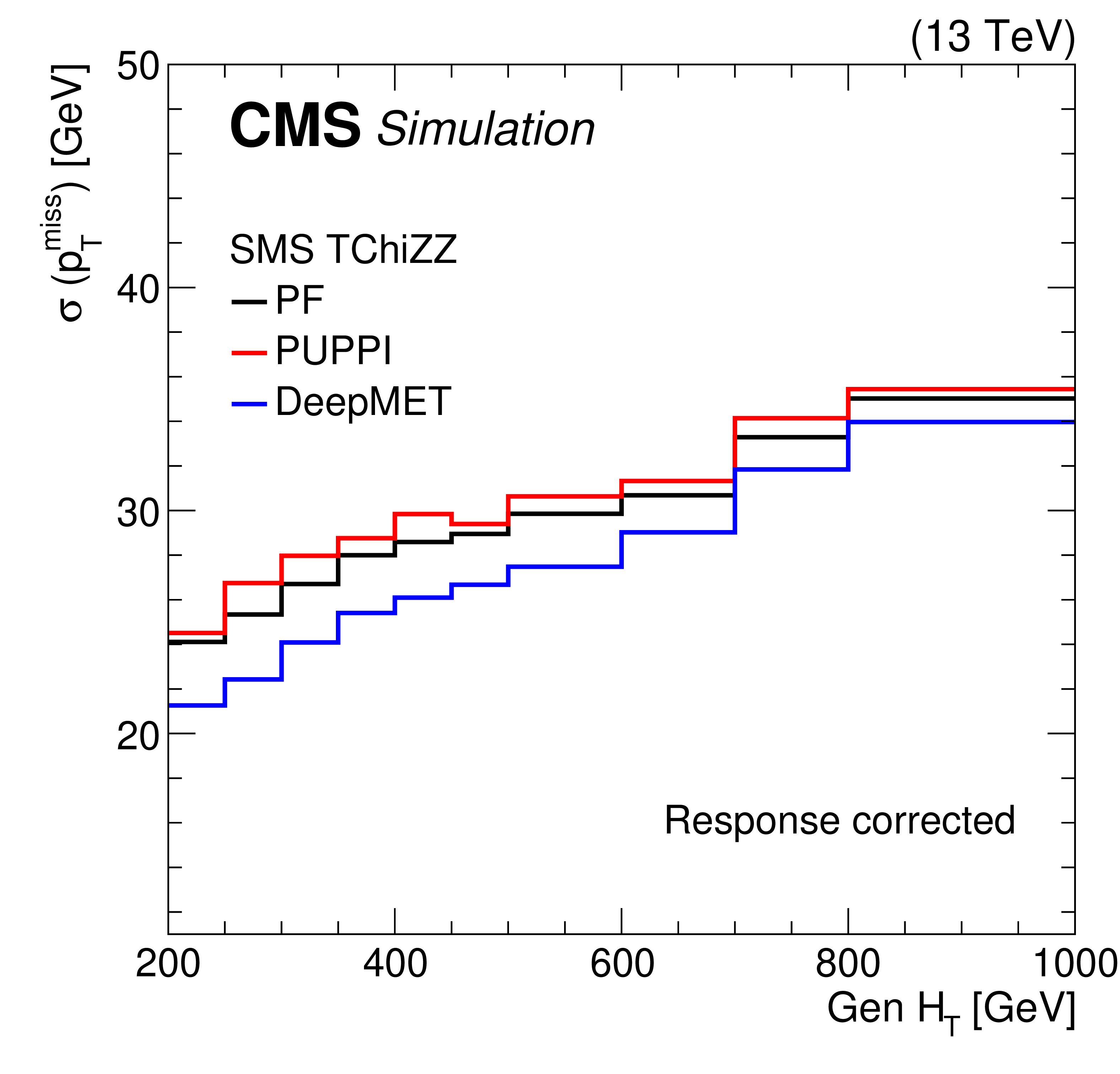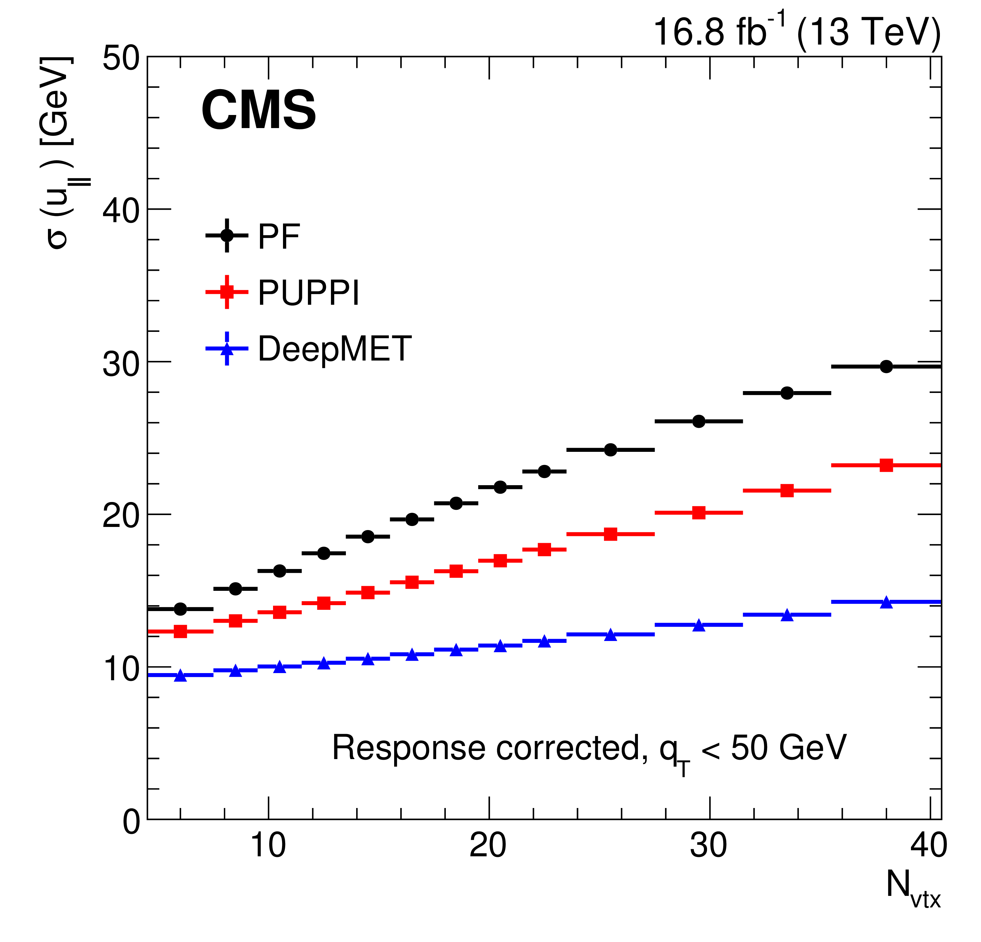 | Abstract: At hadron colliders, the net transverse momentum of particles that do not interact with the detector (missing transverse momentum, $ {\vec p}_{\mathrm{T}}^{\, \text{miss}} $) is a crucial observable in many analyses. In the standard model, $ {\vec p}_{\mathrm{T}}^{\, \text{miss}} $ originates from neutrinos. Many beyond-the-standard-model particles, such as dark matter candidates, are also expected to leave the experimental apparatus undetected. This paper presents a novel $ {\vec p}_{\mathrm{T}}^{\, \text{miss}} $ estimator, DEEPMET, which is based on deep neural networks that were developed by the CMS Collaboration at the LHC. The DEEPMET algorithm produces a weight for each reconstructed particle based on its properties. The estimator is based on the negative vector sum of the weighted transverse momenta of all reconstructed particles in an event. Compared with other estimators currently employed by CMS, DEEPMET improves the $ {\vec p}_{\mathrm{T}}^{\, \text{miss}} $ resolution by 10-30%, shows improvement for a wide range of final states, is easier to train, and is more resilient against the effects of additional proton-proton interactions accompanying the collision of interest. | ||