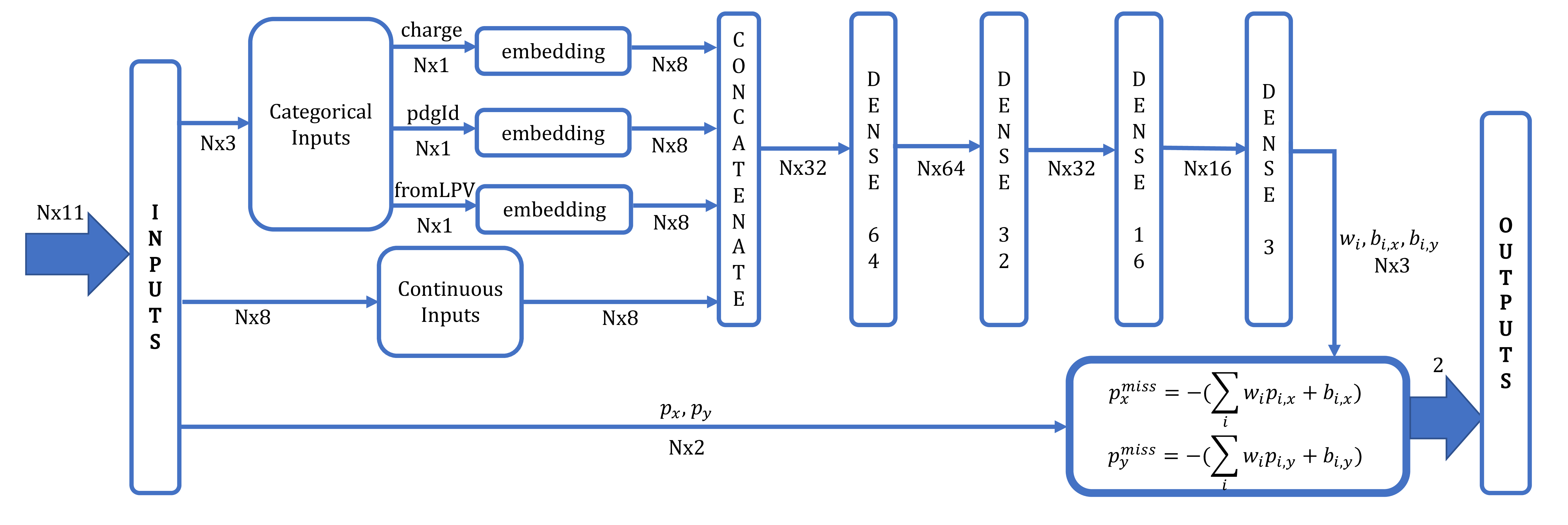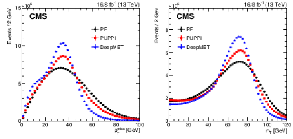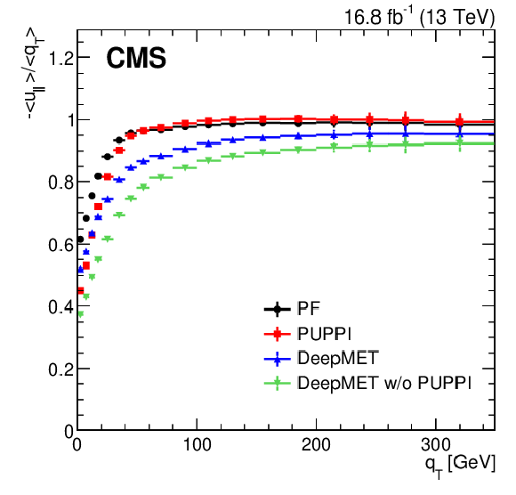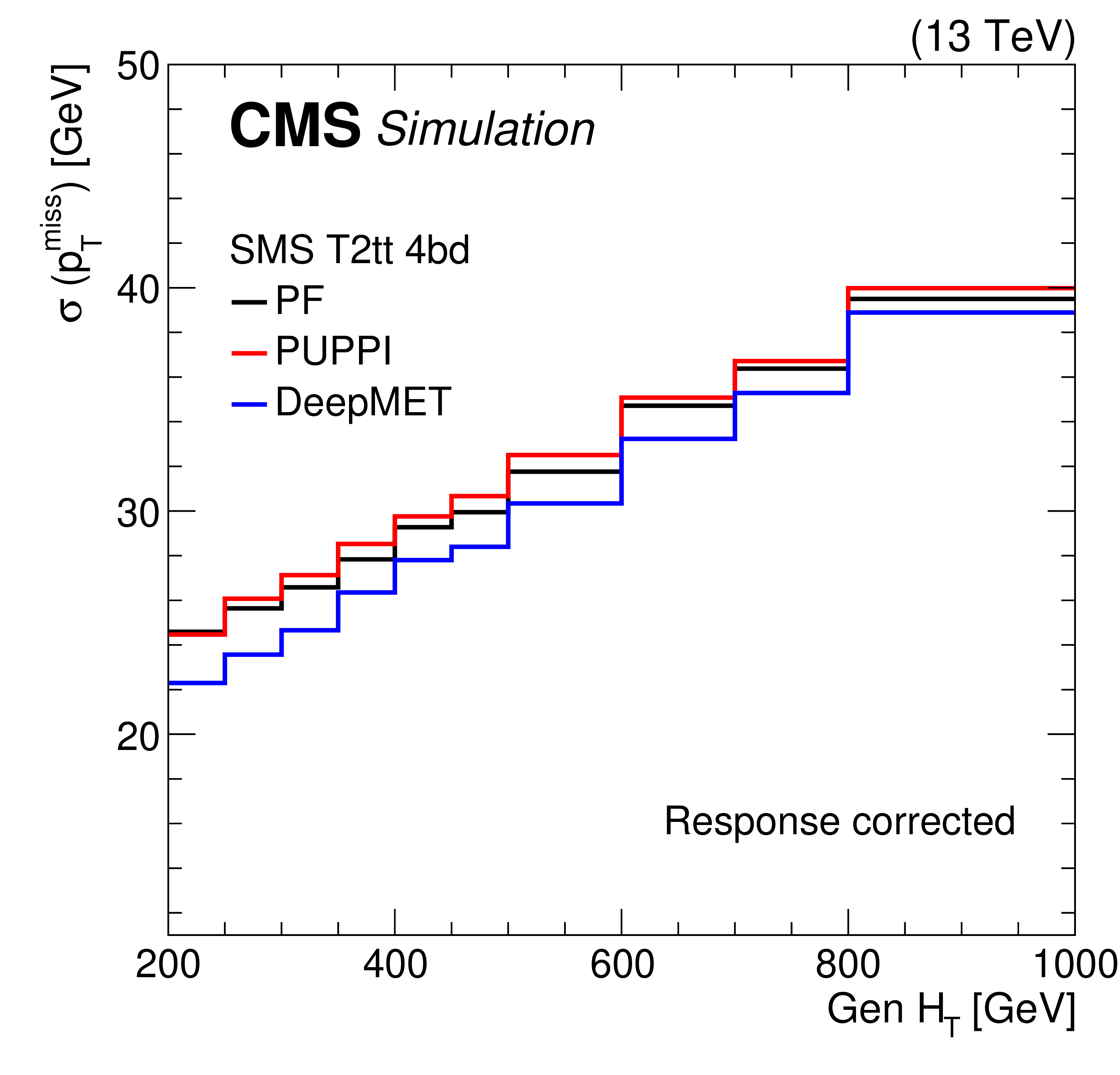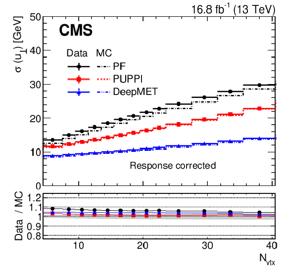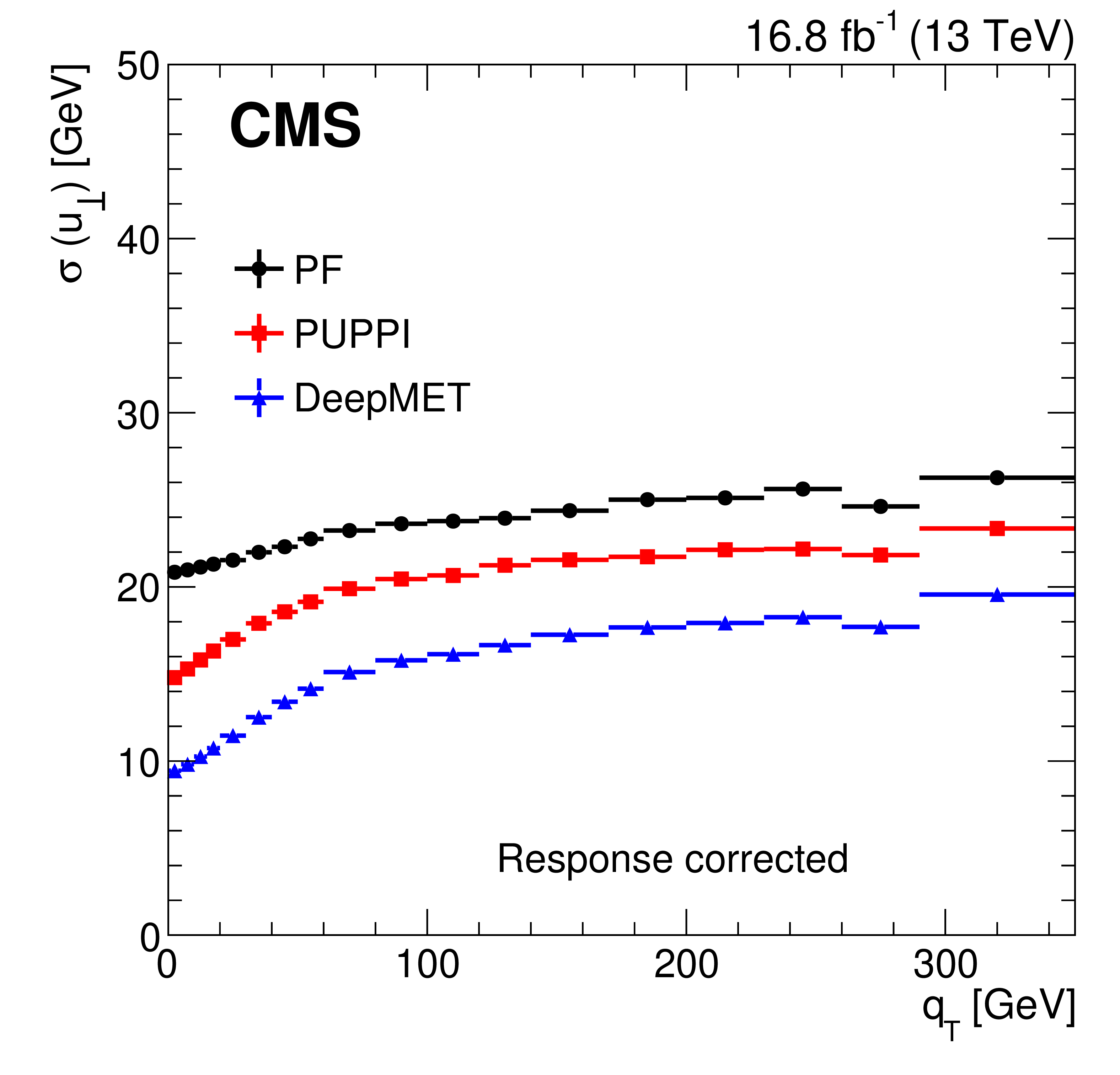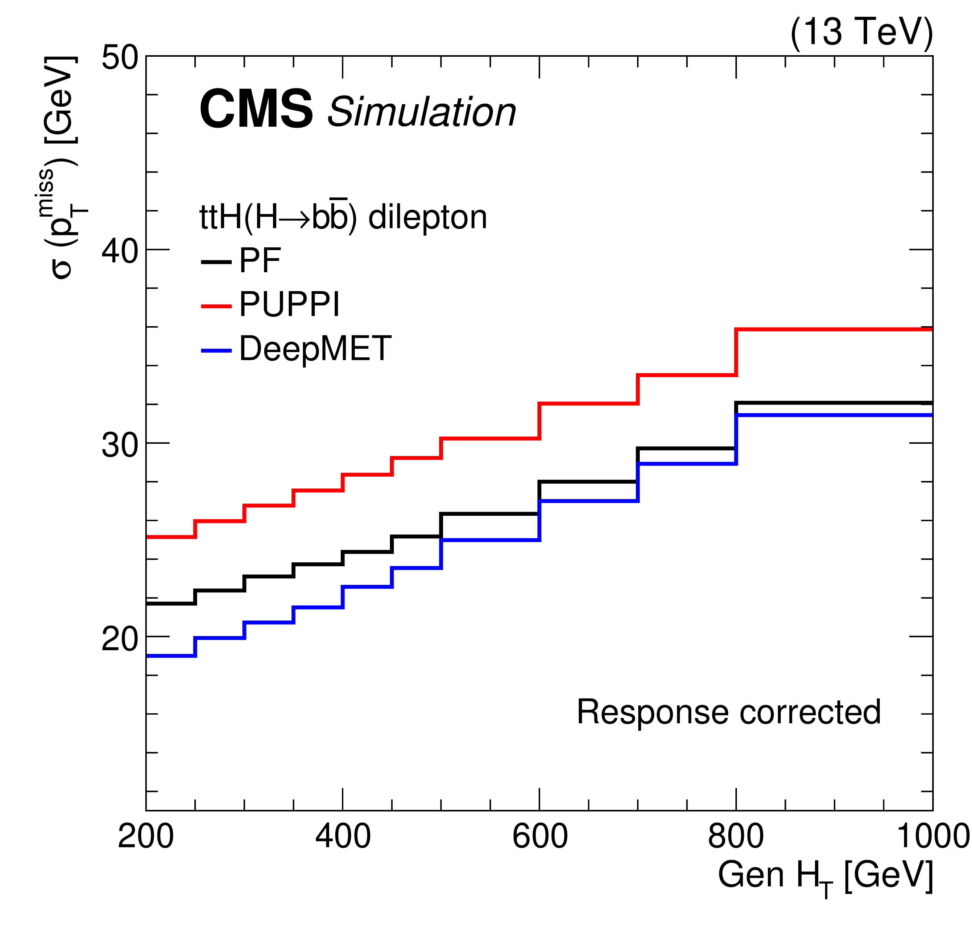 | Abstract: At hadron colliders, the net transverse momentum of particles that do not interact with the detector (missing transverse momentum, $ {\vec p}_{\mathrm{T}}^{\, \text{miss}} $) is a crucial observable in many analyses. In the standard model, $ {\vec p}_{\mathrm{T}}^{\, \text{miss}} $ originates from neutrinos. Many beyond-the-standard-model particles, such as dark matter candidates, are also expected to leave the experimental apparatus undetected. This paper presents a novel $ {\vec p}_{\mathrm{T}}^{\, \text{miss}} $ estimator, DEEPMET, which is based on deep neural networks that were developed by the CMS Collaboration at the LHC. The DEEPMET algorithm produces a weight for each reconstructed particle based on its properties. The estimator is based on the negative vector sum of the weighted transverse momenta of all reconstructed particles in an event. Compared with other estimators currently employed by CMS, DEEPMET improves the $ {\vec p}_{\mathrm{T}}^{\, \text{miss}} $ resolution by 10-30%, shows improvement for a wide range of final states, is easier to train, and is more resilient against the effects of additional proton-proton interactions accompanying the collision of interest. | ||