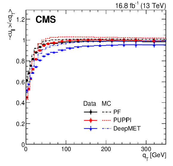 Recoil responses of different $ {\vec p}_{\mathrm{T}}^{\, \text{miss}} $ estimators in data (markers) and MC simulations (dashed) after the $ \mathrm{Z}\to\mu\mu $ selections. |