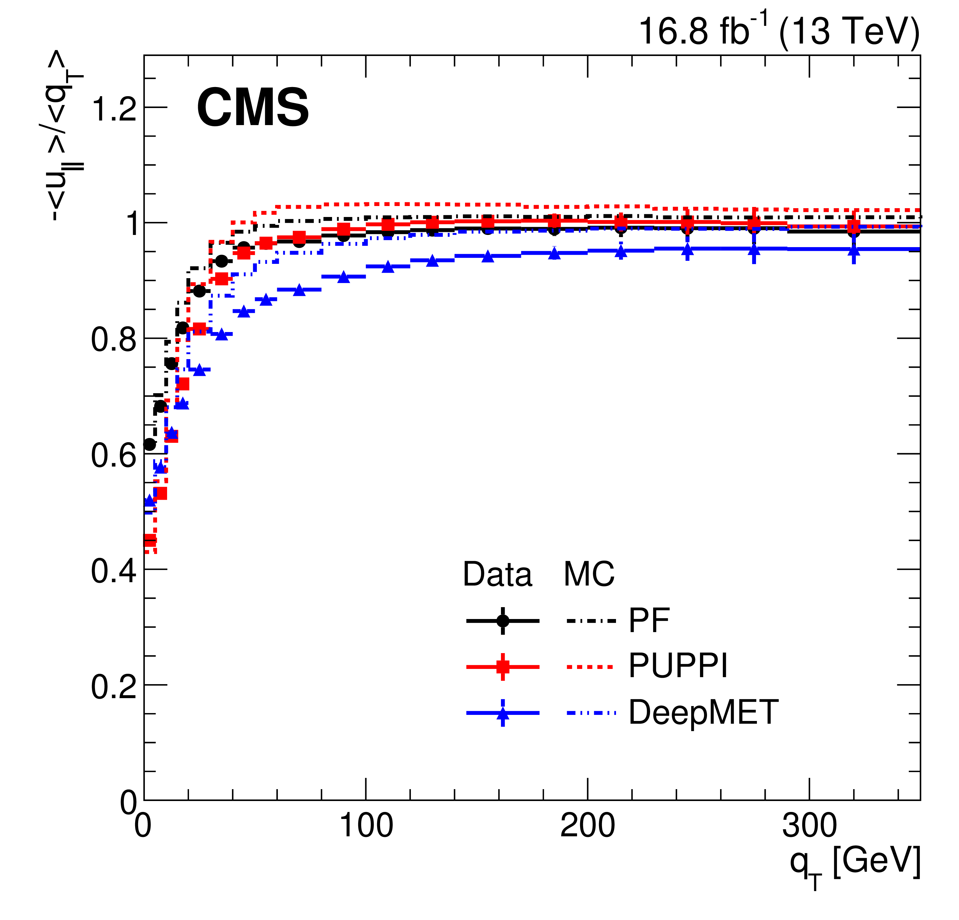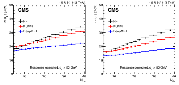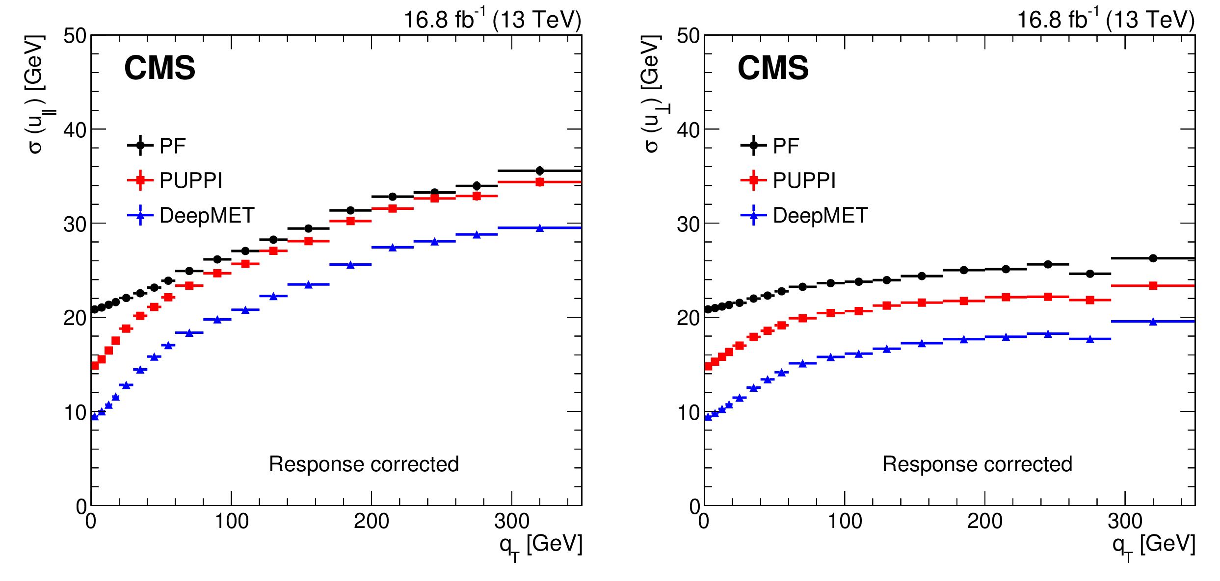 Response-corrected resolutions of $ u_{\parallel} $ (left) and $ u_{\perp} $ (right) vs. $ q_{\mathrm{T}} $ of different $ {\vec p}_{\mathrm{T}}^{\, \text{miss}} $ estimators in data after the $ \mathrm{Z}\to\mu\mu $ selections. |