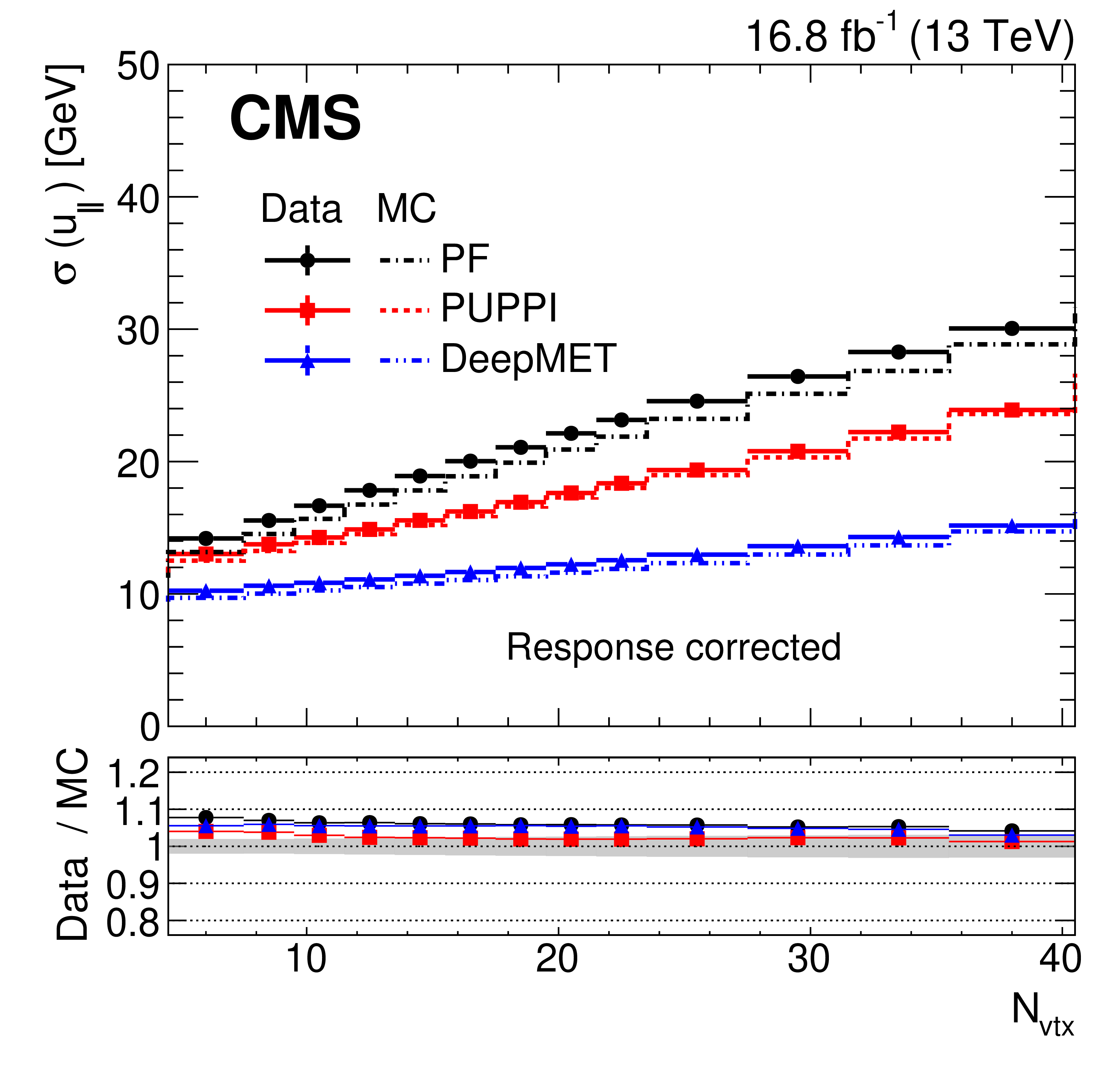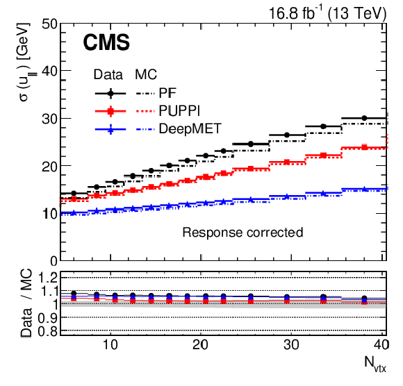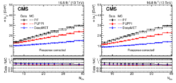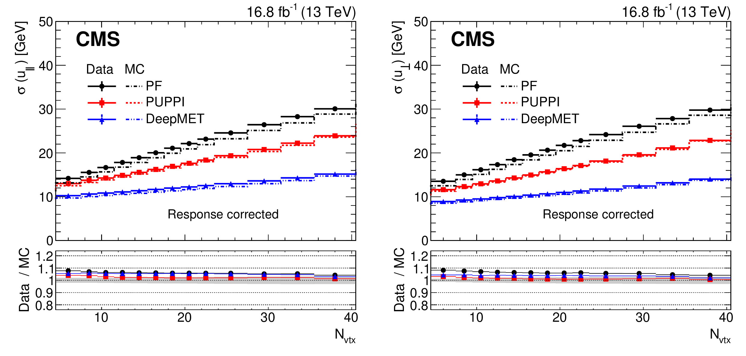 Response-corrected resolutions of $ u_{\parallel} $ (left) and $ u_{\perp} $ (right) vs. $ $ number of reconstructed PVs of different $ {\vec p}_{\mathrm{T}}^{\, \text{miss}} $ estimators in data (solid) and MC simulations (dashed) after the $ \mathrm{Z}\to\mu\mu $ selections. The systematic uncertainties for PUPPI $ {\vec p}_{\mathrm{T}}^{\, \text{miss}} $ due to the JES, the JER, and $ E_U $ are added in quadrature and displayed with the gray band. |