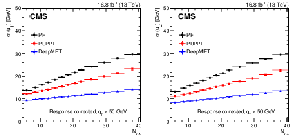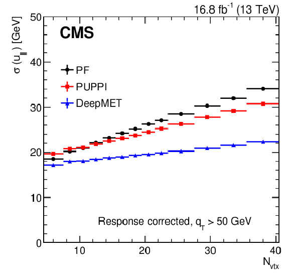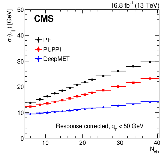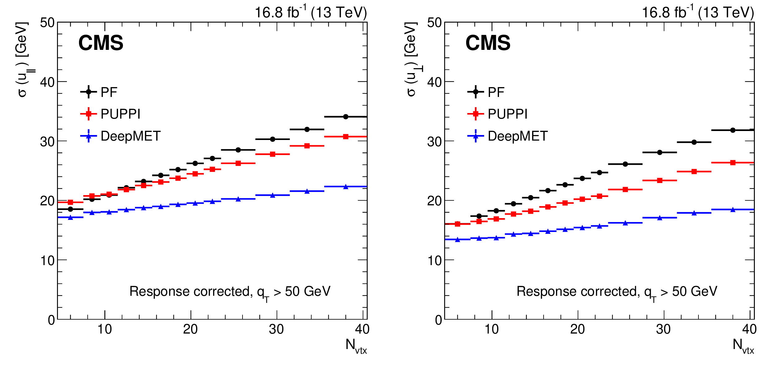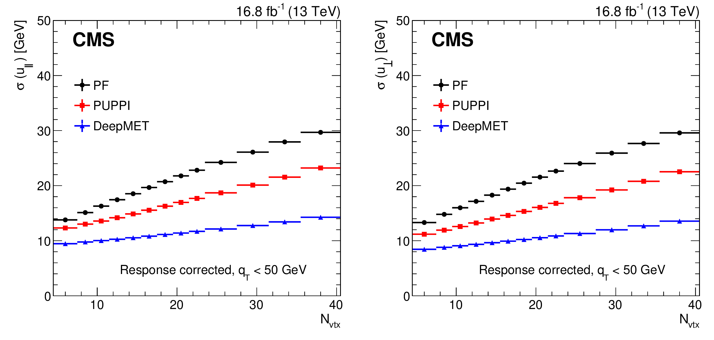 Response-corrected resolutions of $ u_{\parallel} $ (left) and $ u_{\perp} $ (right) vs. $ $ number of reconstructed PVs of different $ {\vec p}_{\mathrm{T}}^{\, \text{miss}} $ estimators in data after the $ \mathrm{Z}\to\mu\mu $ selections in the region with $ q_{\mathrm{T}} $ smaller than 50 GeV. |