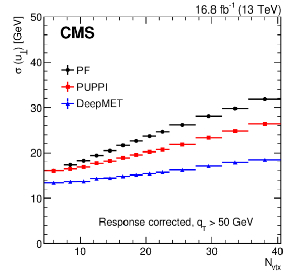 Response-corrected resolutions of $ u_{\parallel} $ (left) and $ u_{\perp} $ (right) vs. $ $ number of reconstructed PVs of different $ {\vec p}_{\mathrm{T}}^{\, \text{miss}} $ estimators in data after the $ \mathrm{Z}\to\mu\mu $ selections in the region with $ q_{\mathrm{T}} $ larger than 50 GeV. |