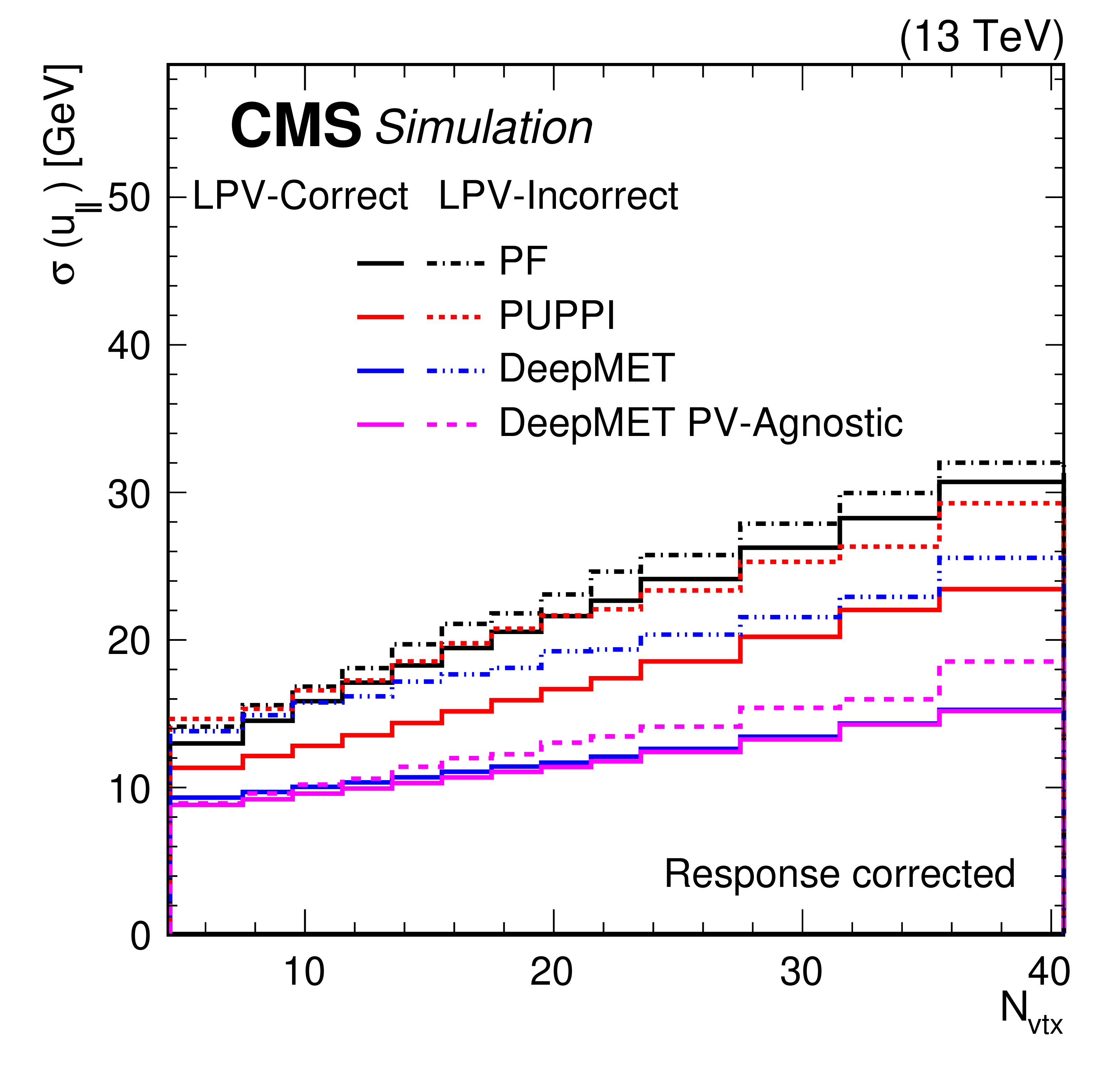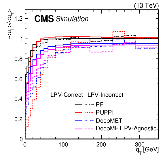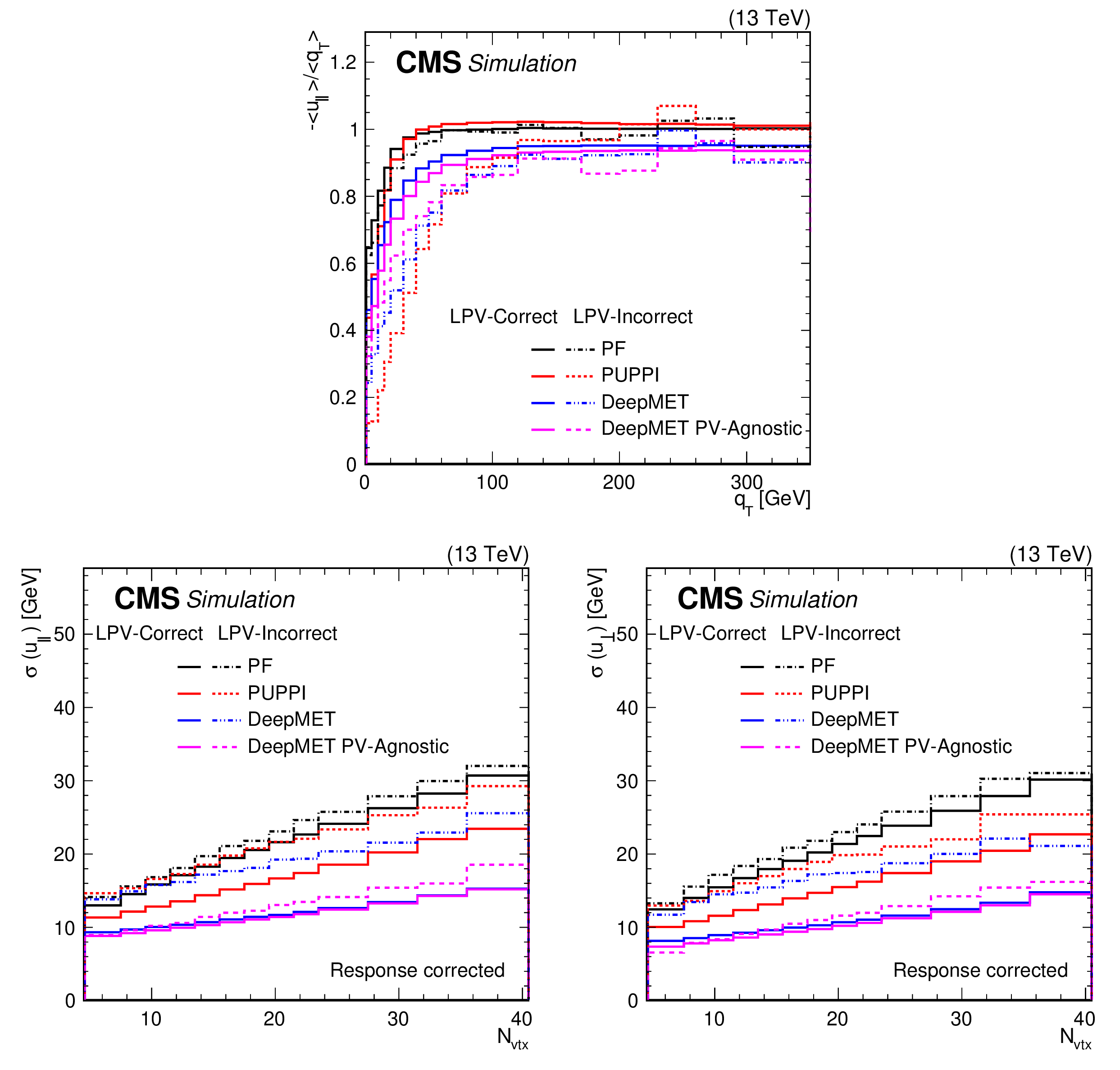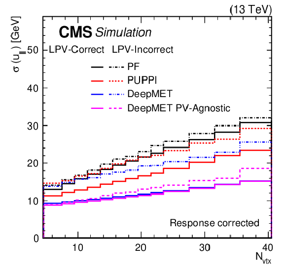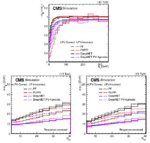 Response (upper), response-corrected resolutions of $ u_{\parallel} $ (lower left) and $ u_{\perp} $ (lower right) of different $ {\vec p}_{\mathrm{T}}^{\, \text{miss}} $ estimators in W+jets MC simulations. Solid (dashed) lines are from events where the LPV is (in)correctly identified. |