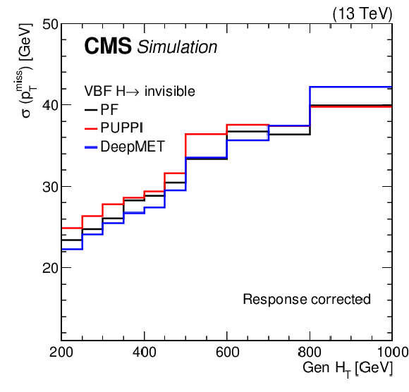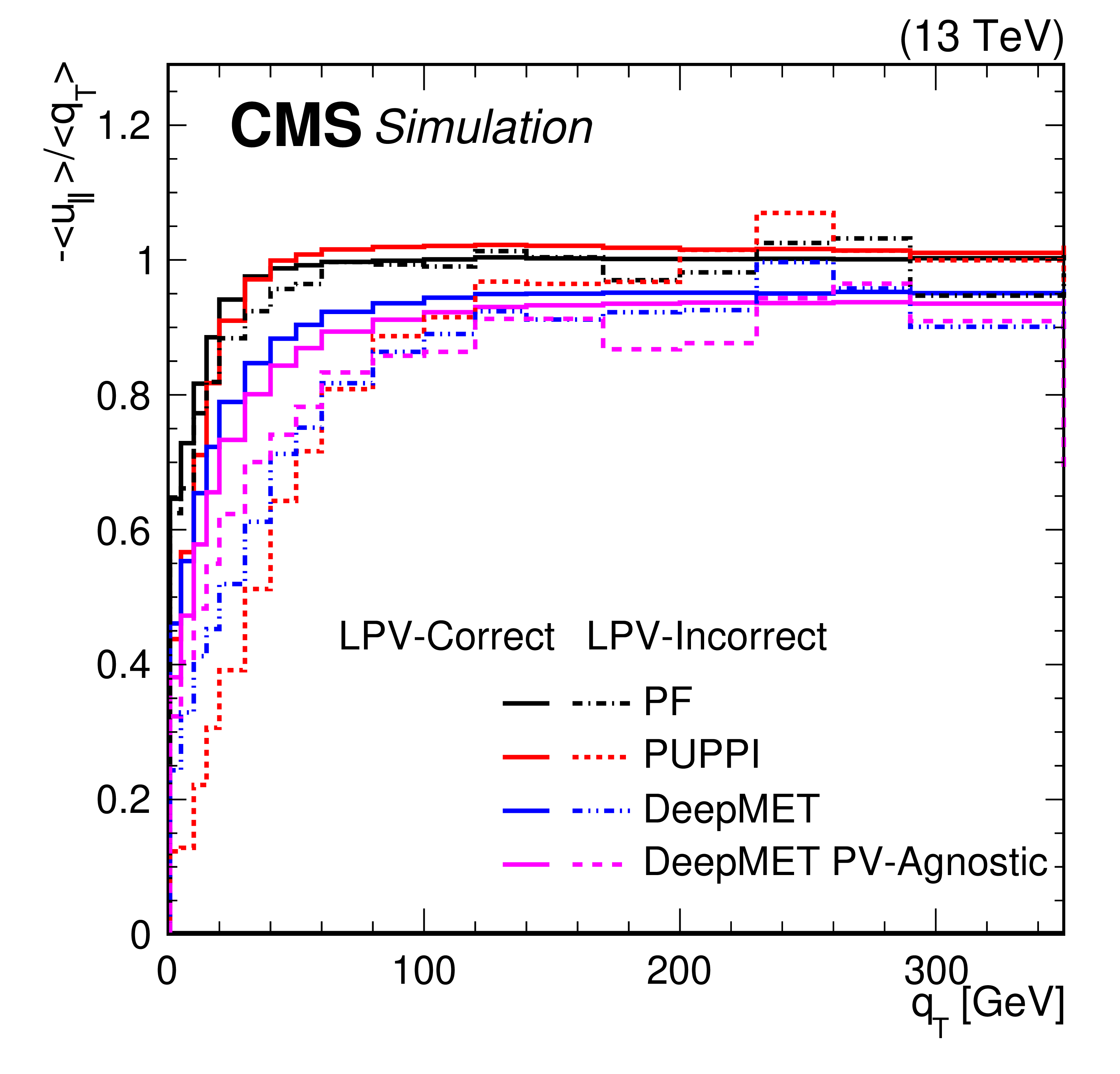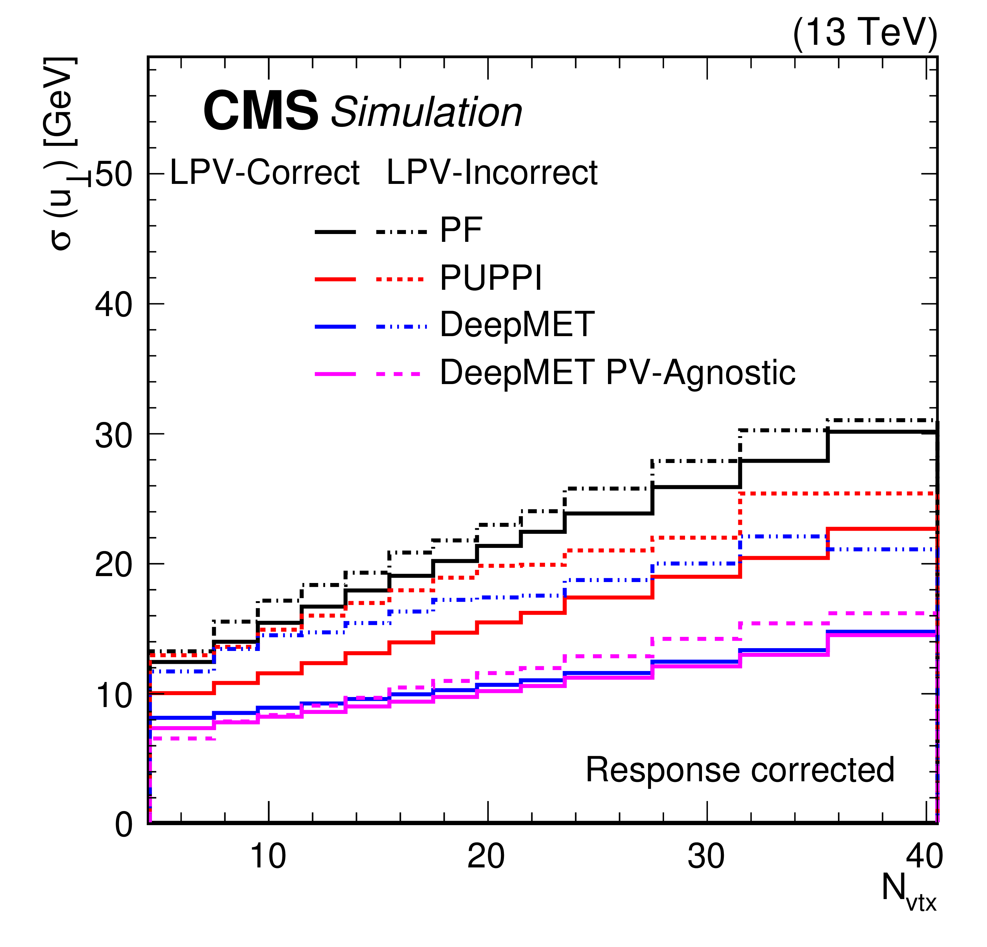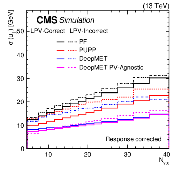 | This paper presents a new $ {\vec p}_{\mathrm{T}}^{\, \text{miss}} $ estimator, DEEPMET, which is based on a deep neural network. The DEEPMET algorithm utilizes each individual particle reconstructed by the CMS particle-flow algorithm as input and assigns a weight $ w_i $ and two bias terms, $ b_{i,x} $ and $ b_{i,y} $, to each candidate. The estimated $ {\vec p}_{\mathrm{T}}^{\, \text{miss}} $ is the negative vector sum of the weighted transverse momenta of all candidates, plus their bias contributions. With 4541 trainable parameters, the training and deployment of DEEPMET is computationally efficient. DEEPMET is trained using Z+jets and $ \mathrm{t} \overline{\mathrm{t}} $ samples, but achieves 10-30% better resolution compared with the current PF and PUPPI $ {\vec p}_{\mathrm{T}}^{\, \text{miss}} $ estimators across multiple physics processes, such as Z+jets, W+jets, Higgs boson production, and processes with dark matter candidates. Another important feature of the DEEPMET algorithm is its high resilience to pileup, improving the physics reach in LHC Run 2 and Run 3, and future High-Luminosity LHC conditions. Specifically for the measurement of the W boson mass, a PV-Agnostic version of DEEPMET is designed to be more robust in $ \mathrm{W} \to \mu\nu $ events where the LPV is not always identified correctly. Events containing $ \mathrm{Z} \to \mu\mu $ decays are used to calibrate $ {\vec p}_{\mathrm{T}}^{\, \text{miss}} $, including corrections for asymmetries in detector response, as well as for $ {\vec p}_{\mathrm{T}}^{\, \text{miss}} $ scale and resolution. Good agreement between data and simulation is found. The DEEPMET estimator demonstrates the potential to improve the precision of SM measurements and to achieve higher sensitivity in beyond the standard model physics searches. |