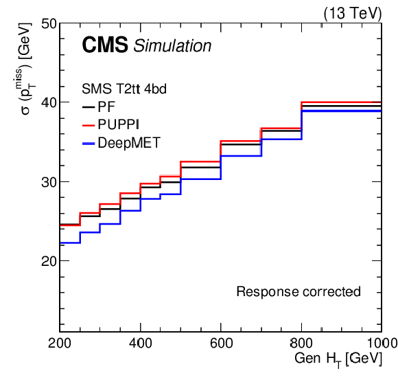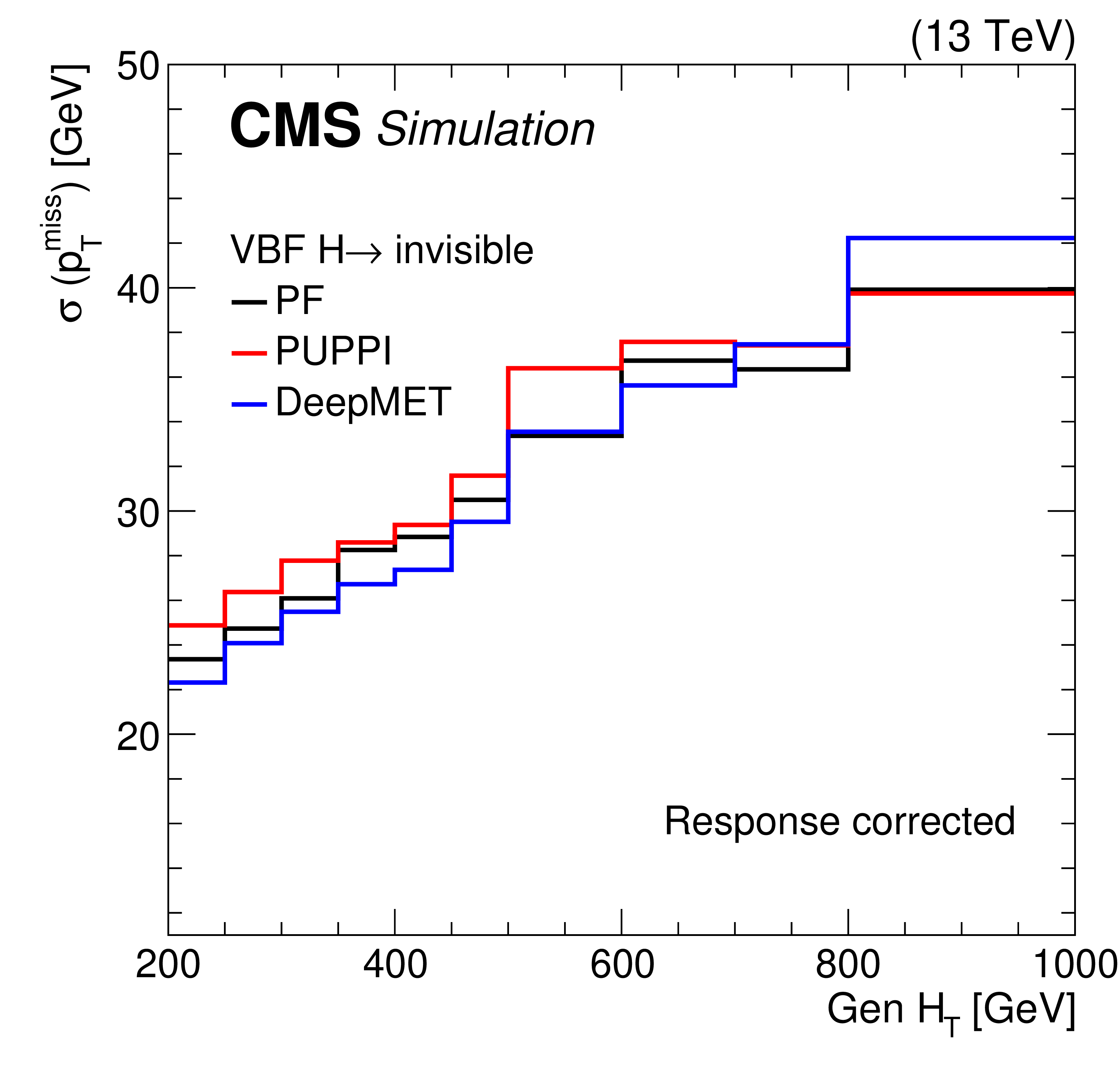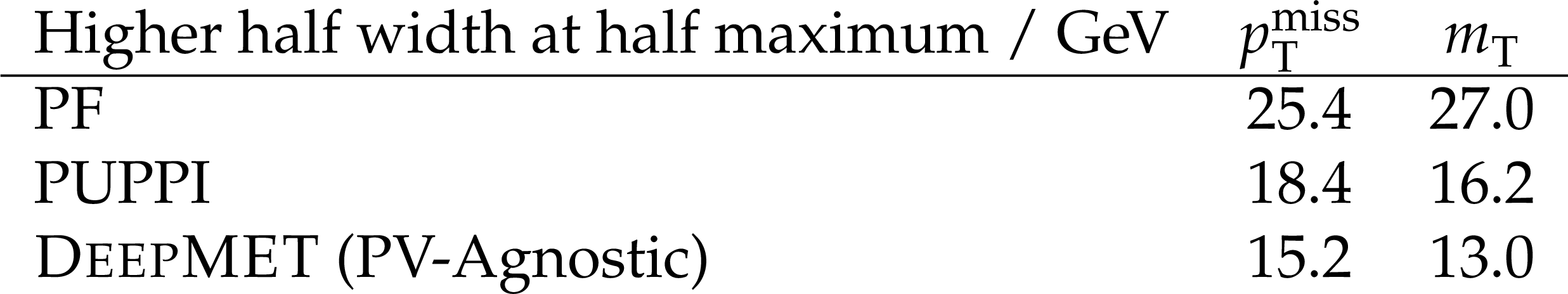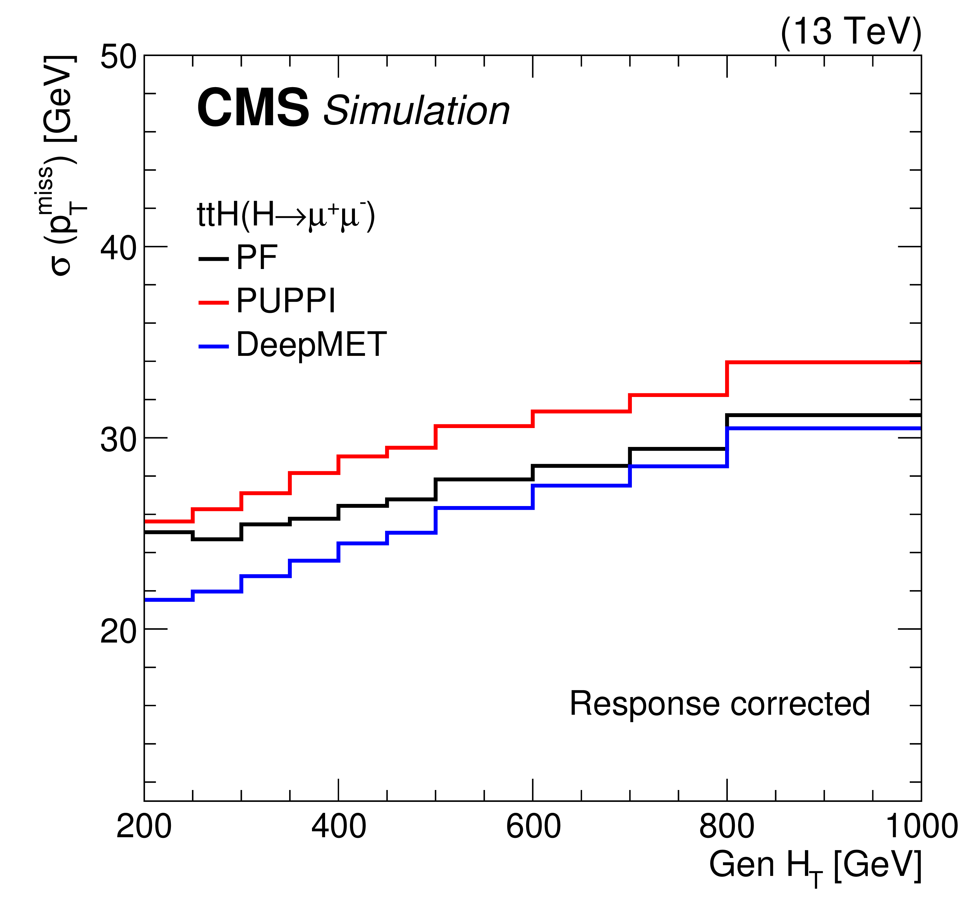| This paper presents a new $ {\vec p}_{\mathrm{T}}^{\, \text{miss}} $ estimator, DEEPMET, which is based on a deep neural network. The DEEPMET algorithm utilizes each individual particle reconstructed by the CMS particle-flow algorithm as input and assigns a weight $ w_i $ and two bias terms, $ b_{i,x} $ and $ b_{i,y} $, to each candidate. The estimated $ {\vec p}_{\mathrm{T}}^{\, \text{miss}} $ is the negative vector sum of the weighted transverse momenta of all candidates, plus their bias contributions. With 4541 trainable parameters, the training and deployment of DEEPMET is computationally efficient. DEEPMET is trained using Z+jets and $ \mathrm{t} \overline{\mathrm{t}} $ samples, but achieves 10-30% better resolution compared with the current PF and PUPPI $ {\vec p}_{\mathrm{T}}^{\, \text{miss}} $ estimators across multiple physics processes, such as Z+jets, W+jets, Higgs boson production, and processes with dark matter candidates. Another important feature of the DEEPMET algorithm is its high resilience to pileup, improving the physics reach in LHC Run 2 and Run 3, and future High-Luminosity LHC conditions. Specifically for the measurement of the W boson mass, a PV-Agnostic version of DEEPMET is designed to be more robust in $ \mathrm{W} \to \mu\nu $ events where the LPV is not always identified correctly. Events containing $ \mathrm{Z} \to \mu\mu $ decays are used to calibrate $ {\vec p}_{\mathrm{T}}^{\, \text{miss}} $, including corrections for asymmetries in detector response, as well as for $ {\vec p}_{\mathrm{T}}^{\, \text{miss}} $ scale and resolution. Good agreement between data and simulation is found. The DEEPMET estimator demonstrates the potential to improve the precision of SM measurements and to achieve higher sensitivity in beyond the standard model physics searches. |