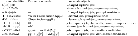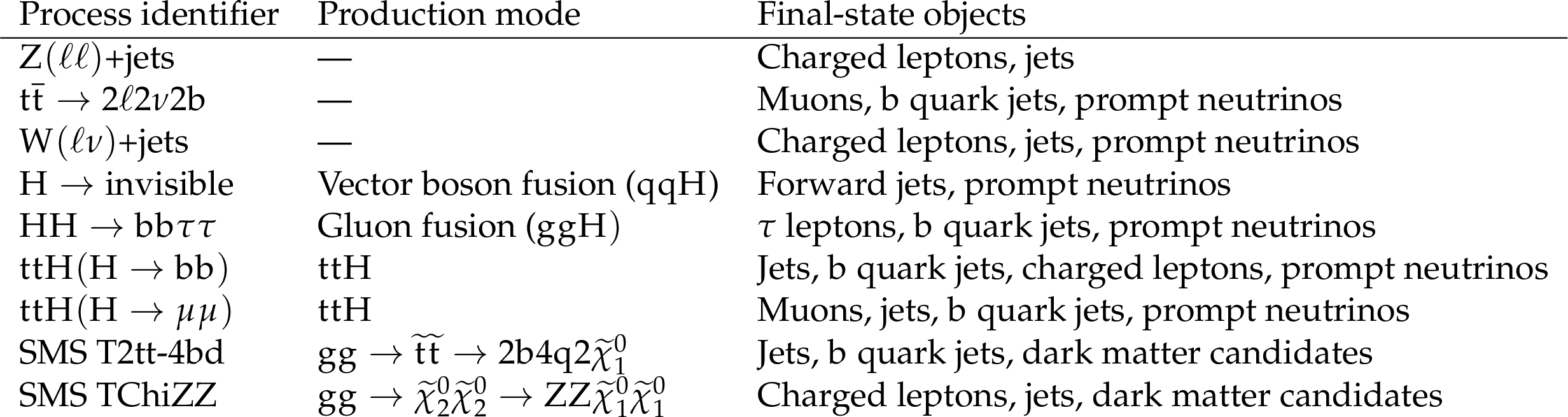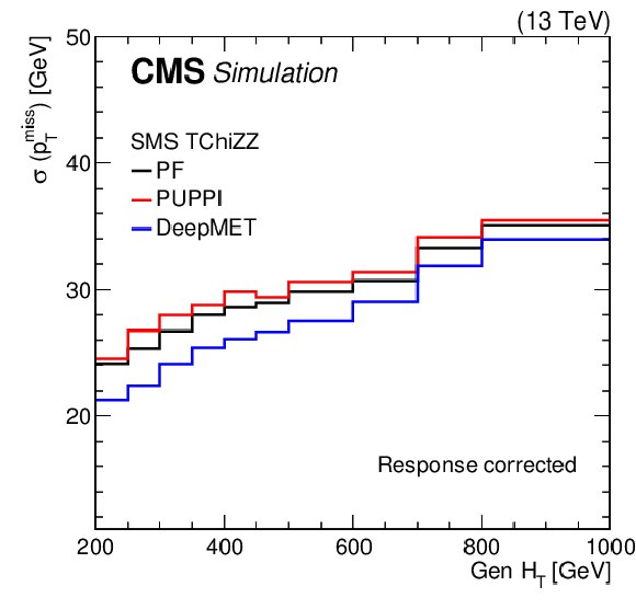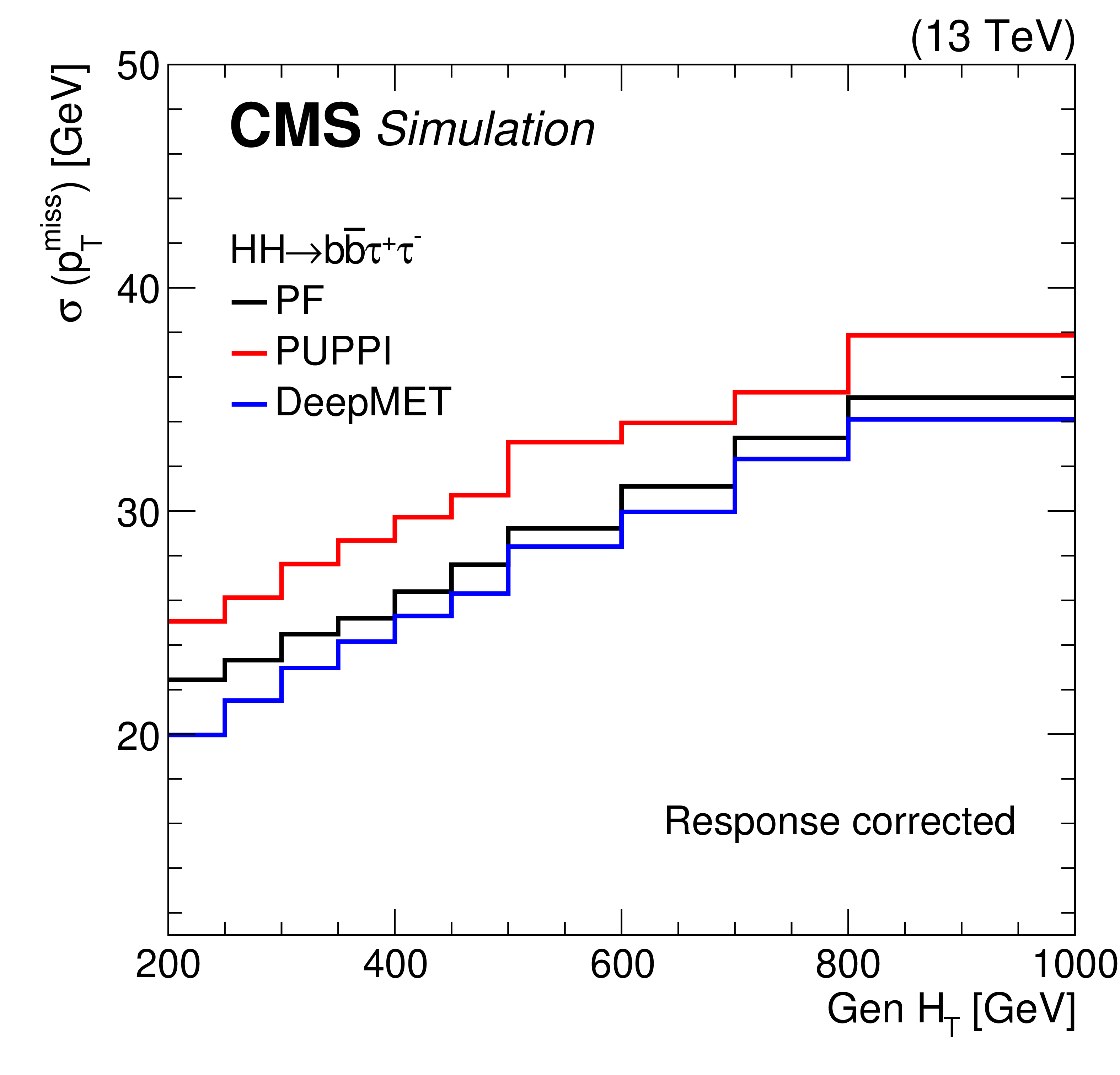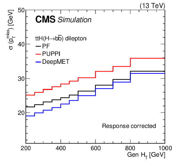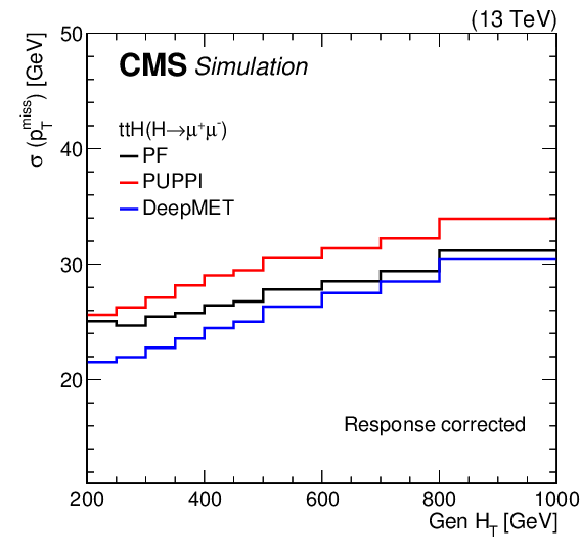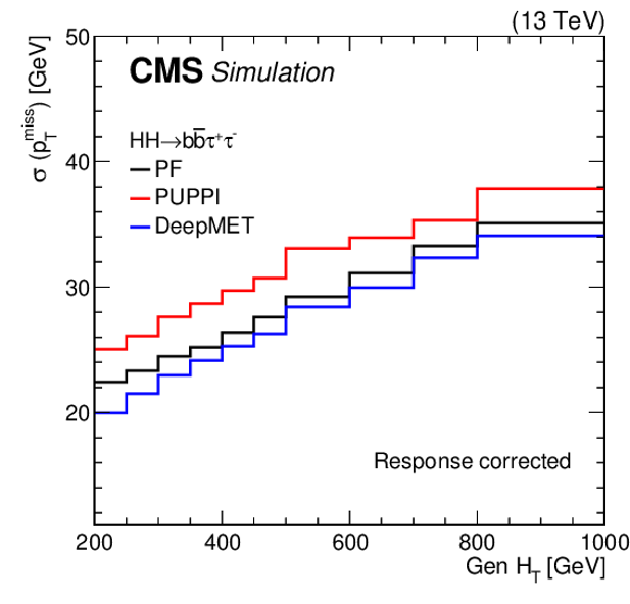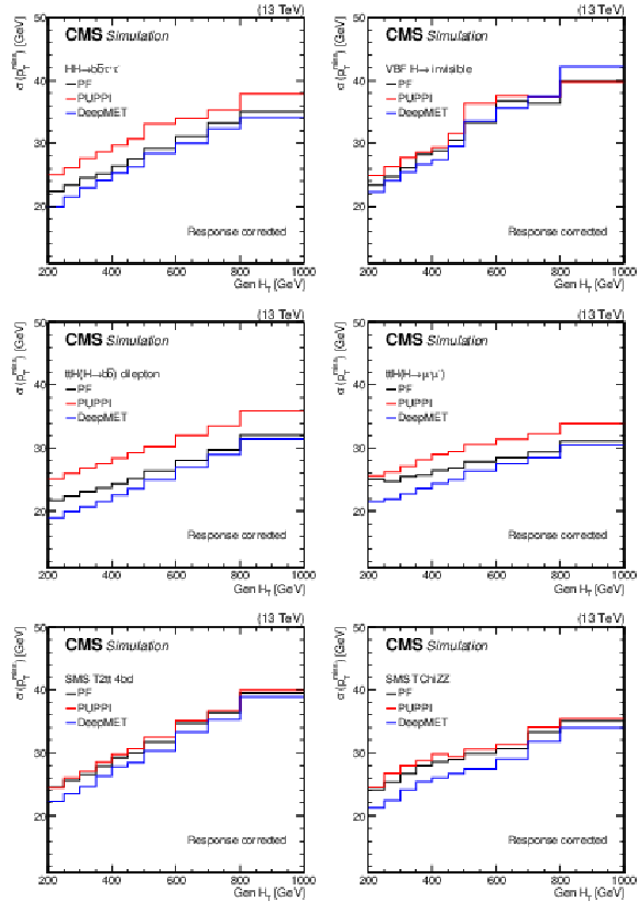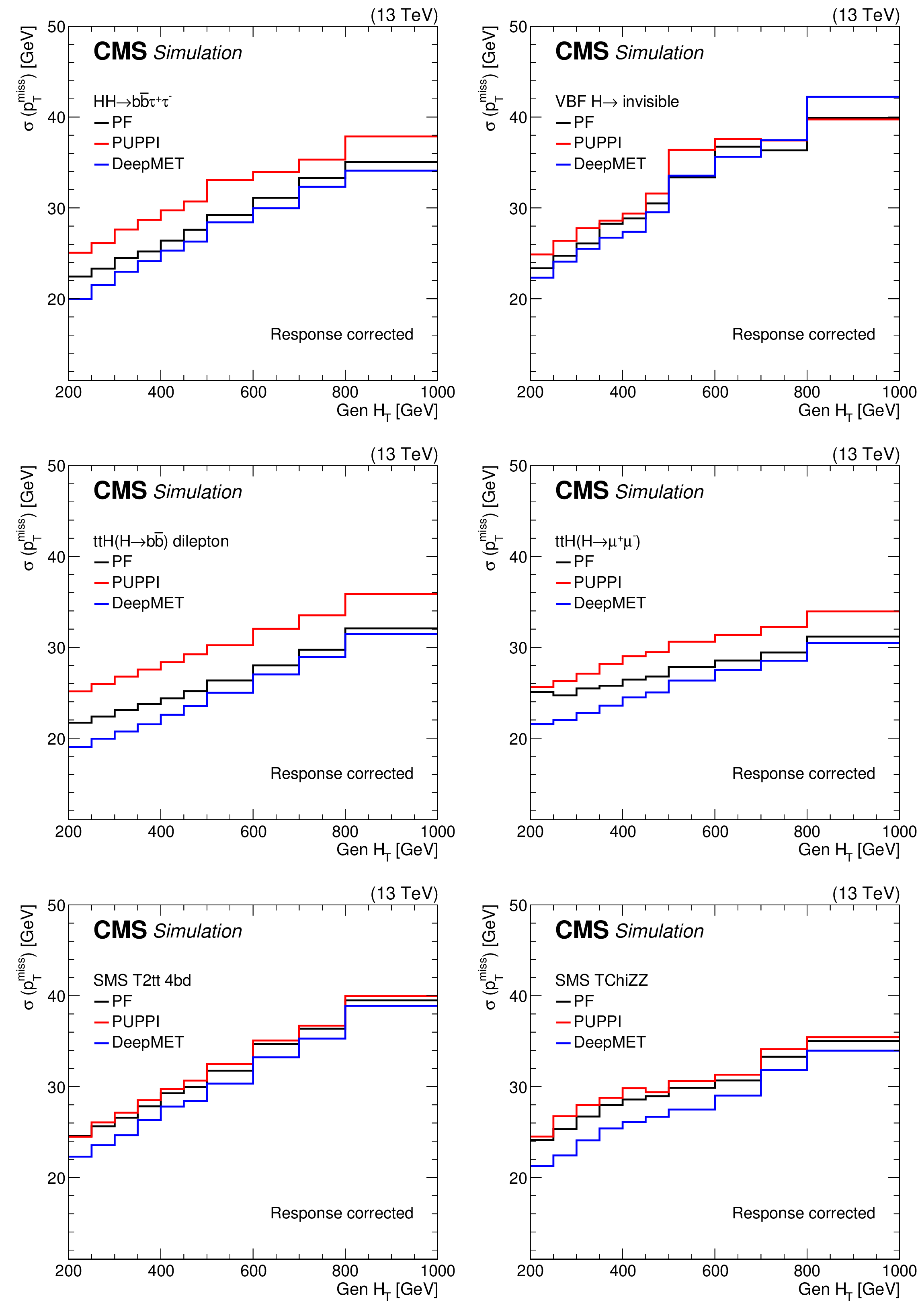 Comparison of $ p_{\mathrm{T}}^\text{miss} $ resolution for various physics processes in simulated events. The considered processes are HH production via gluon fusion with $ \mathrm{H}\mathrm{H}\to\mathrm{b}\mathrm{b}\tau\tau $ (upper left), H production via vector boson fusion with $ \mathrm{H}\to\text{invisible} $ (upper right), $ \mathrm{t}\mathrm{t}\mathrm{H} $ production with either $ \mathrm{H}\to\mathrm{b}\mathrm{b} $ (middle left) or $ \mathrm{H}\to\mu\mu $ (middle right), the SMS T2b-4bd process (lower left), and the SMS TChiZZ process (lower right). |
