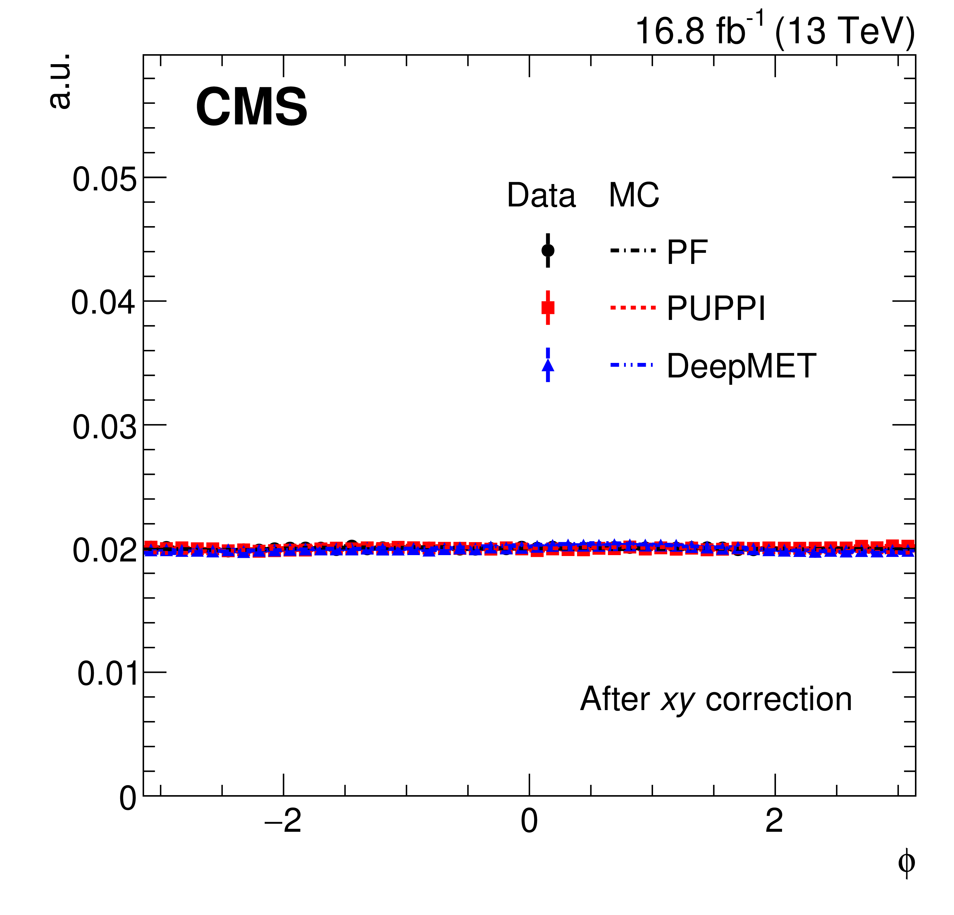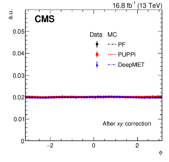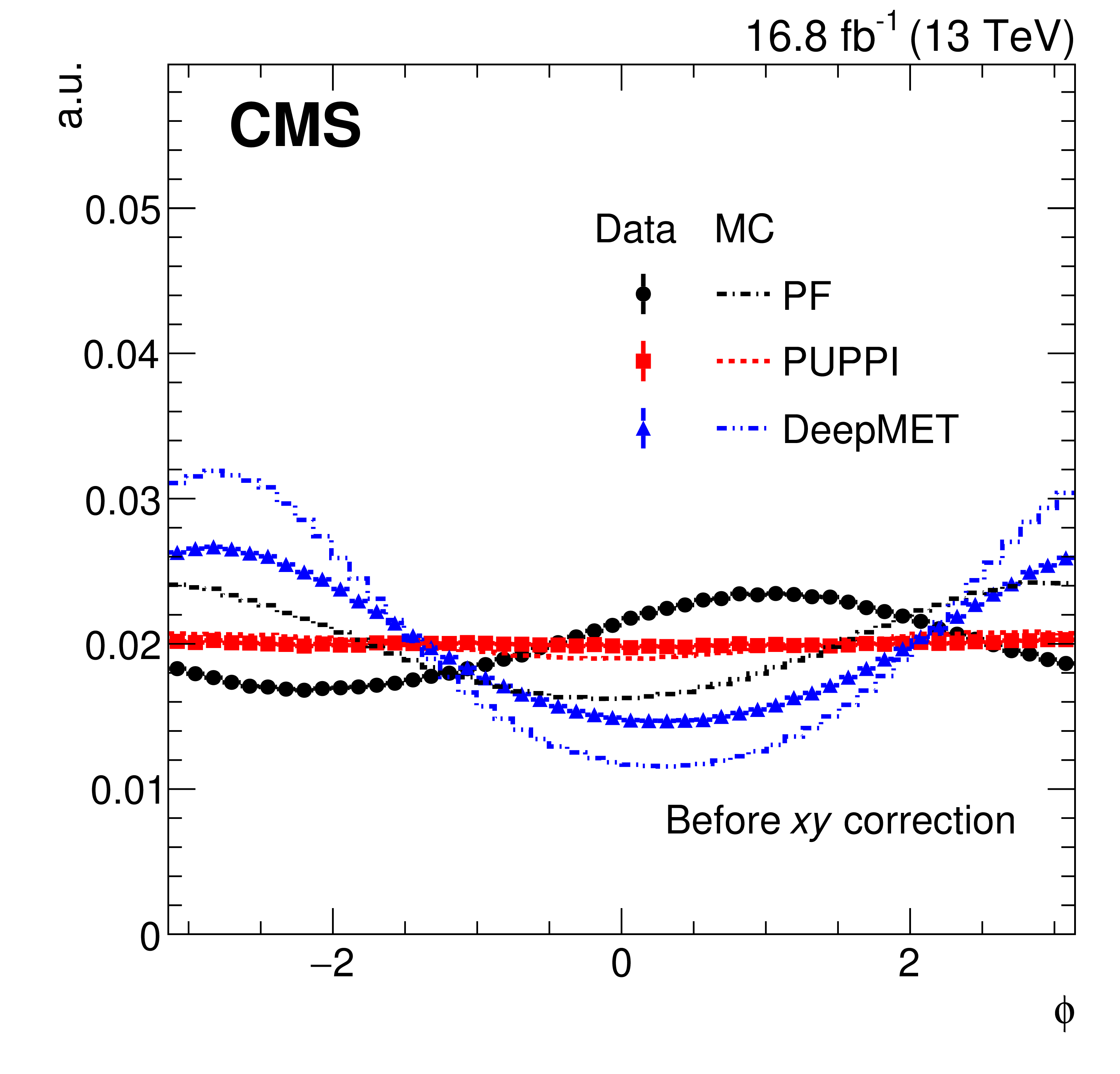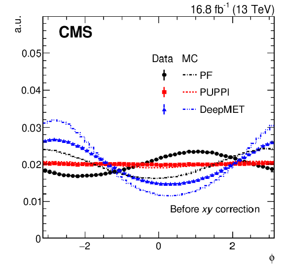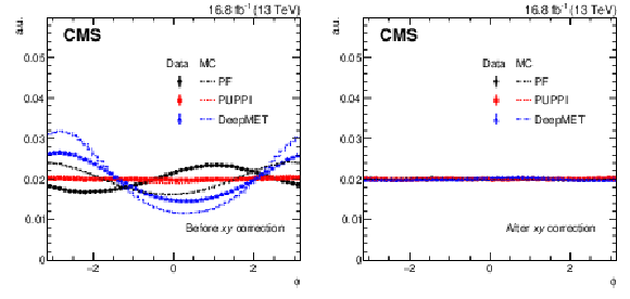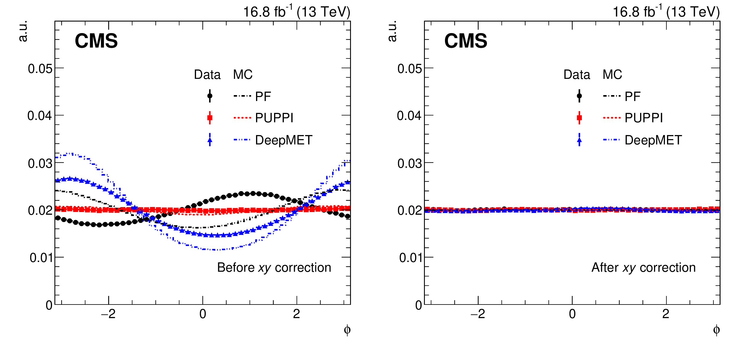 The $ \phi $ distribution of different $ {\vec p}_{\mathrm{T}}^{\, \text{miss}} $ estimators before (left) and after (right) the $ xy $ corrections, in data (markers) and MC simulations (dashed) after the $ \mathrm{Z}\to\mu\mu $ selections. |