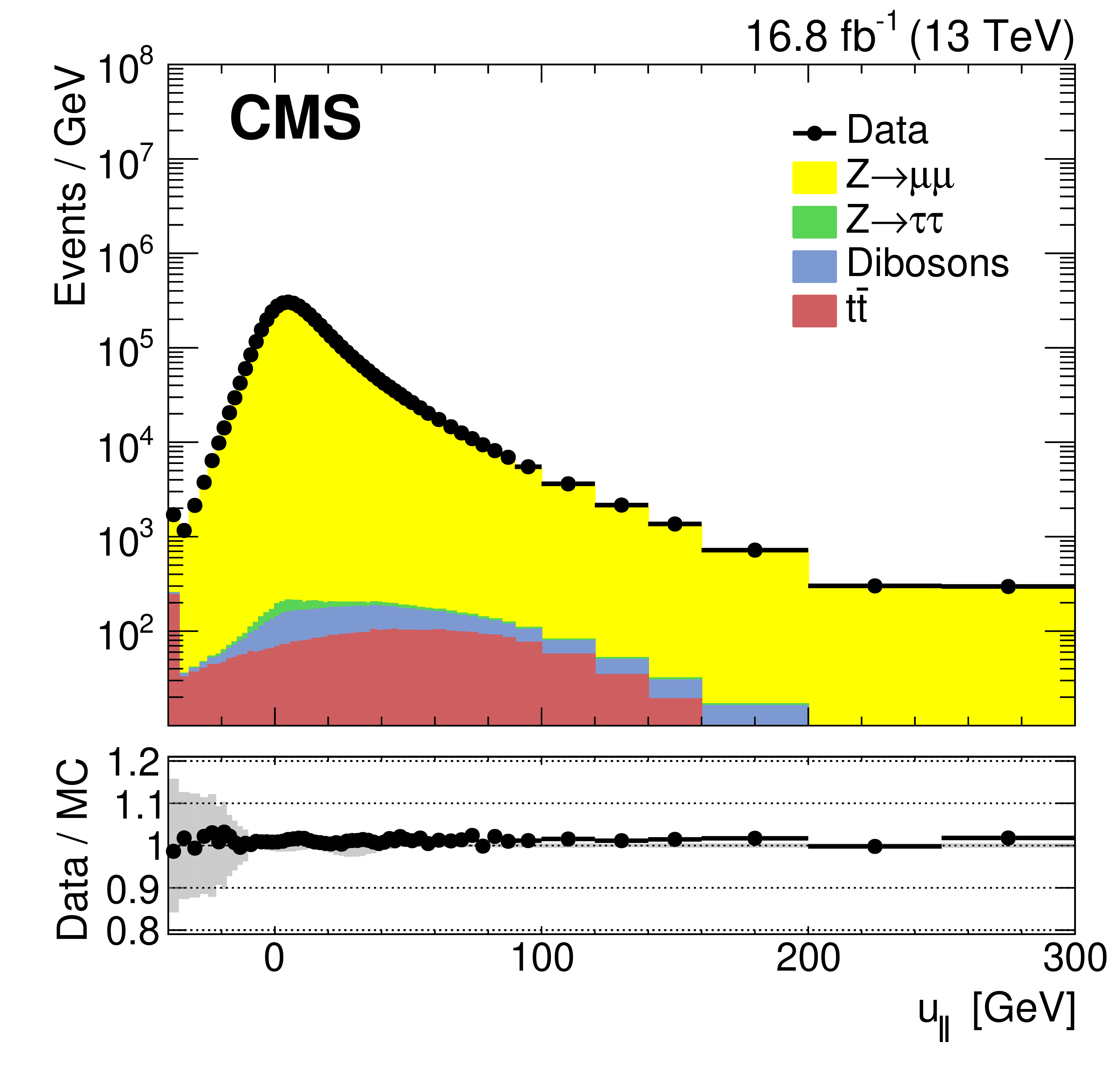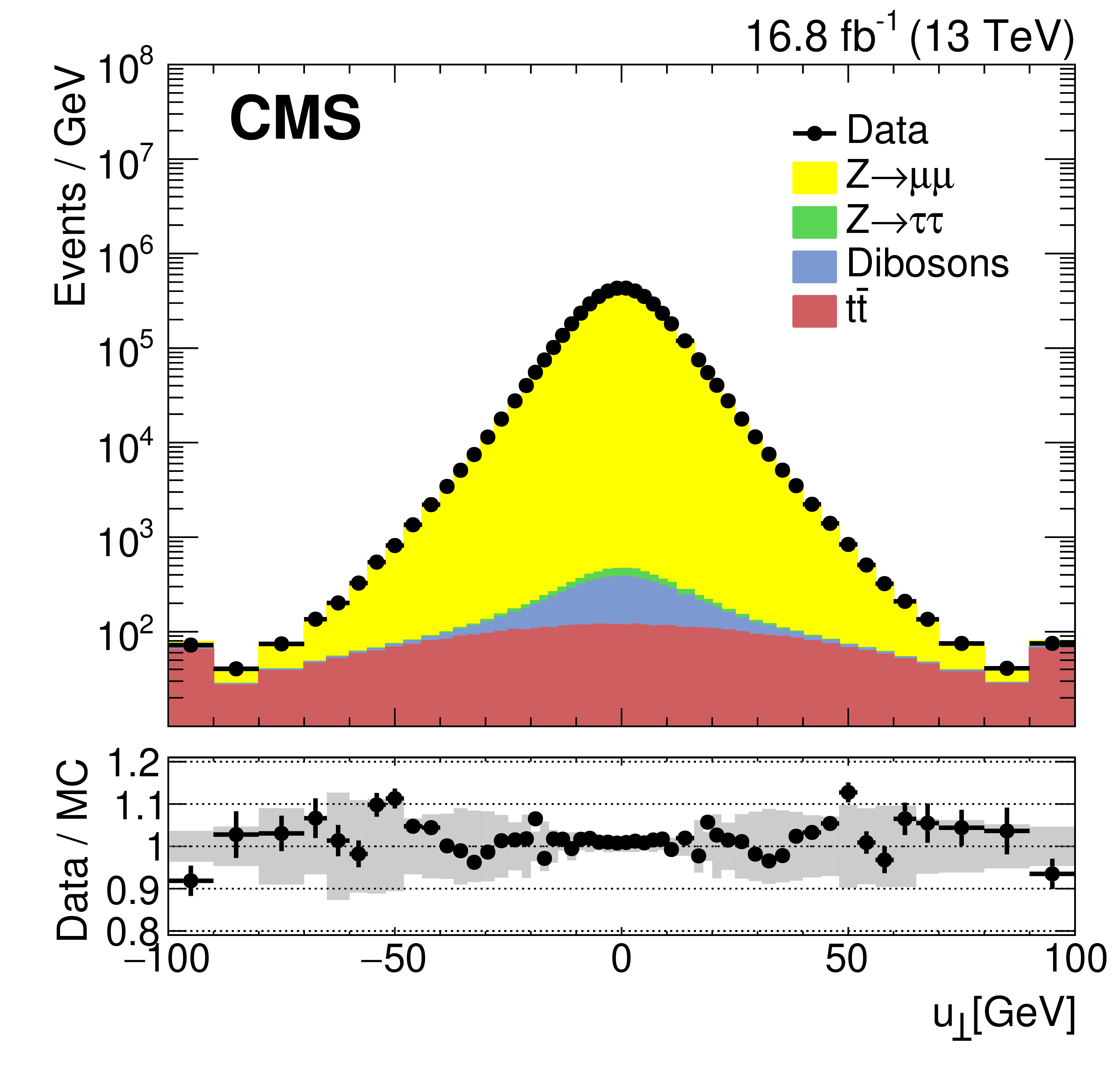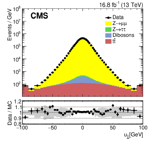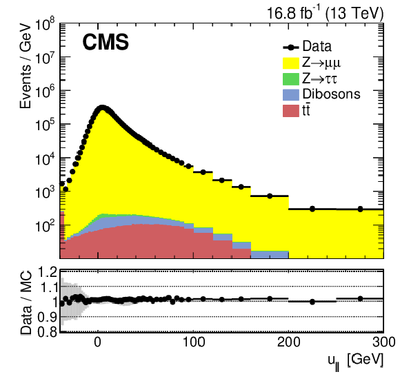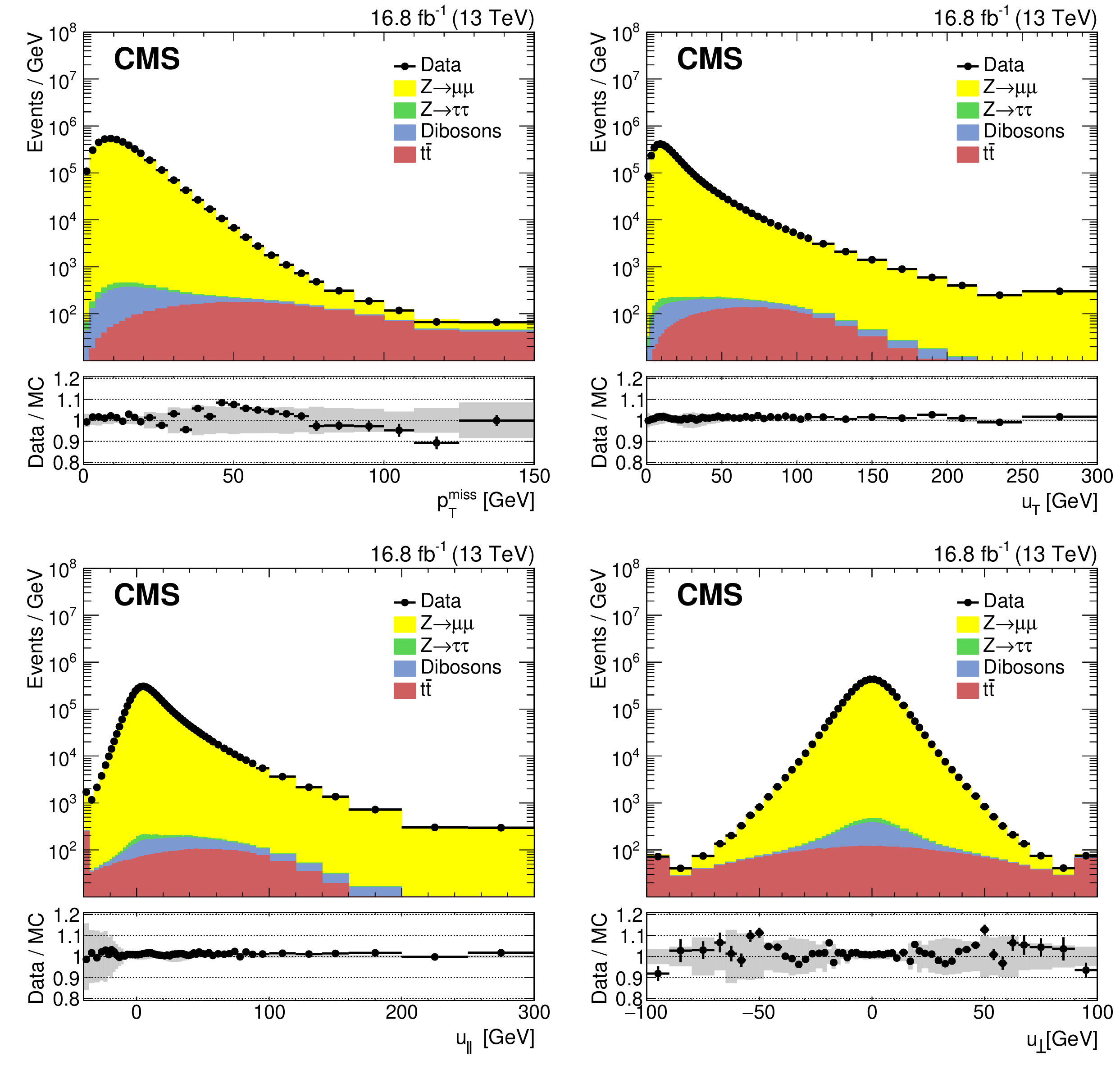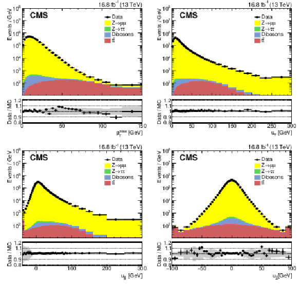 Data-to-simulation comparisons of DEEPMET $ p_{\mathrm{T}}^\text{miss} $ (upper left), recoil $ p_{\mathrm{T}} $ (upper right), $ u_{\parallel} $ (lower left), and $ u_{\perp} $ (lower right) after the quantile correction. The underflow (overflow) contents are included in the first (last) bin. The gray band represents the systematic uncertainties discussed in Section 8.4. |