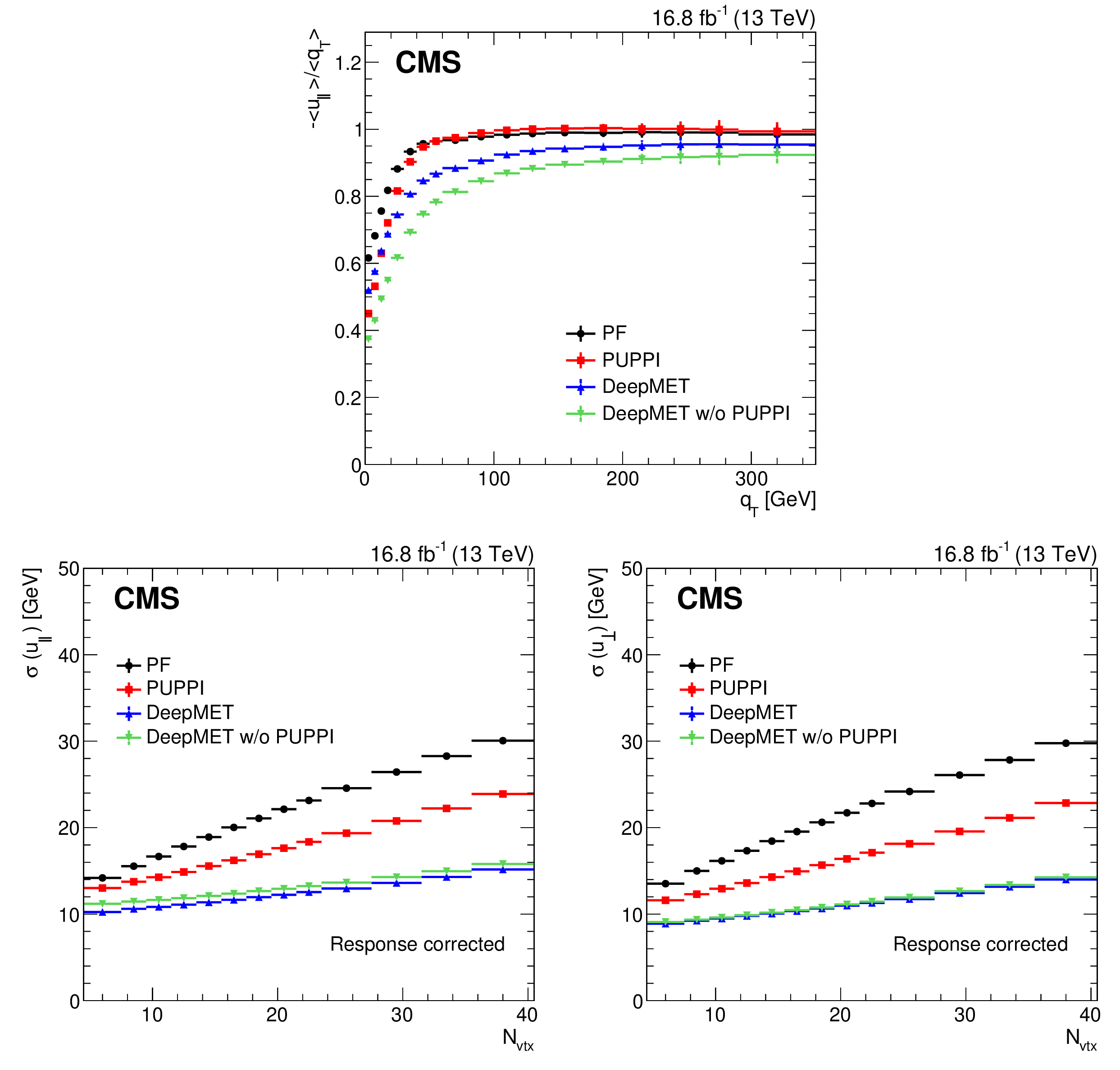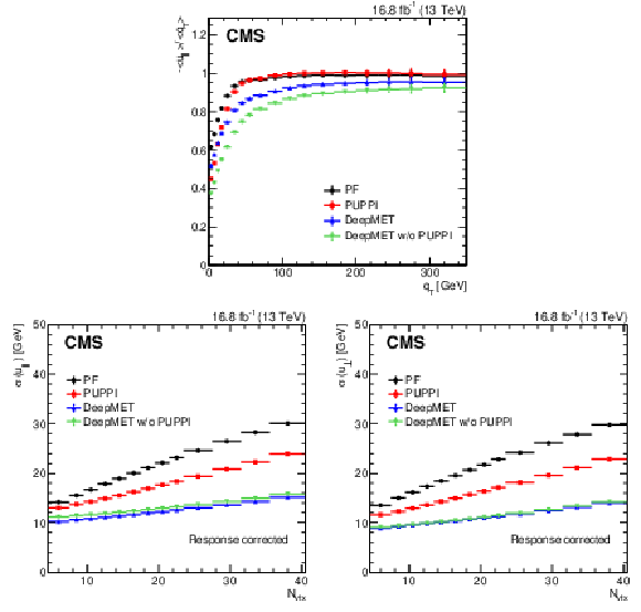 Response (upper) and response-corrected resolutions of $ u_{\parallel} $ (lower left) and $ u_{\perp} $ (lower right) of different $ {\vec p}_{\mathrm{T}}^{\, \text{miss}} $ estimators in data after the $ \mathrm{Z}\to\mu\mu $ selections. |