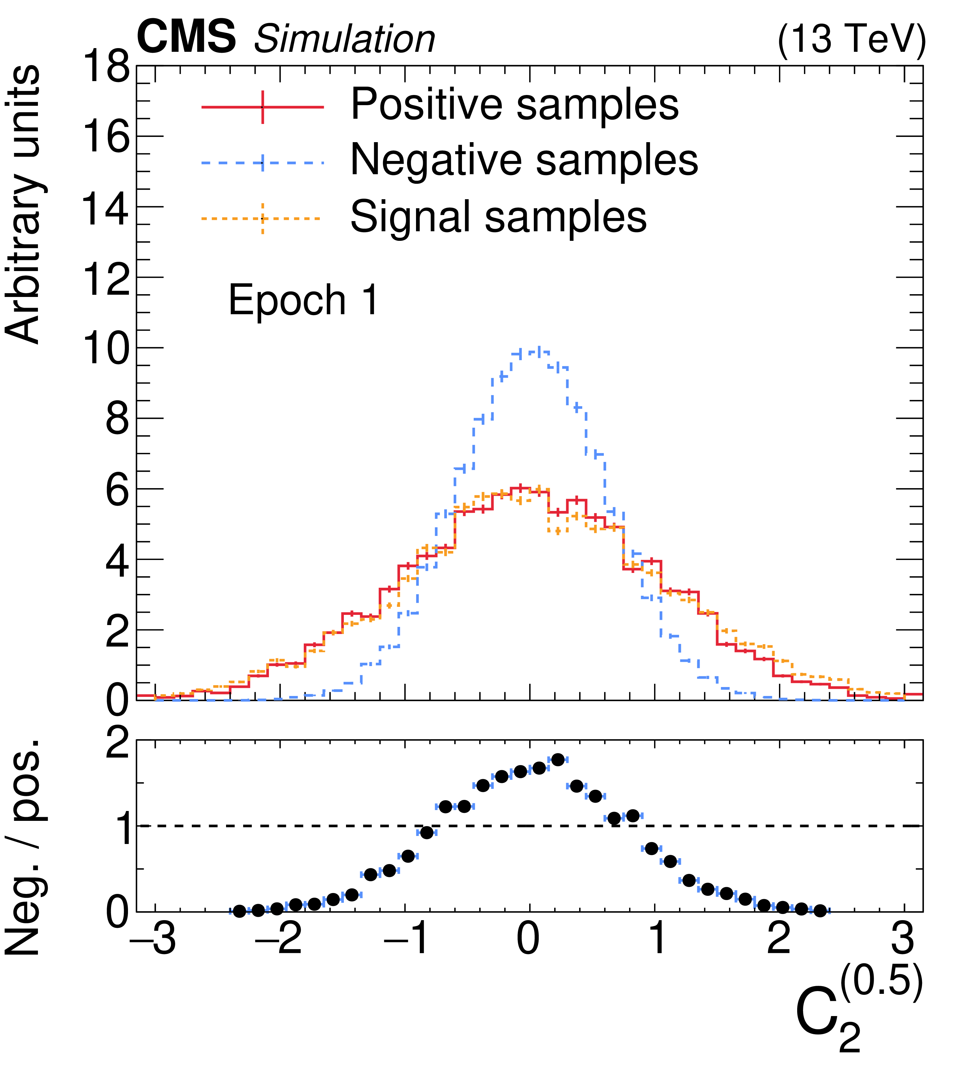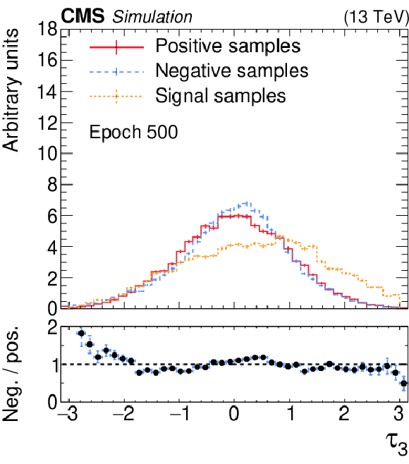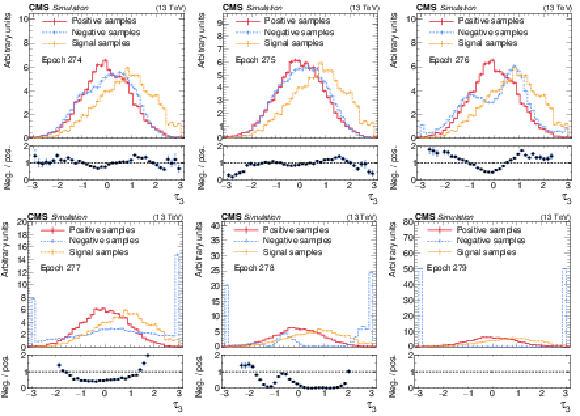 Distributions of the input feature $ \tau_{3} $ for positive, negative, and signal samples, before (epochs 274) and after (epochs 275--279) the start of the divergence of the NAE loss. The signal distributions are overlaid for illustration; signal samples are not used during the training. All distributions are normalized such that their integral is 100. |
