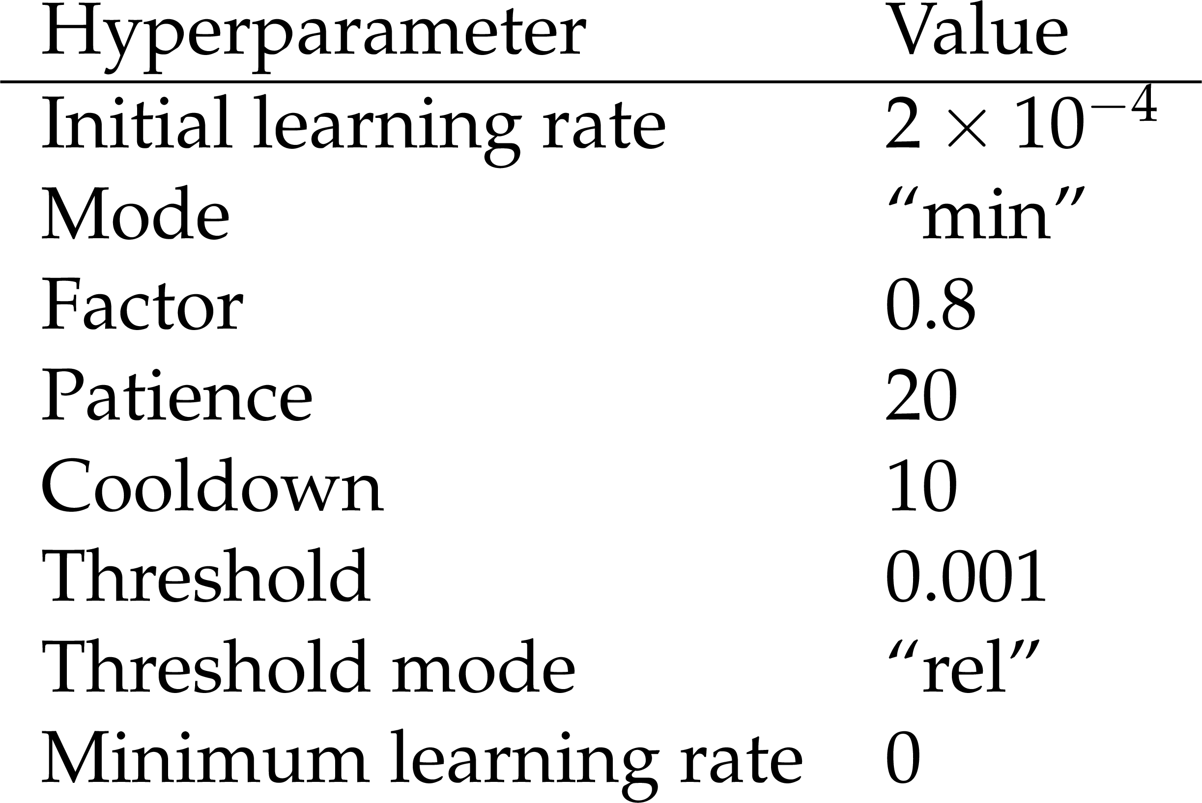 Left: the reconstruction error (upper panel) and the AUC scores (lower panel) for the AE trained on the $ \mathrm{t} \overline{\mathrm{t}} $ background, evaluated during each training epoch on $ \mathrm{t} \overline{\mathrm{t}} $ background jets and signal models with $ m_{\Phi} = $ 2000 GeV and $ r_{\text{inv}} = $ 0.3 (upper) or $ r_{\text{inv}} = 0.1, 0.3, 0.5, $ 0.7 (lower). Right: The AUC scores for the same AE, evaluated for the epoch with the minimal background reconstruction error, for the classification of several SVJ signal hypotheses against the $ \mathrm{t} \overline{\mathrm{t}} $ background. The AUC scores are close to 0.5, indicating that the AE is unable to discriminate between the SVJ signal and the $ \mathrm{t} \overline{\mathrm{t}} $ background. |