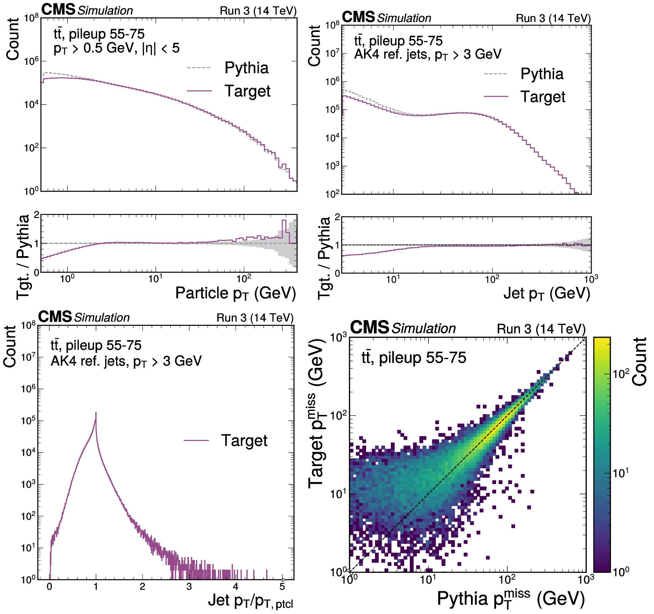 Validation of the MLPF particle-level target, after removing the contributions from the pileup particles, using $ \mathrm{t} \overline{\mathrm{t}} $ simulation with pileup. The $ p_{\mathrm{T}} $ distribution of target particles and truth particles derived from PYTHIA stable particles (upper left). The $ p_{\mathrm{T}} $ distribution of jets clustered from each particle set (upper right). The jet response relative to particle-level jets (lower left). The target $ p_{\mathrm{T}}^\text{miss} $ as a function of the PYTHIA truth $ p_{\mathrm{T}}^\text{miss} $ (lower right). The target particle set, after removing the contribution from pileup, generally aligns well with the pileup-free PYTHIA truth. |