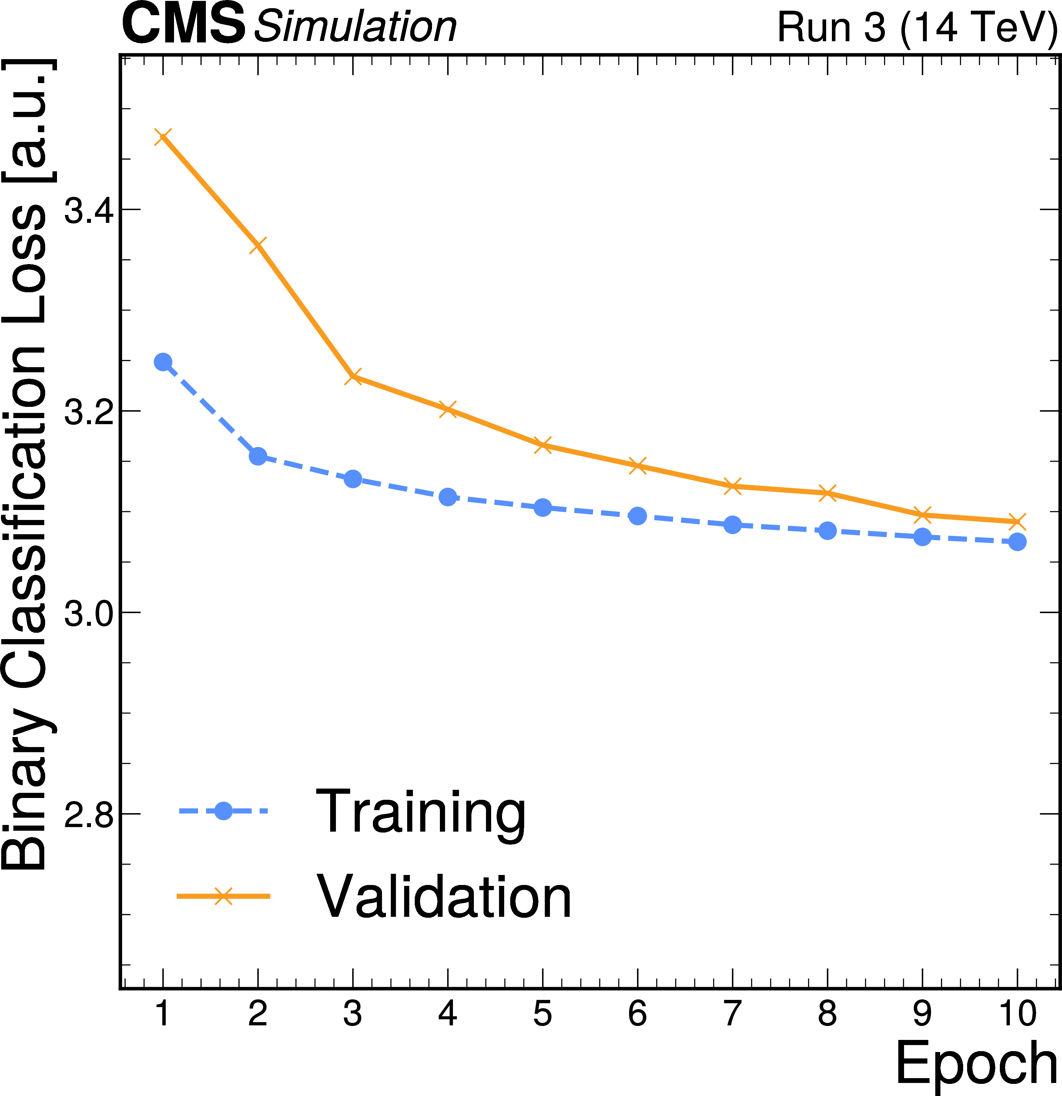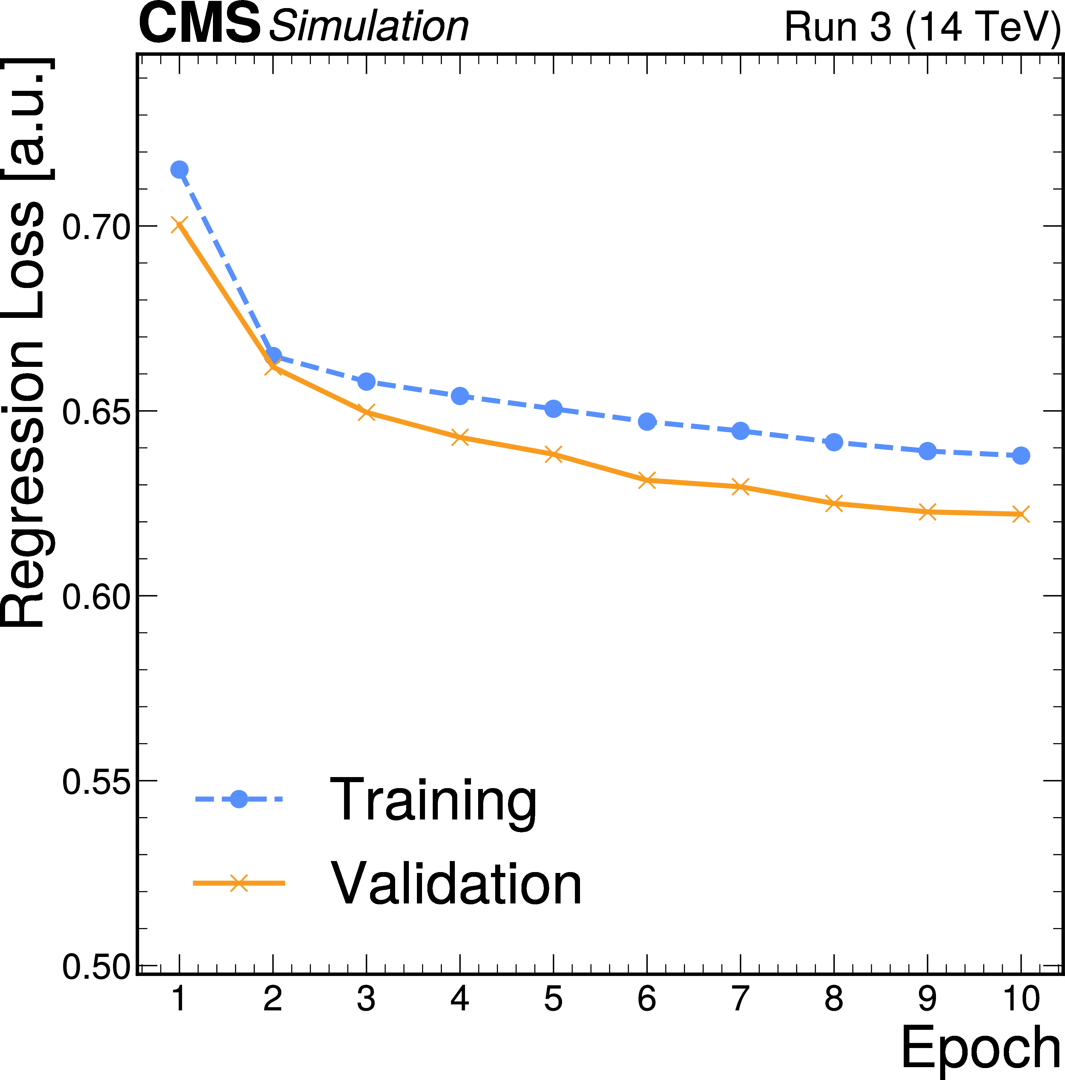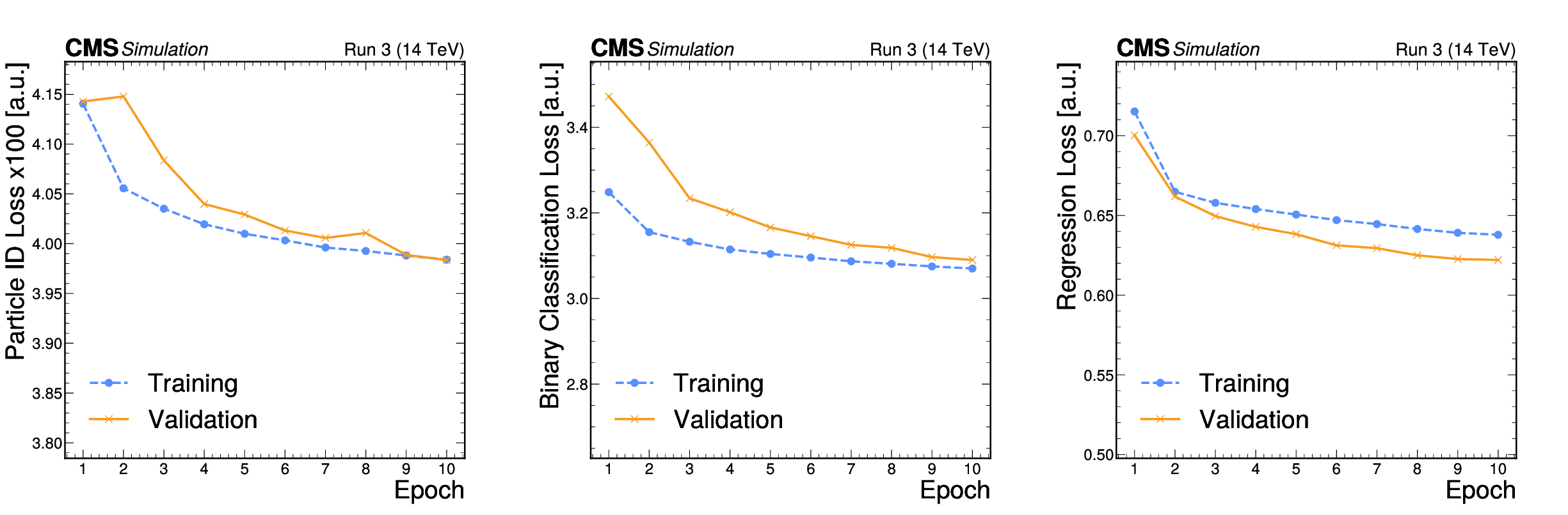 The PID, binary classification, and regression losses for the training and validation data sets, as a function of the training epoch. We observe both the training and validation losses to be smoothly converging. The training loss is evaluated with a partially-trained model throughout the training epoch on the training events (80%), while the validation loss is computed with the model weights at the end of the epoch on the validation events (20%). The losses are measured in arbitrary units, averaged across the events. |