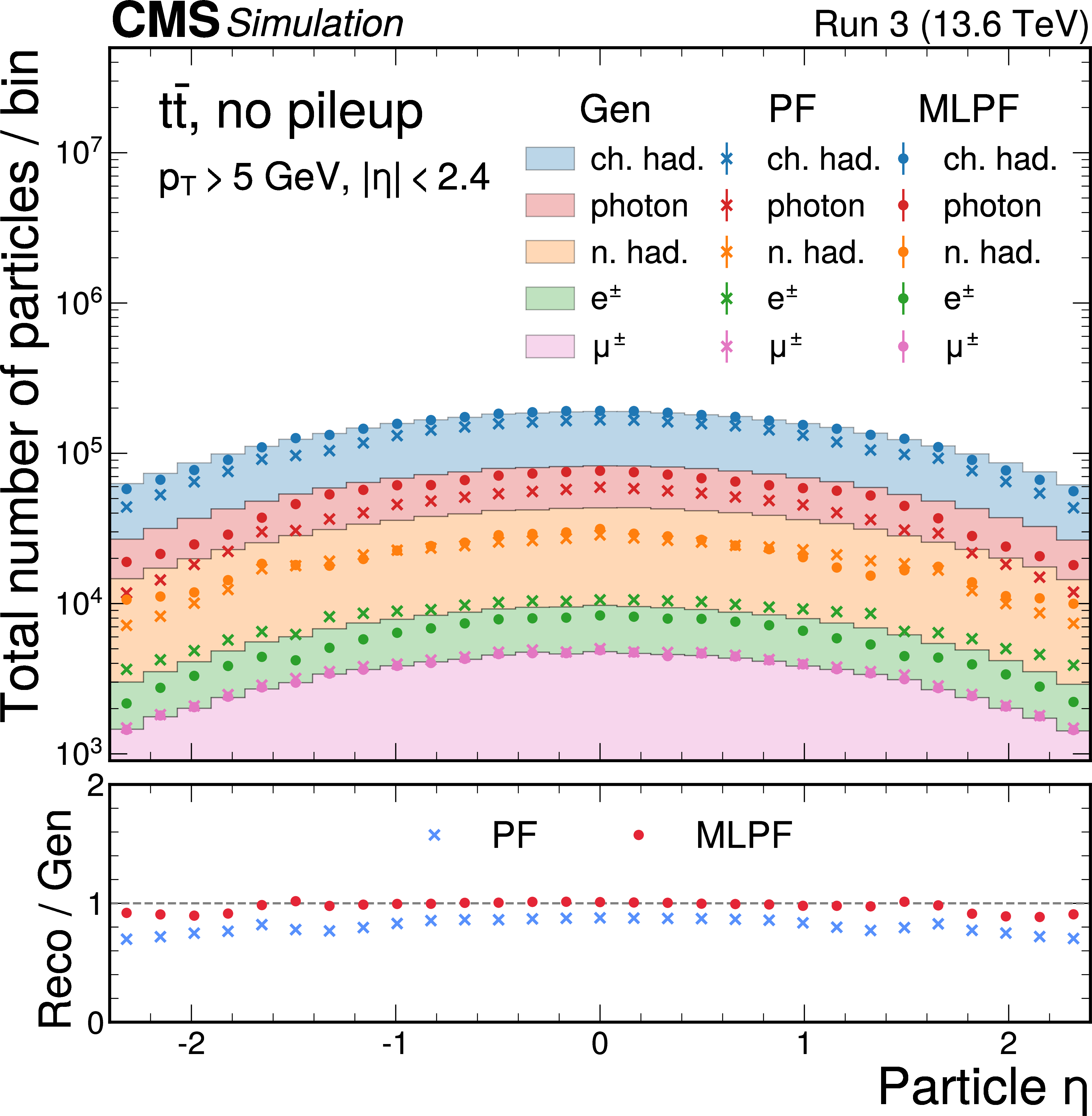 The particle $ p_{\mathrm{T}} $ (left) and $ \eta $ (right) distributions split by PID for MC particles (Gen), and PF and MLPF candidates in $ \mathrm{t} \overline{\mathrm{t}} $ events. In the forward region, the PF and MLPF algorithms do not attempt to identify particles, but instead reconstruct the deposits as either electromagnetic or hadronic. |