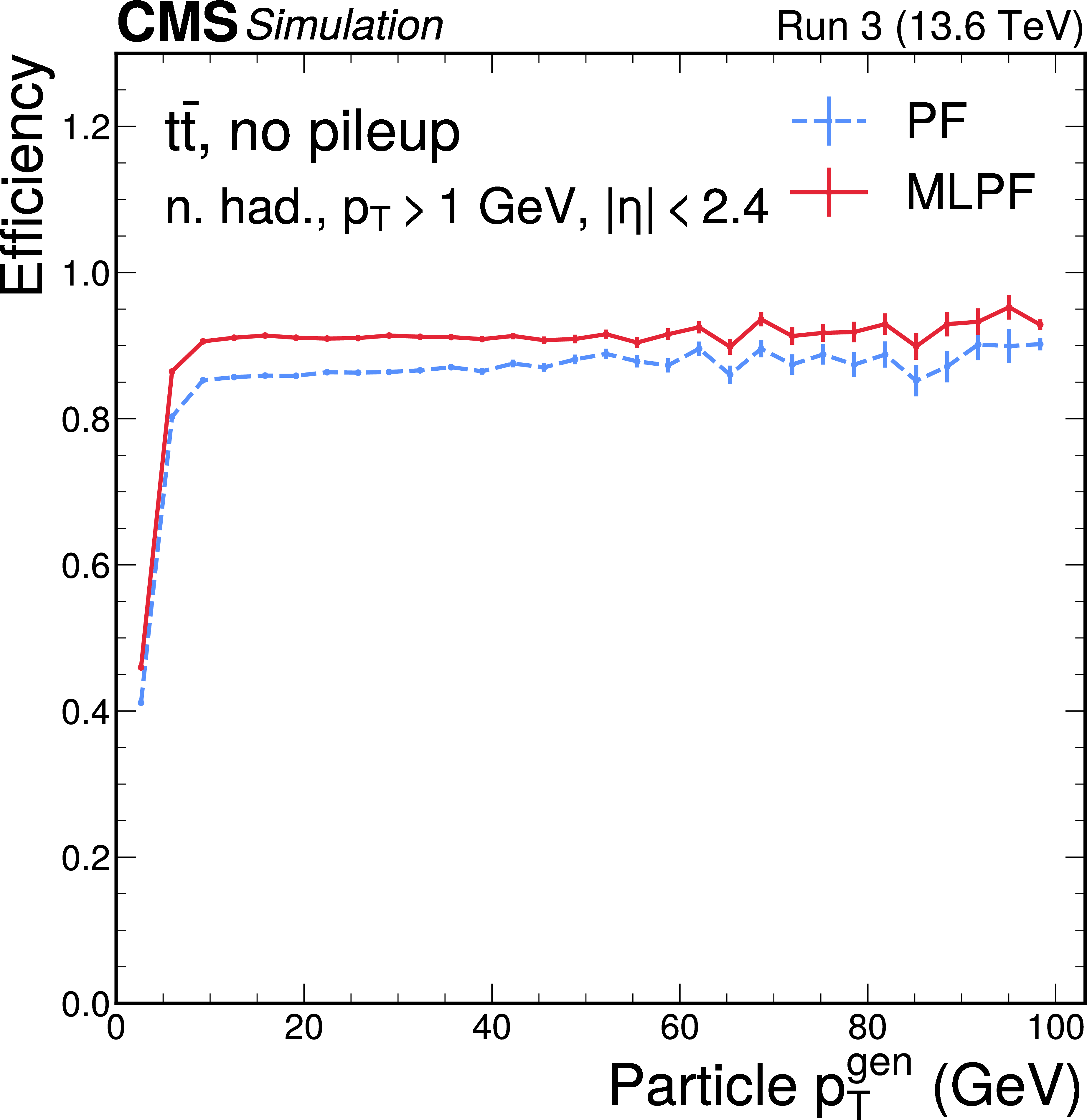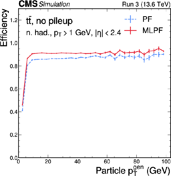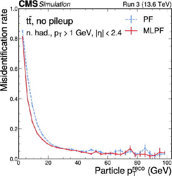 Neutral hadron efficiency (left) and misidentification rate (right) as functions of $ p_{\mathrm{T}} $ for PF (blue) and MLPF (red) in $ \mathrm{t} \overline{\mathrm{t}} $ events based on $ \Delta R $ matching to generator-level particles. The MLPF algorithm generally has higher efficiency at a lower misidentification rate. The vertical bars indicate the statistical uncertainties on the respective distributions. |