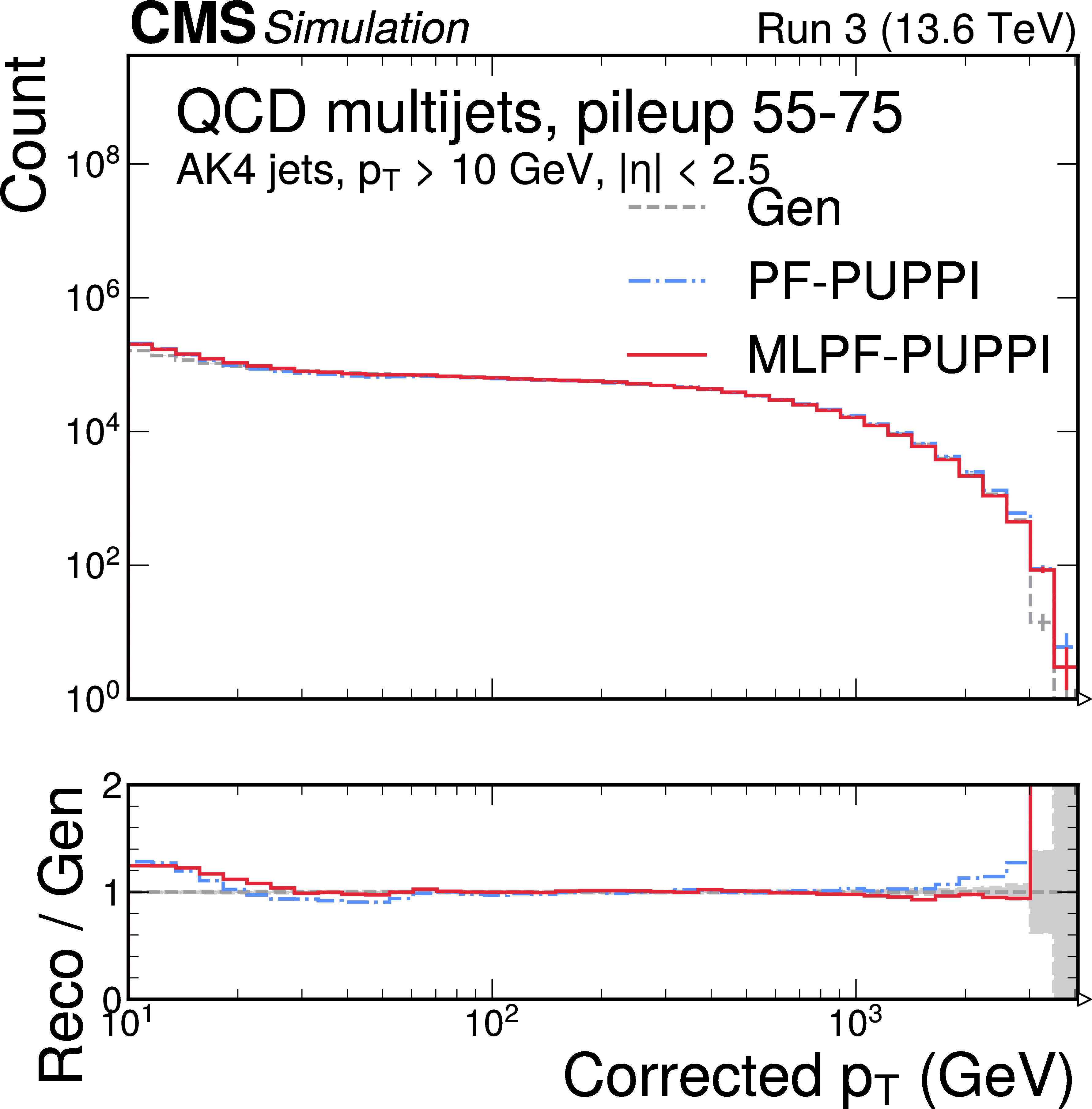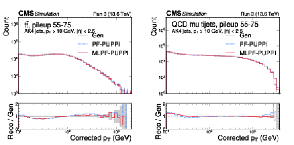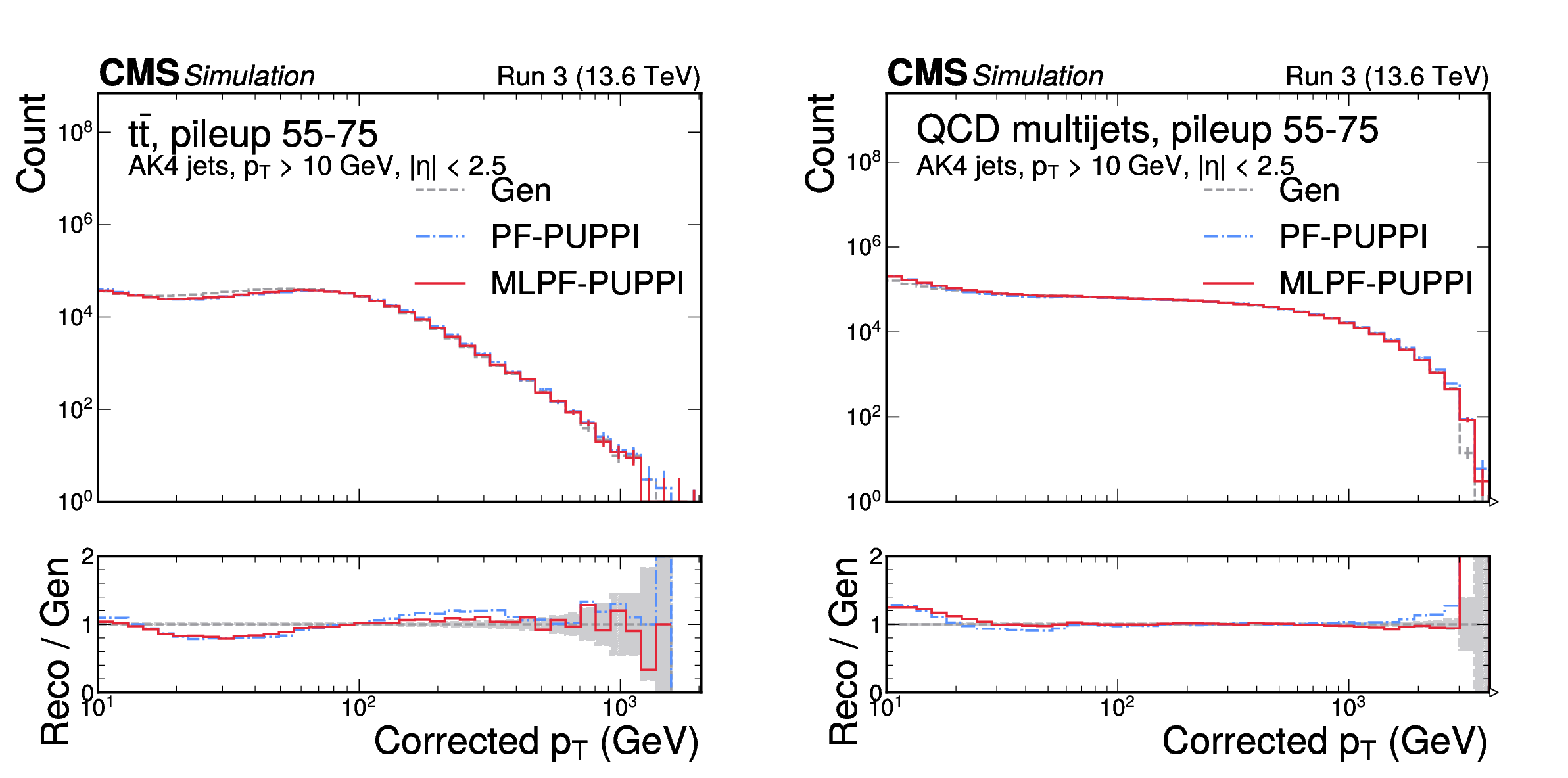 The corrected jet $ p_{\mathrm{T}} $ distribution in $ \mathrm{t} \overline{\mathrm{t}} $ (left) and QCD multijet (right) validation samples with 55--75 pileup interactions. MLPF is only trained to reconstruct particles, and is never explicitly optimized to reconstruct jets. The PUPPI algorithm is applied to both PF and MLPF jets to perform pileup subtraction. We show the jet $ p_{\mathrm{T}} $ distribution after simulated response calibration. The shaded bands indicate the statistical uncertainties on Gen. |