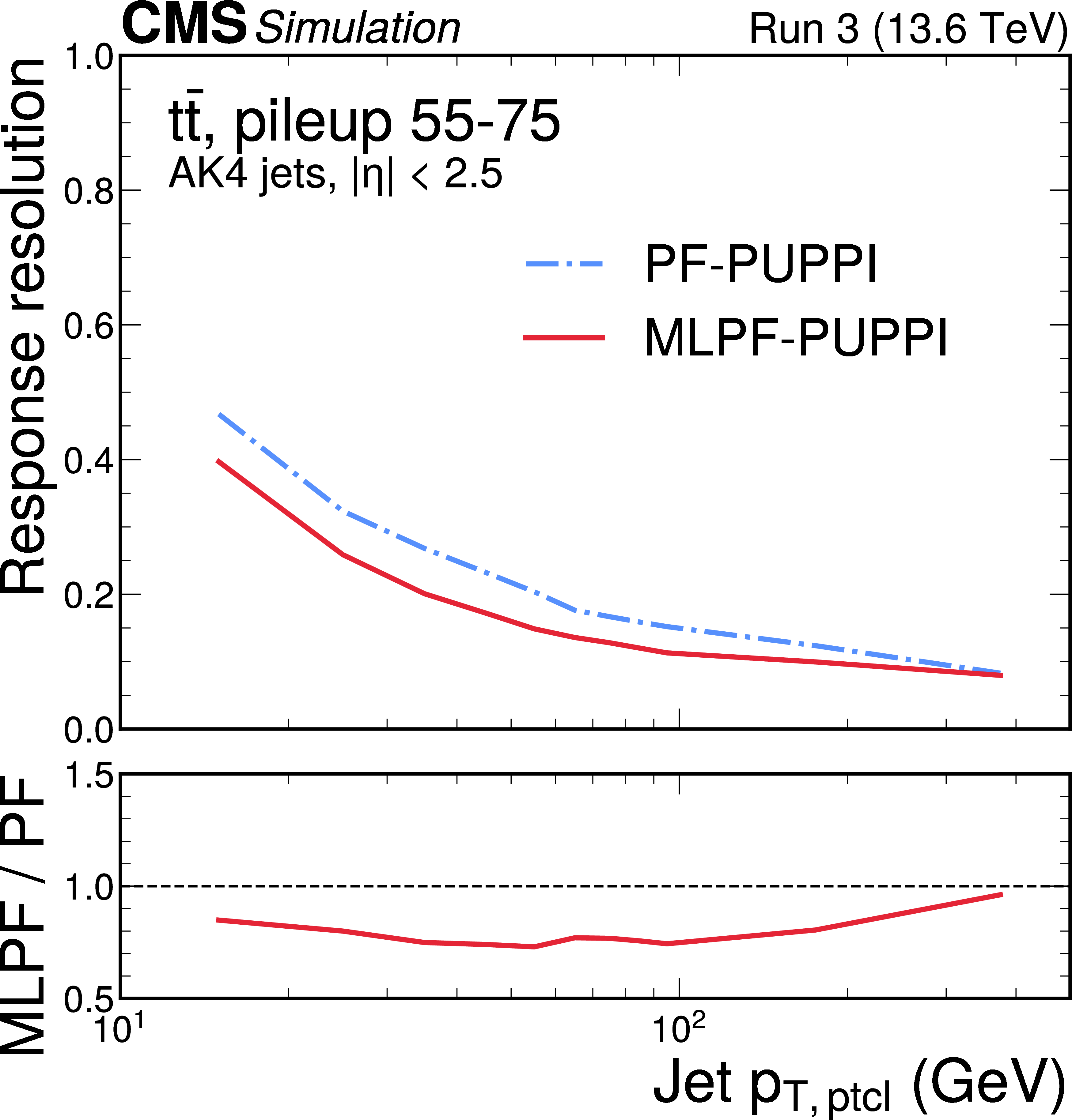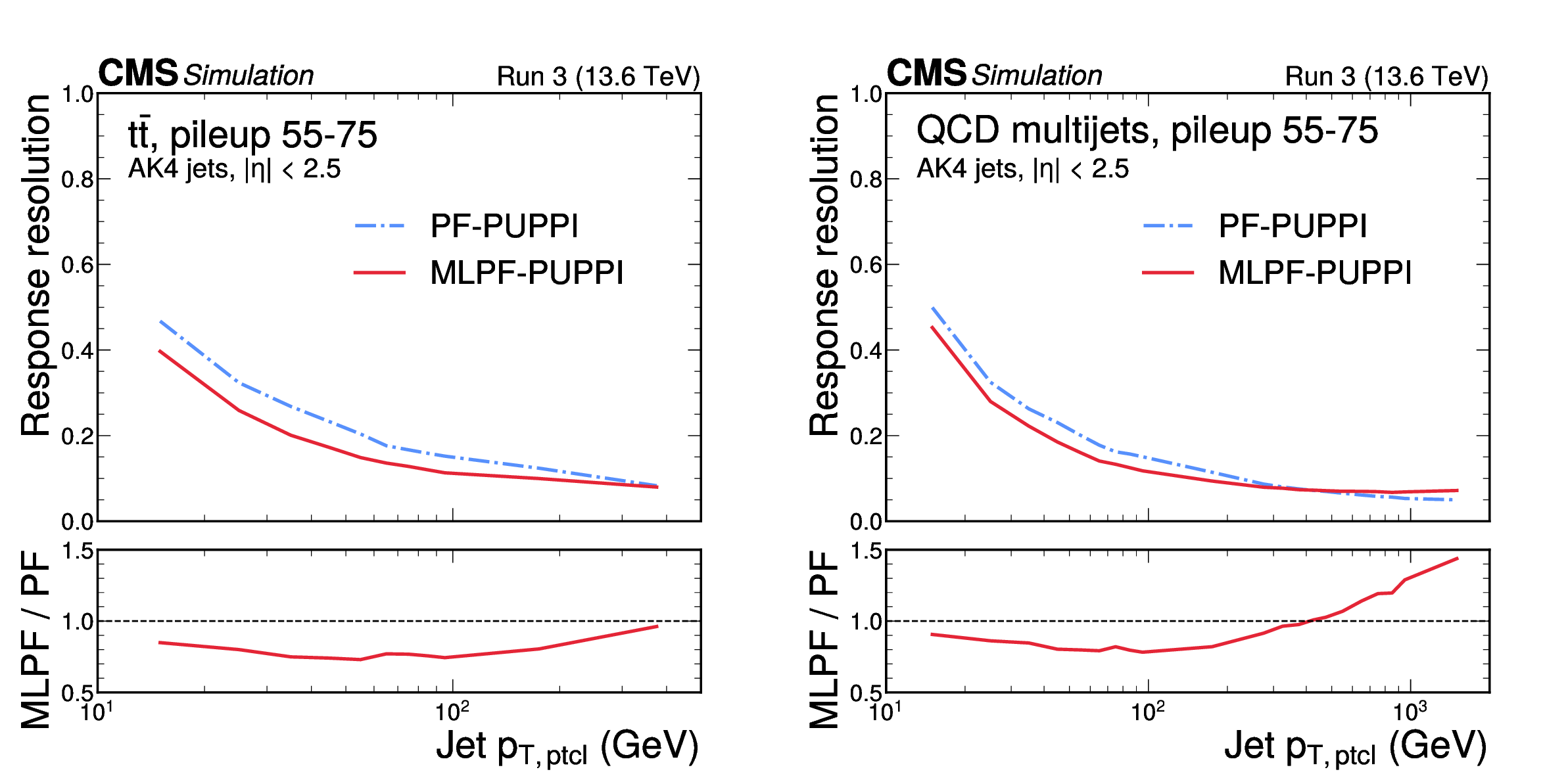 The jet resolution in $ \mathrm{t} \overline{\mathrm{t}} $ (left) and QCD multijet (right) validation samples with 55--75 pileup interactions, after simulated response calibration. The MLPF algorithm is only trained to reconstruct particles, and is never explicitly optimized to reconstruct jets. The PUPPI algorithm is applied to both PF and MLPF jets to perform pileup subtraction. The jet resolution is parameterized by fitting a Gaussian distribution and dividing the best-fit standard deviation by the mean, showing the bin midpoints on the horizontal axis. |