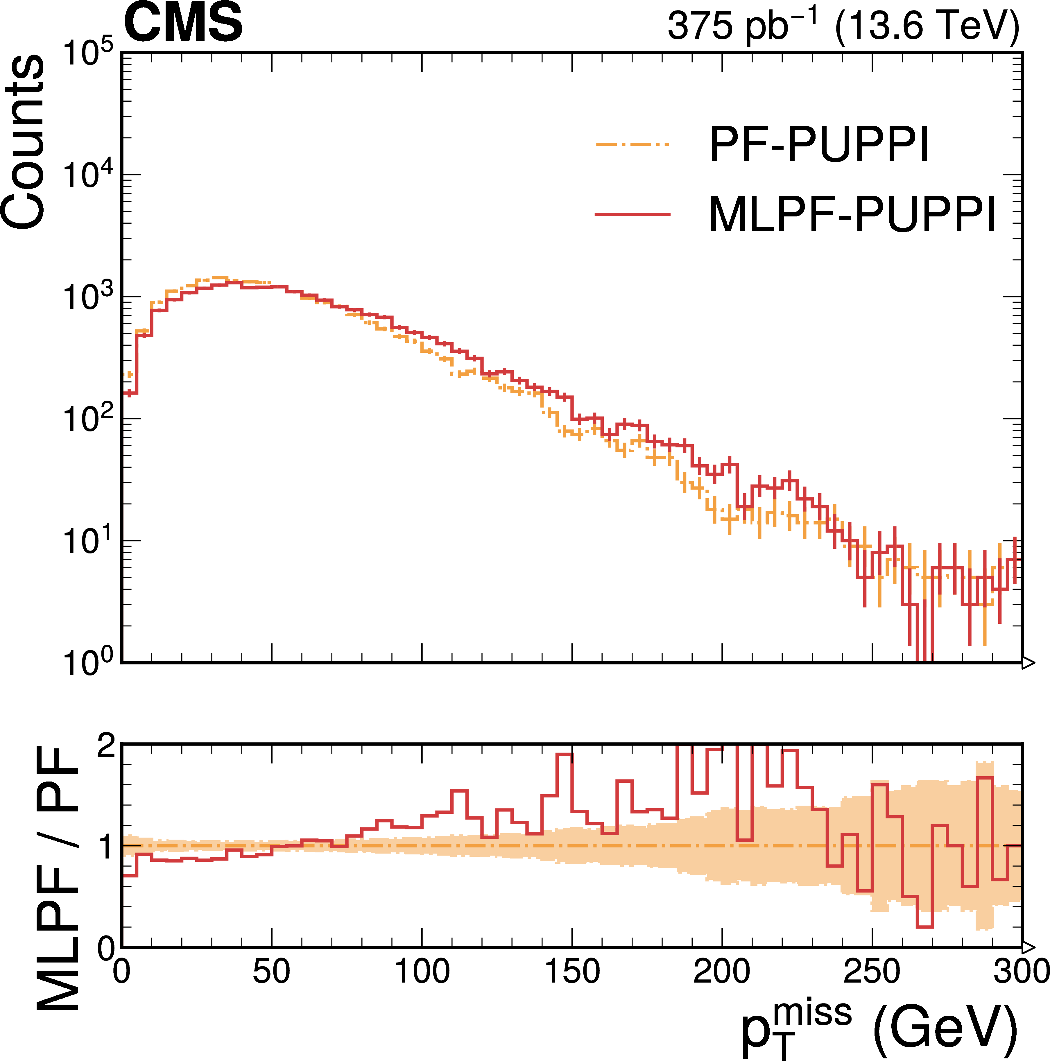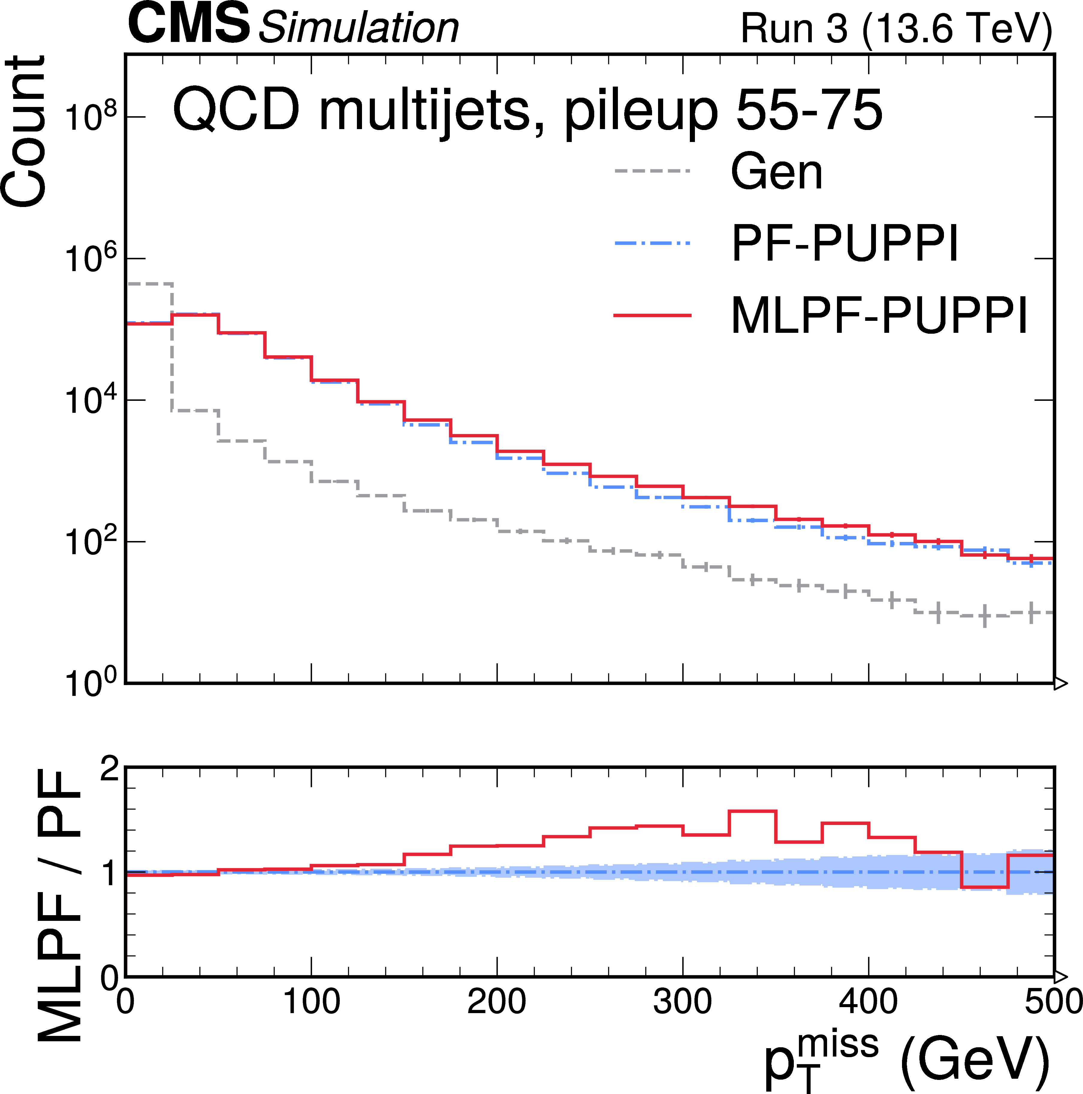 Uncalibrated $ p_{\mathrm{T}}^\text{miss} $ in $ \mathrm{t} \overline{\mathrm{t}} $ (left) and QCD multijet (right) samples with pileup from offline reconstruction using PF and MLPF. The MLPF algorithm is only trained to reconstruct particles, and is never explicitly optimized to reconstruct $ p_{\mathrm{T}}^\text{miss} $. The $ p_{\mathrm{T}}^\text{miss} $ distributions from PF and MLPF are found to be generally consistent, with MLPF reconstructing a somewhat harder $ p_{\mathrm{T}}^\text{miss} $ spectrum in the tails. The vertical bars indicate the statistical uncertainties on the respective distributions, and the shaded bands in the ratio panel indicate the statistical uncertainties on PF. |