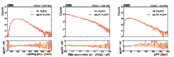 Distributions of the leading jet $ p_{\text{T,corr}} $ (left), the dijet asymmetry (center), and $ p_{\mathrm{T}}^\text{miss} $ (right) in a small sample of dijet data collected in Run 3. The distributions are largely compatible. The vertical bars indicate the statistical uncertainties on the respective distributions, and the shaded bands in the ratio panel indicate the statistical uncertainties on PF. |