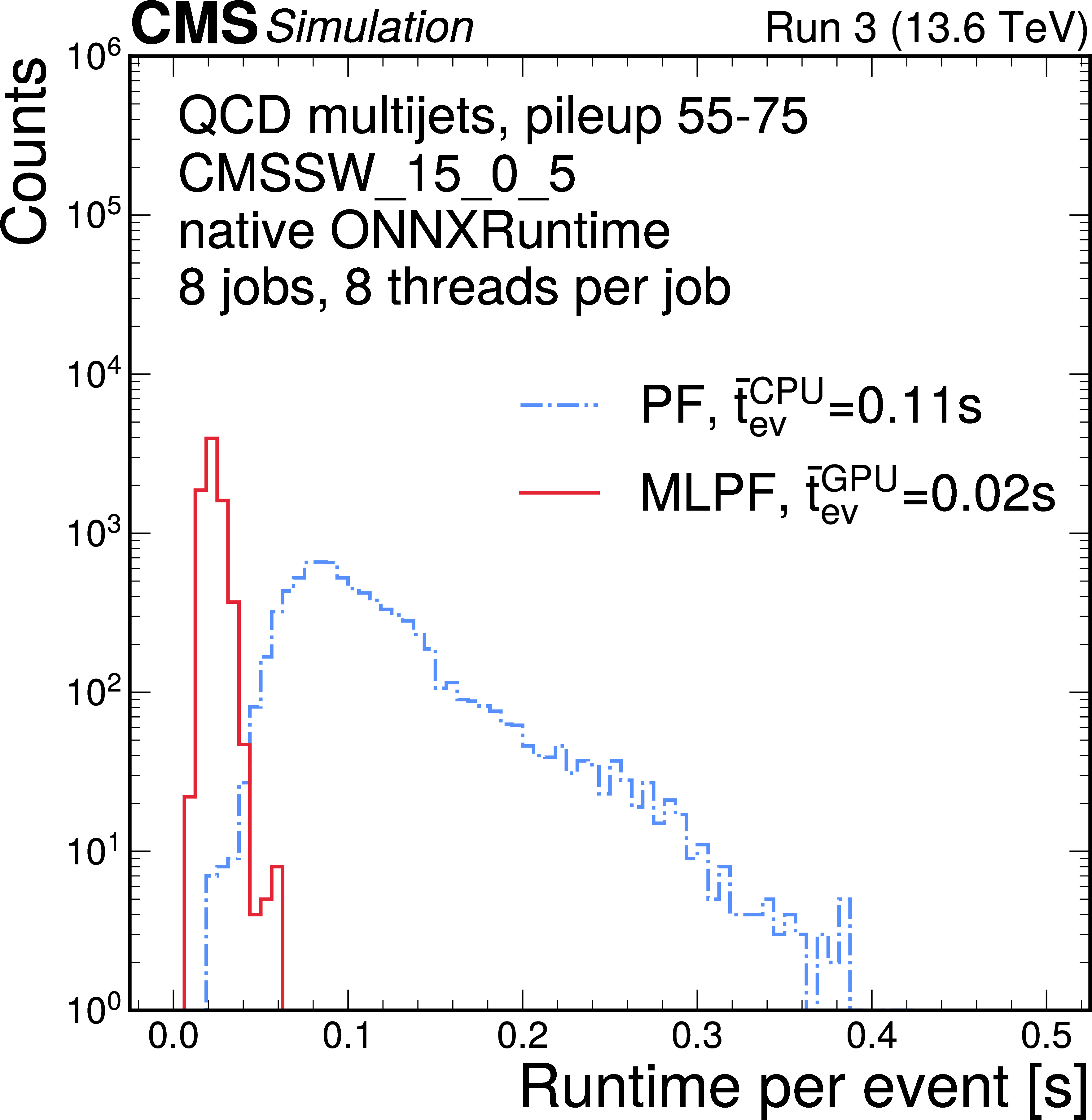 The runtime of the baseline particle-flow reconstruction compared to the MLPF inference, directly within the CMS offline software using the native ONNXRUNTIME on GPU. |
