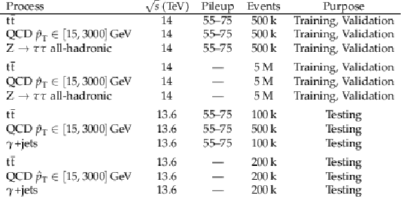 Monte Carlo simulation samples used for optimizing, validating, and testing the model. The training and validation samples are divided using an 80%/20% split, respectively. The symbols $ \text{---} $ in the 3rd column represent samples generated without pileup. |