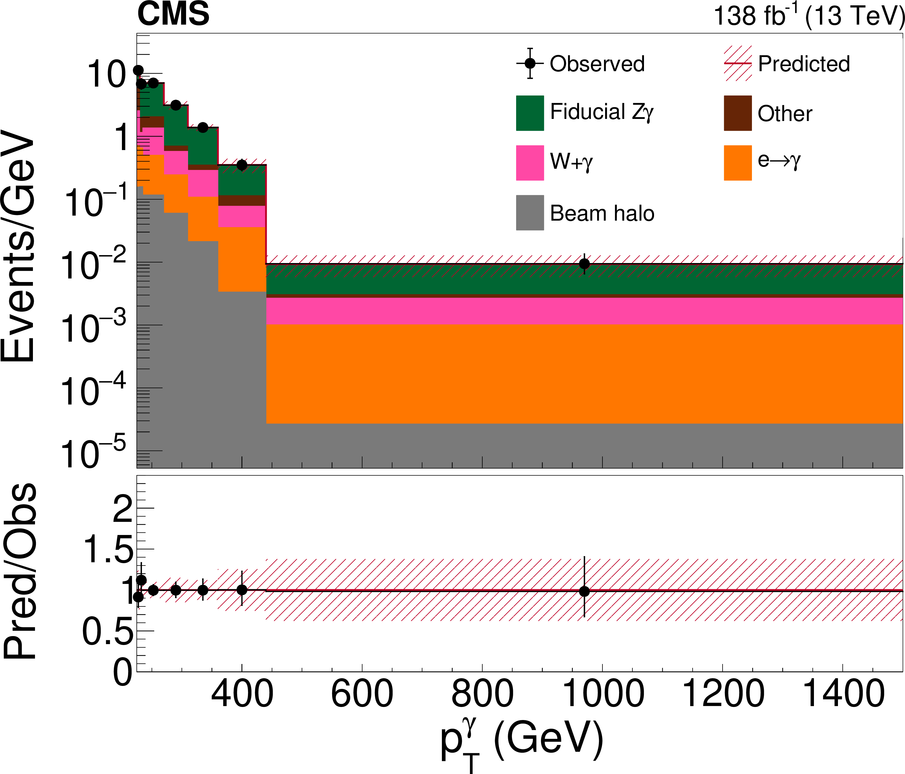 Post-fit event yields in the photon-$ p_{\mathrm{T}} $ spectrum for the combined phase space. These numbers are extracted after a simultaneous fit to the data in the signal and control regions. The ``others'' background include contributions from $ \text{nonfiducial} \mathrm{Z}(\nu\overline{\nu})\gamma $, $ \mathrm{Z}/\gamma^{\ast}(\ell^+\ell^-)\gamma $, $ {\mathrm{t}\overline{\mathrm{t}}} \gamma $, $ \mathrm{W}\mathrm{V}\gamma $, single-t+$ \gamma $, VV, single-W, and jet misidentified as a photon. |
